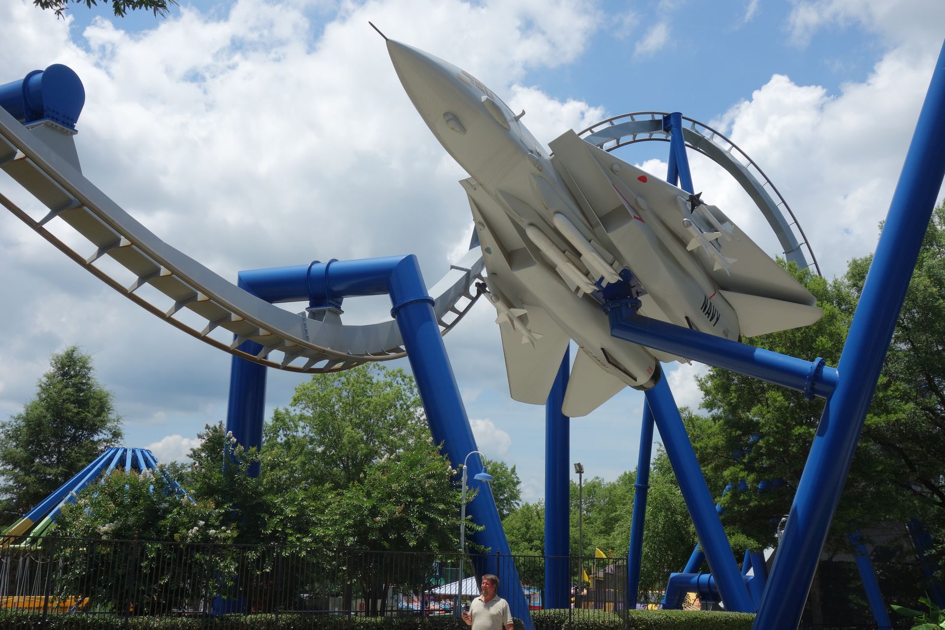 Das sind wirklich gute und intensive 900 Streckenmeter, die hier den Weg vom Hintereingang des Parks säumen. Und das Kampfjet-Thema (ehemals Top Gun) passt auch wirklich besser dazu als das wohl zunächst mal angedachte Godzilla-Theming. Ein Glück, dass der Film offenbar nicht sooo erfolgreich war.