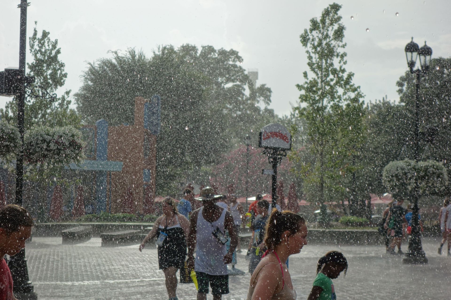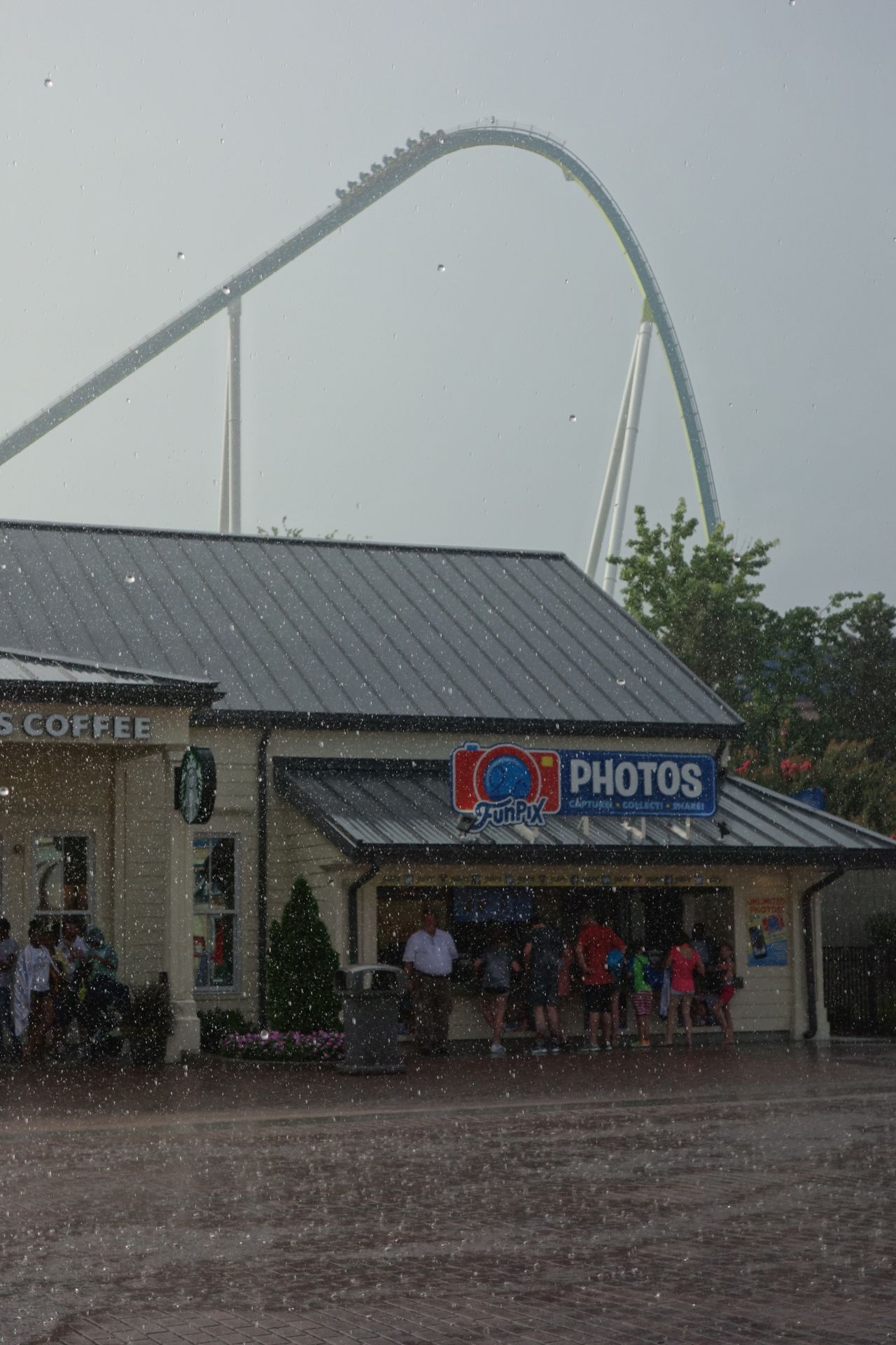 B&M-Flyer jetzt den Vorteil gehabt, dass der Wagen in Lift und Schlussbremse als Dach fungiert hätte. So waren wir dem Regen über weite Strecken schutzlos ausgeliefert. Und das ausgerechnet in einem Cedar Fair Park. Ich war fast schon geschockt, das ließ die völlige Durchnässung quasi in Vergessenheit geraten. Trotzdem verkrochen wir uns im Anschluss lieber mal in einem der nahen Shops.