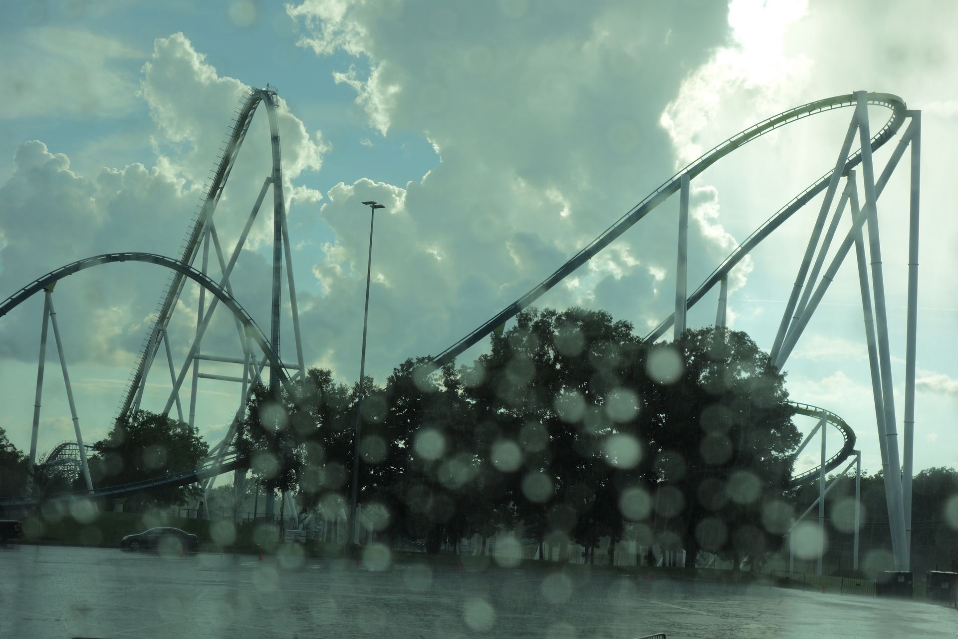 Ein drittes Vordrängel-Zettelchen ärmer platzierten wir uns diesmal in der letzten Reihe. Wir hatten gerade Platz genommen und die Ride-Ops kontrollierten die Bügel, als ich ein deutliches Rauschen vernahm. Ein Blick an den Wartenden vorbei bestätigte: Es schüttete nun wie aus Eimern. Das war es dann wohl, gleich würde man sich vermutlich entschuldigen und uns wieder aussteigen lassen. Immerhin hatte man den Betrieb so lange wie möglich aufrecht erhalten. Doch zu meiner Überraschung wurden wir plötzlich auf den Rücken gelegt und mit einem freundlichen "Enjoy your Ride!" wurden wir in den strömenden Regen hinausgeschickt, als wäre es das Normalste der Welt. Da hätte ein