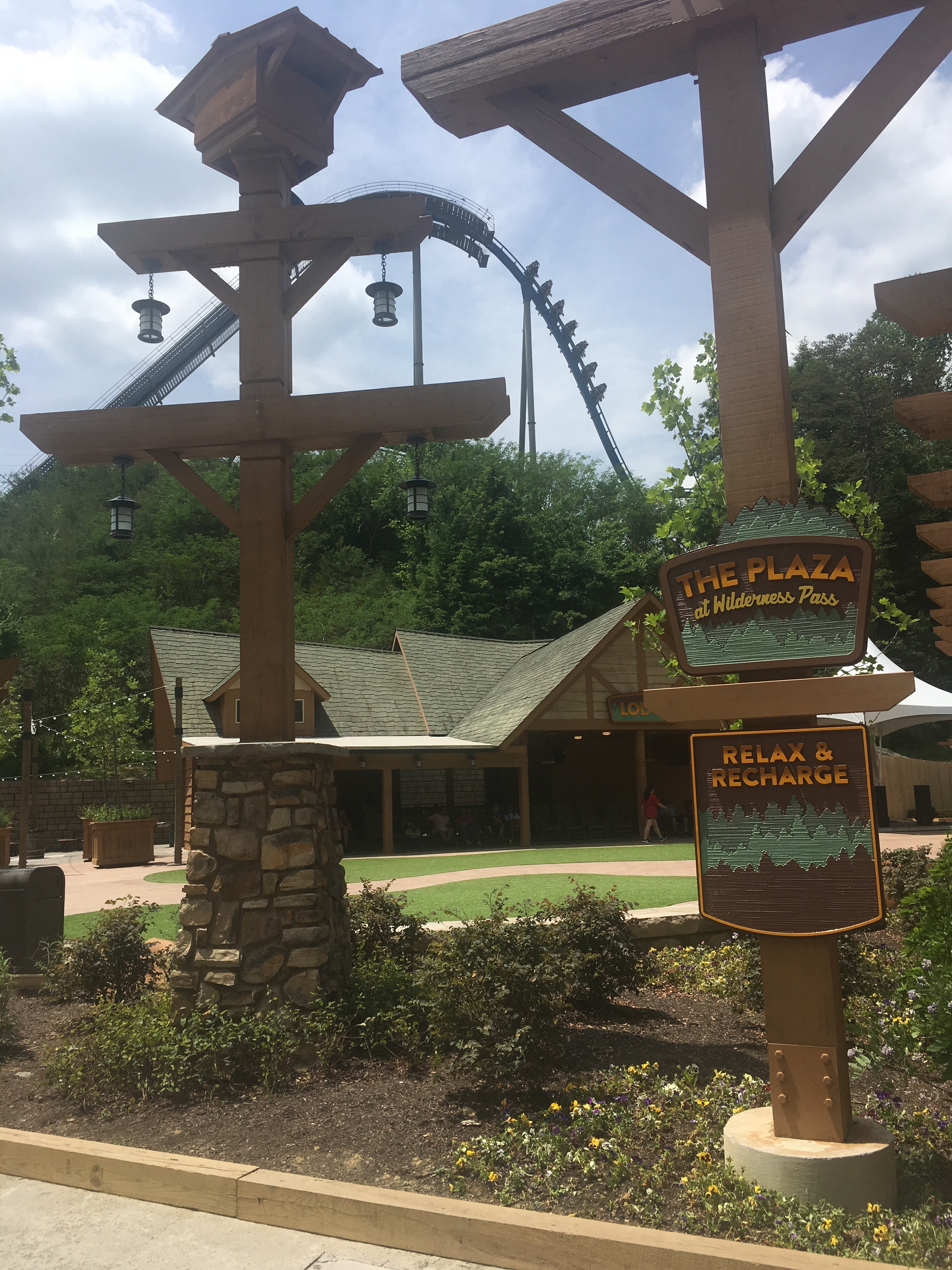 The Lodge. Hier wurde das alte Stationsgebäude umgebaut in einen Bereich mit Sitz- und Liegemöglichkeiten. Die restliche Fläche wurde betoniert und bepflanzt. Der Bereich soll wohl zukünftig für saisonale Besonderheiten genutzt werden: Halloween/Erntefest und Weihnachtsmarkt.