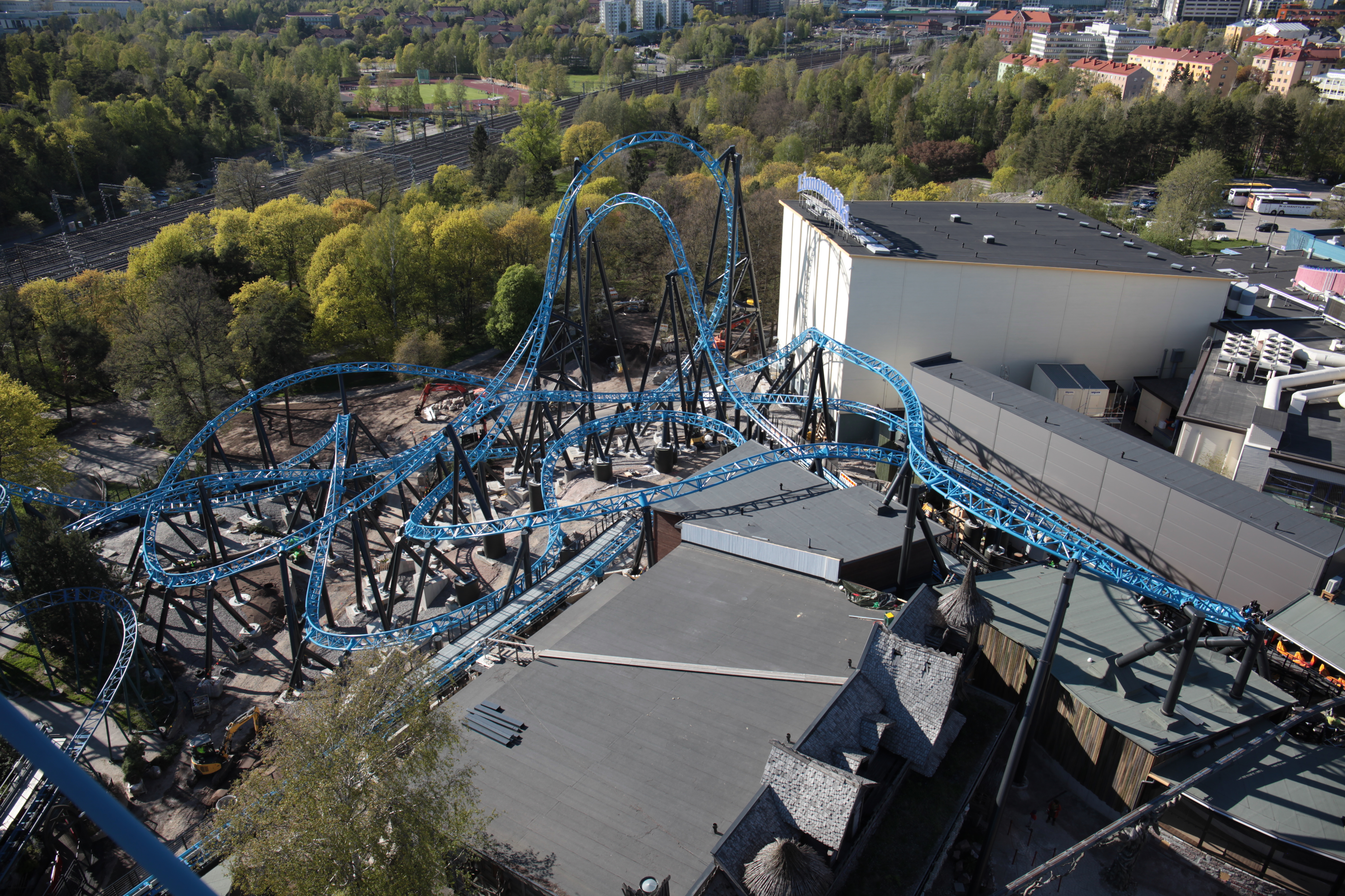 (Der Rest steht ja schon oben...) – Bzw.: der erste Top Hat geht auf die 52 Meter in Unterschied zur tiefsten Stelle. Eine richtige Höhe ist mit den Unterschieden eher schwer festzustellen. Das Tempo wird wohl im unteren Tal erreicht, also nach dem zweiten Drop bzw. dritten. Mal sehen. Auf jeden Fall ein sehr spannendes Layout, auch mit dem Teil oben über der Plaza.