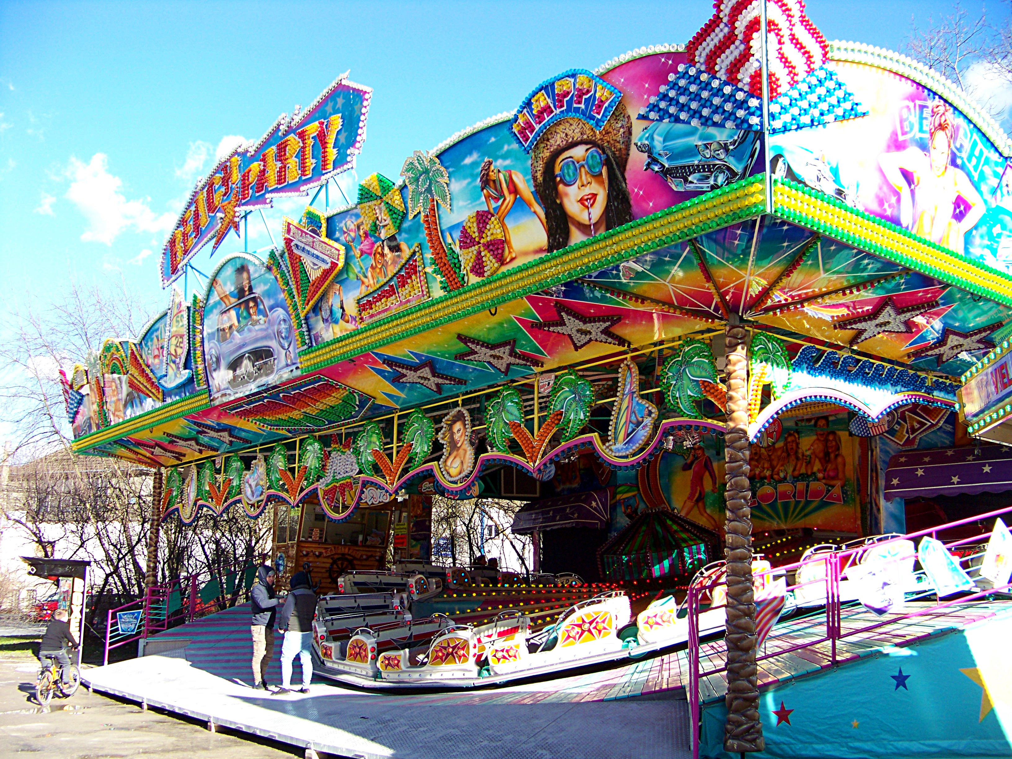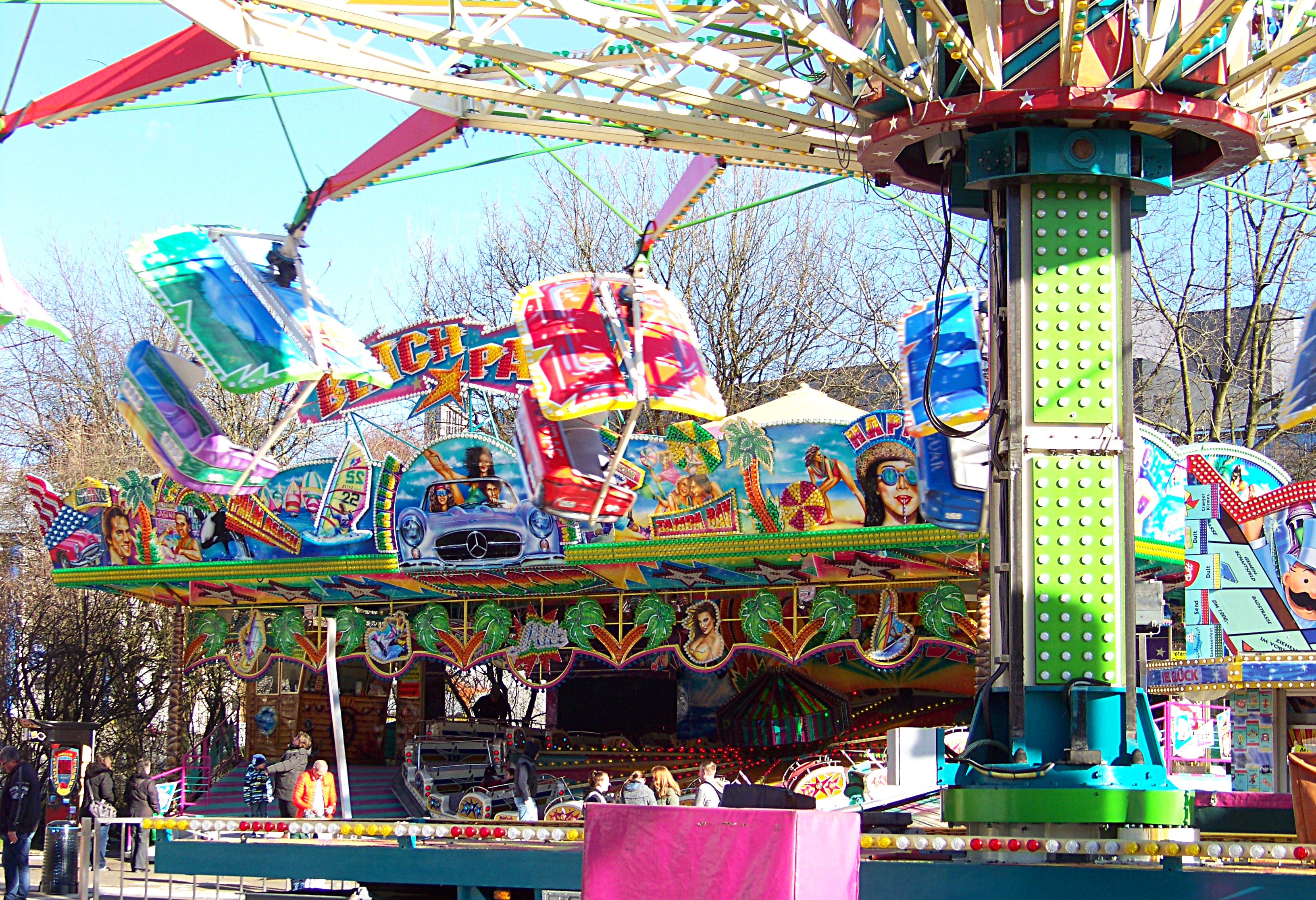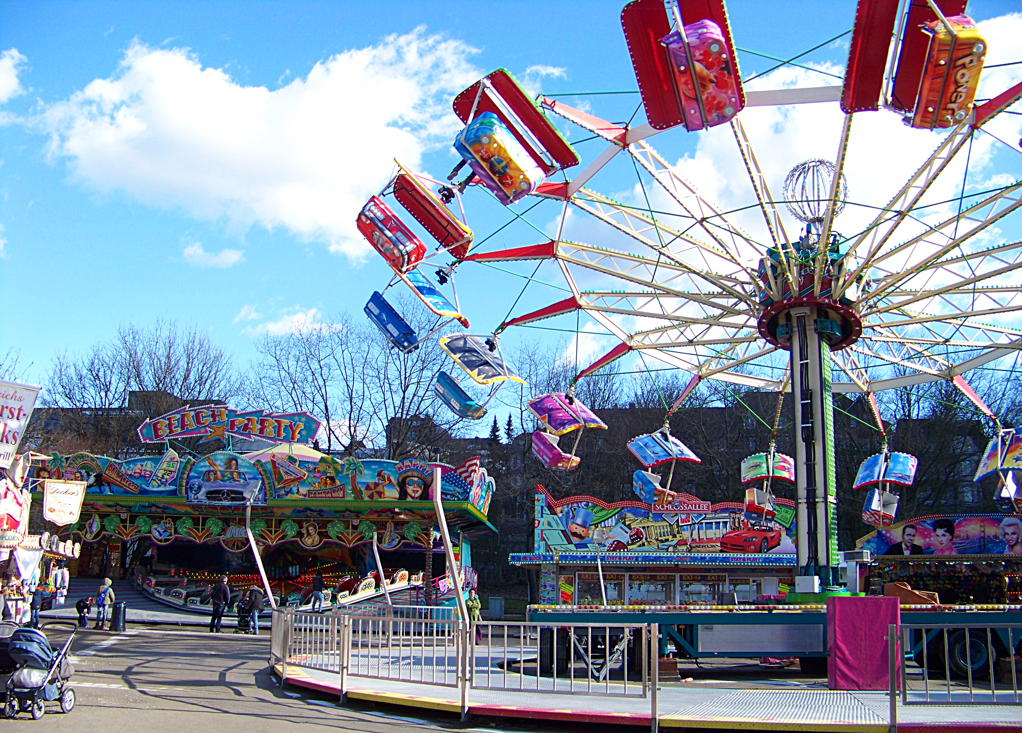 Vorbei am Autoscooter findet man am anderen Ende des Platzes den Hollywood Star von Klinkerfuß und die Beach Party von Milz.