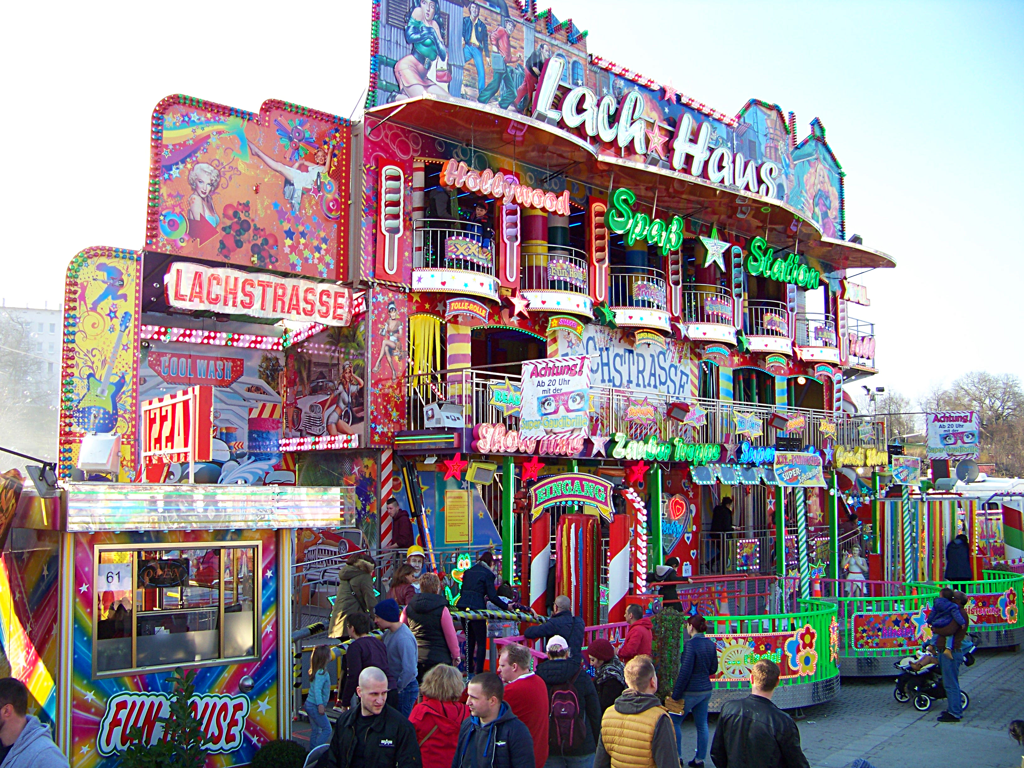Nach dem engen Durchgang bei der Gokartbahn gelangt man plötzlich auf einen etwas größeren offenen Platz, wo man direkt auf das zweite Laufgeschäft, das Lach-Haus von Renz trifft.