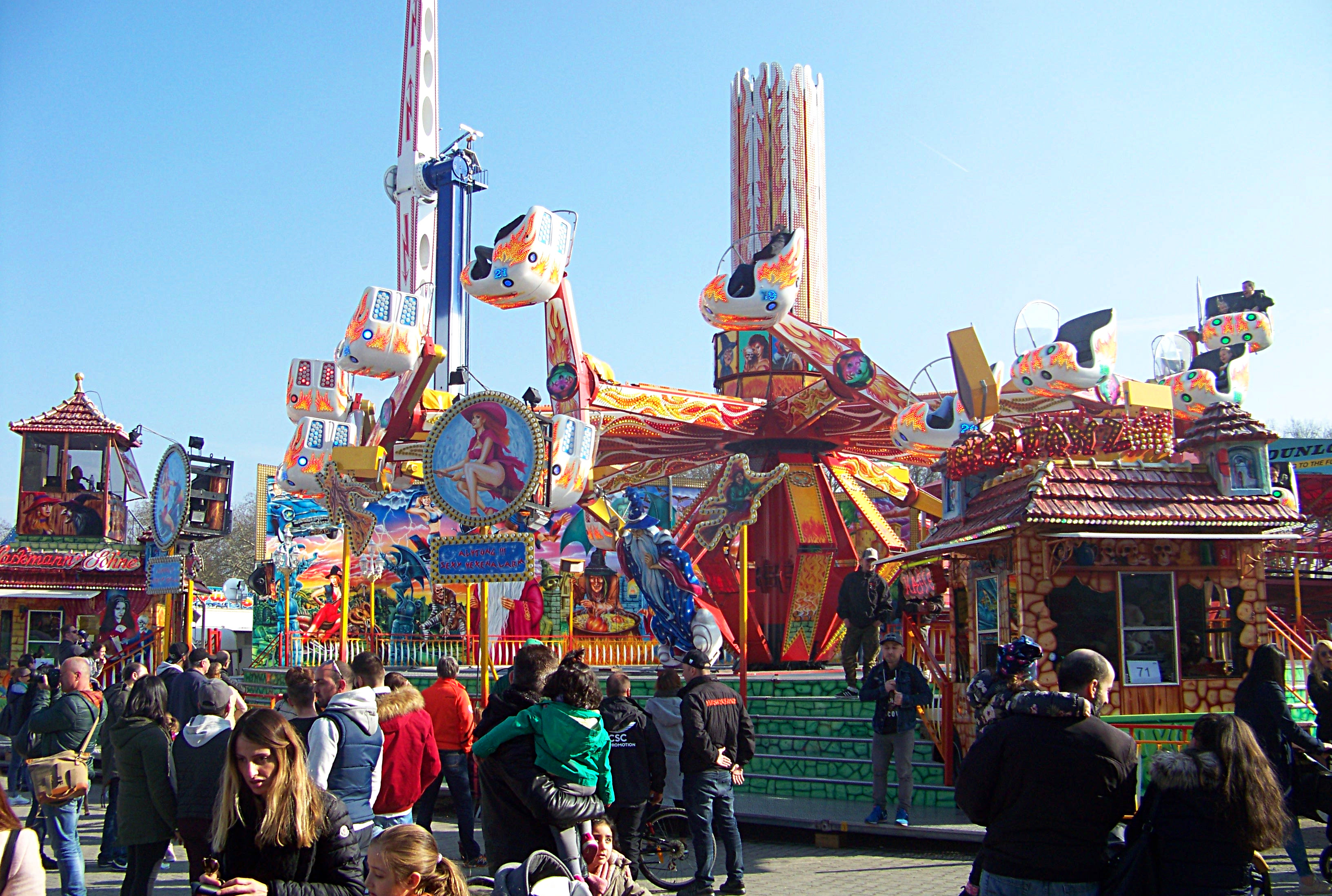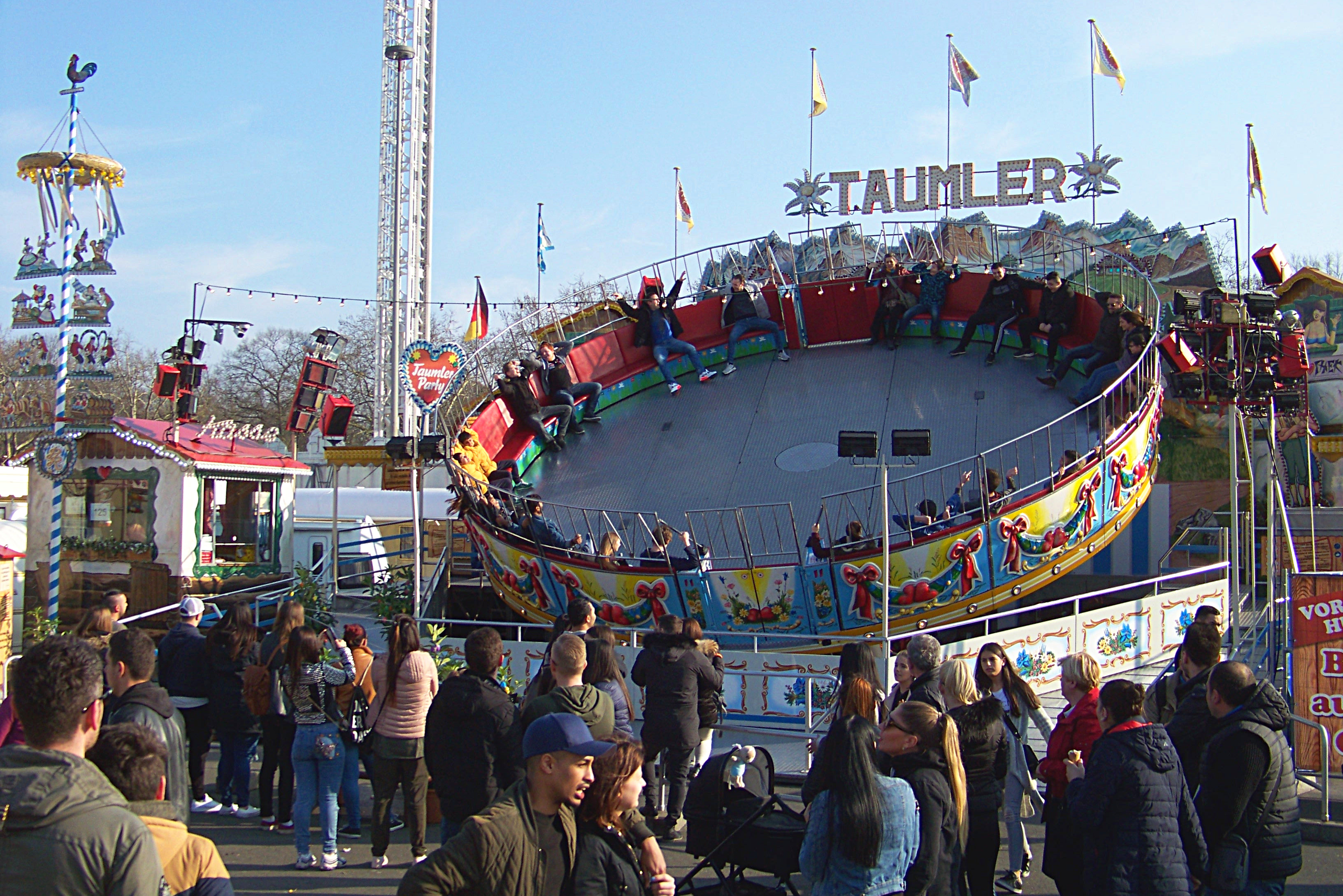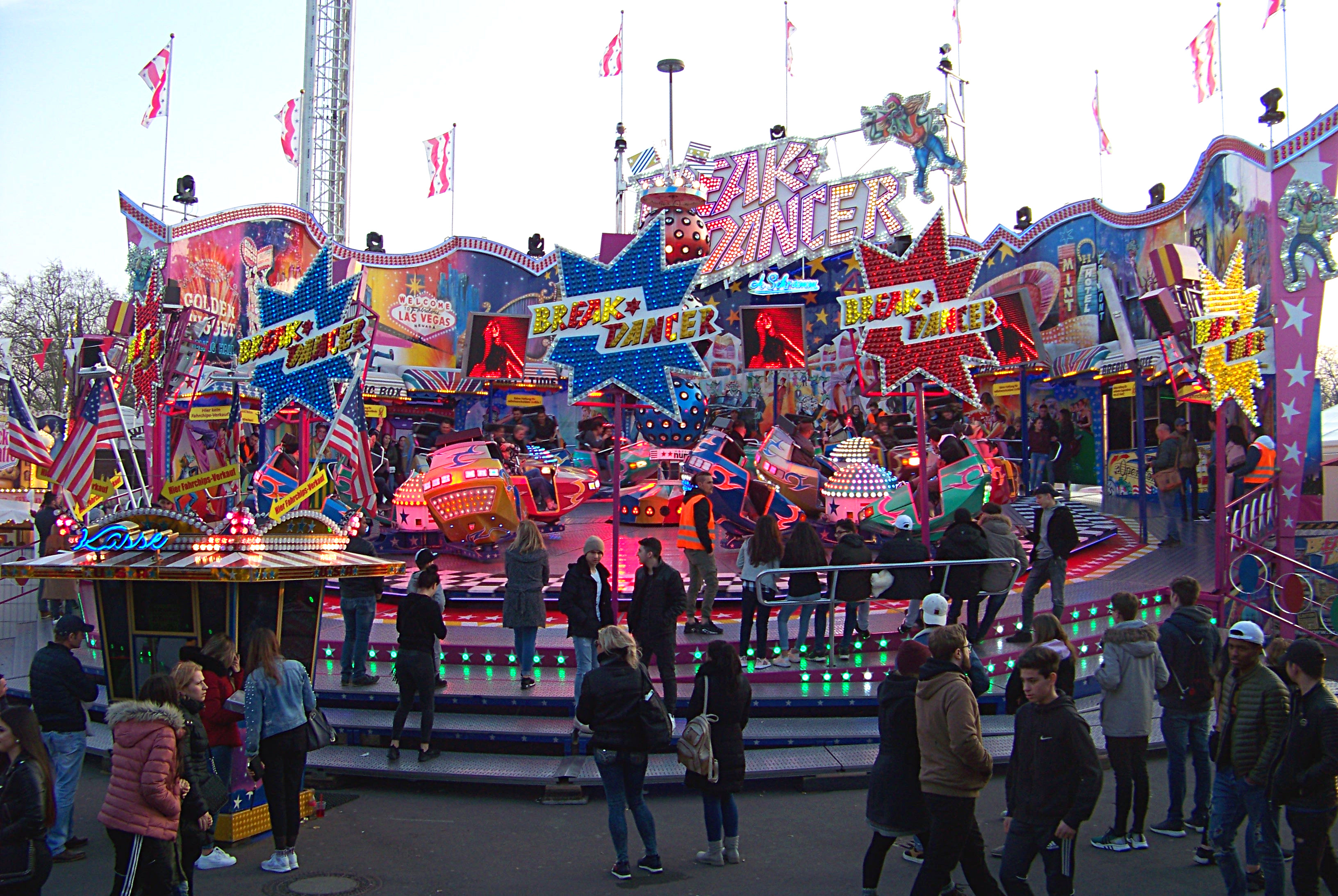 Schon beim Rückstau auf der Autobahnabfahrt merkte ich, dass ich bei weitem nicht der einzige war, der das schöne sonnige Wetter für einen Kirmesbesuch am Frankfurter Ratsweg nutzen wollte. Dementsprechend war der Platz sehr gut gefüllt und alle Fahrgeschäfte der in diesem Jahr sehr gelungenen und ausgewogenen Beschickung wurden rege frequentiert. Die Verteilung der Geschäfte auf dem Platz hätte man auch kaum besser lösen können.