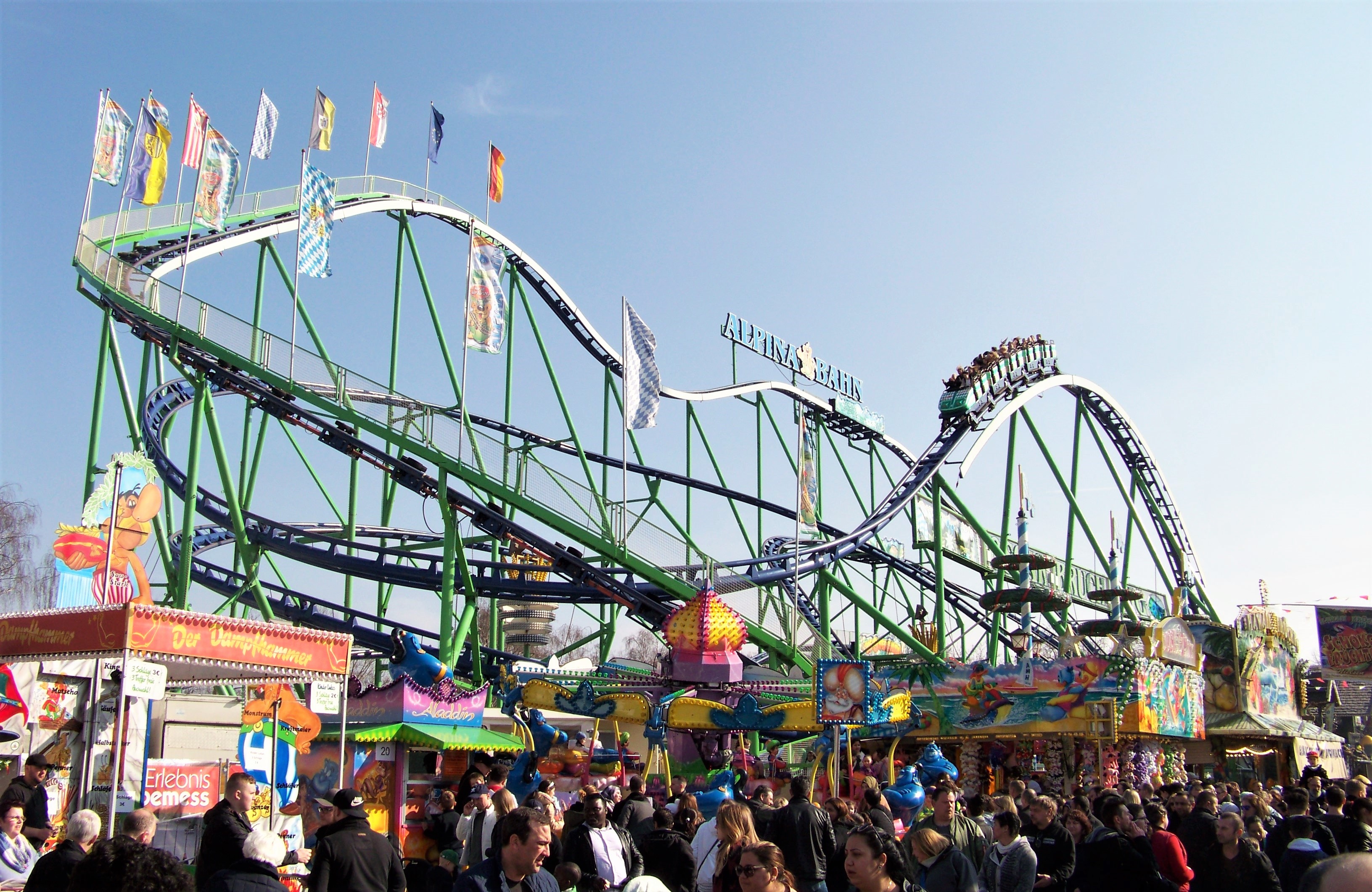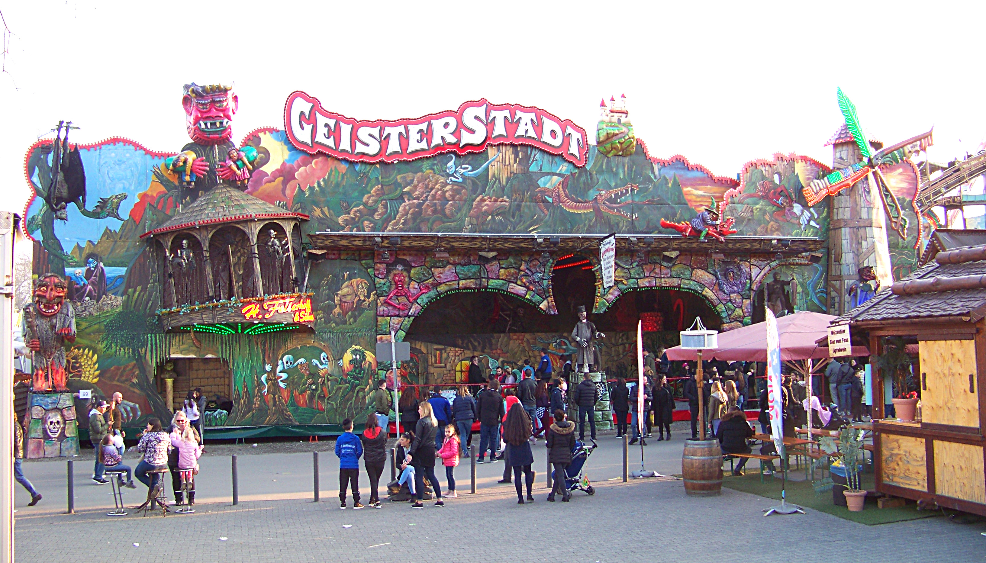 In der Reihe entlang der Eissporthalle stehen in diesem Jahr der Drop Zone-Turm von Müller und die Geisterstadt von Fellerhoff.