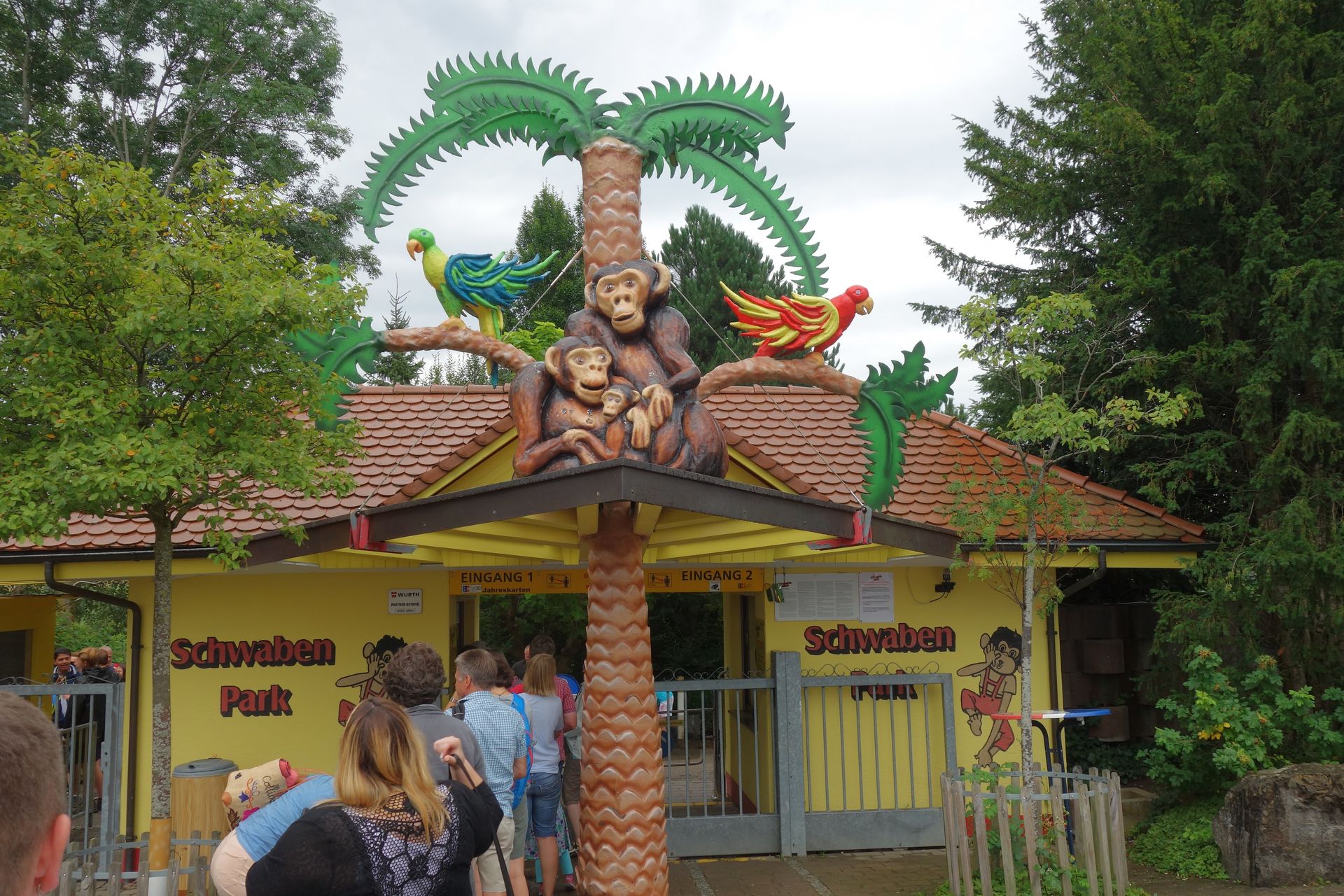 Die Familie Hudelmaier hatte den Park nämlich 1972 als Safari Park gegründet - auch wenn die geplante Fahrt der Parkeisenbahn durch Löwen- und Tigergehege damals nicht genehmigt wurde. Seit 1976 führte der Park eine Schimpansen-Show auf, die einerseits jahrzehntelang quasi die Hauptattraktion war, aber natürlich auch zunehmend von Tierschützern kritisiert wurde. Das erste richtige Fahrgeschäft kam 1978 mit einem Riesenrad, ab 1985 entwickelte man sich eher in Richtung Freizeitpark. Daher erfolgte in besagtem Jahr auch die Umbenennung zu Schwaben Park. Zwar leben hier nach wie vor noch einige Tiere, auch die Schimpansen, man hat die Nachzucht allerdings eingestellt und reduziert so seit eingen Jahren kontinuierlich den Tierbestand. Die Schimpansen-Show hat man 2017 schließlich eingestellt. Dafür entstanden direkt an der Zufahrtsstraße ein paar Blockhütten als Übernachtungsmöglichkeiten. Die machten zwar einen schönen Eindruck, liegen mir persönlich aber etwas ungünstig - quasi alle Besucher müssen an den freistehenden Hütten vorbei.