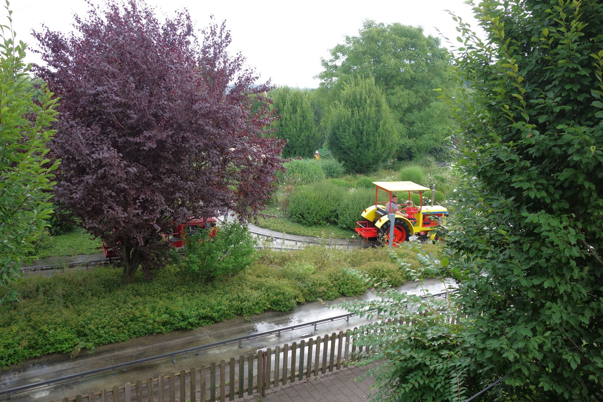 Nach dem leicht verregneten Zwischenstopp im Technikmuseum erreichten wir gegen 10:20 Uhr den ersten richtigen Freizeitpark dieser wahnwitzigen Tagestour. Trotz der leichten Verspätung waren wir noch sehr entspannt, auch wenn die als Parkplatz dienende Wiese schon recht voll schien. Weiter vorne wäre aber tatsächlich noch reichlich Platz gewesen.