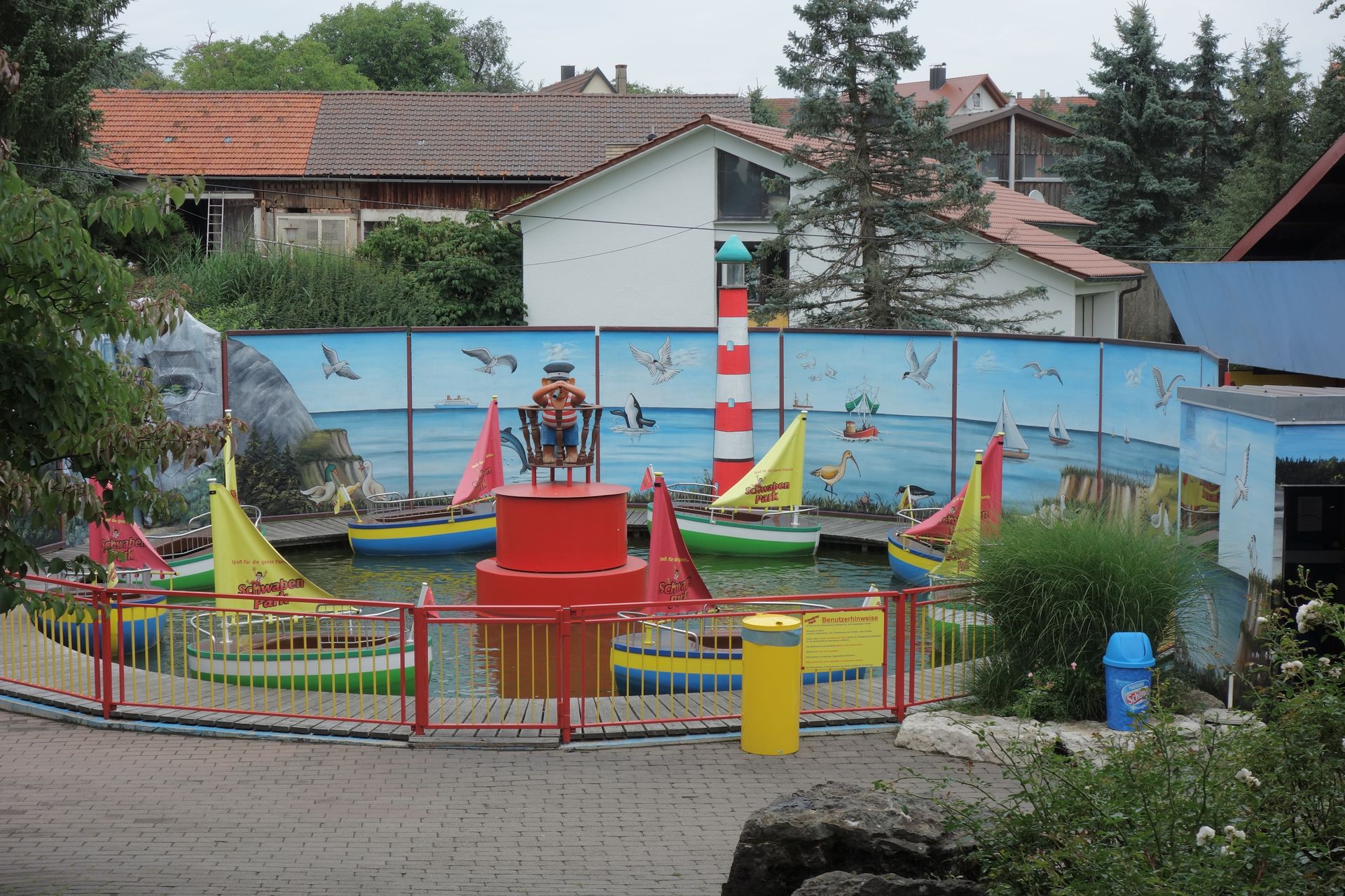Ganz in der Nähe stand bis 2015 noch die Himalayabahn. Eine 1989 eröffnete Schwarzkopf-Wildcat, die nun als Alpen-Coaster unter Vorlop wieder auf Reisen ist. Den Count muss ich also anderswo nachholen. Den Platz der Achterbahn übernahm 2016 die Märchenfahrt, die ihrerseits von der Dracheninsel aus dem Heide Park vertrieben worden war. Umgezogen sind aber natürlich nur Technik, Boote und die Märchenszenen. Den Betonkanal baute der Schwaben Park neu. Leider reichte unsere Zeit letztlich nicht mehr für eine Fahrt. Ich habe es nichtmal hinbekommen, ein Bild davon zu machen...