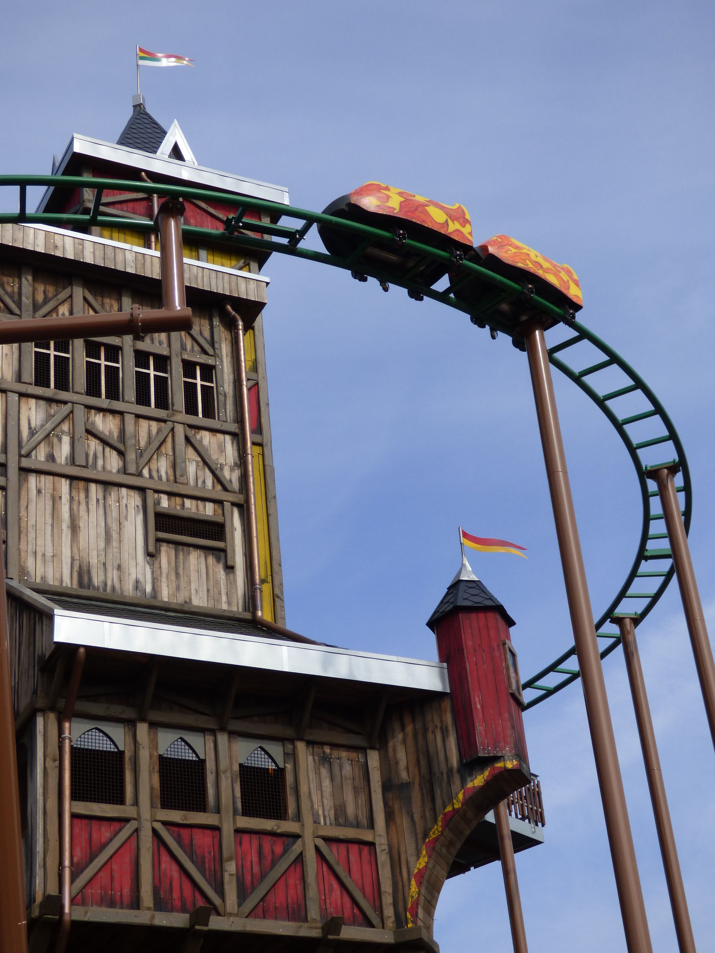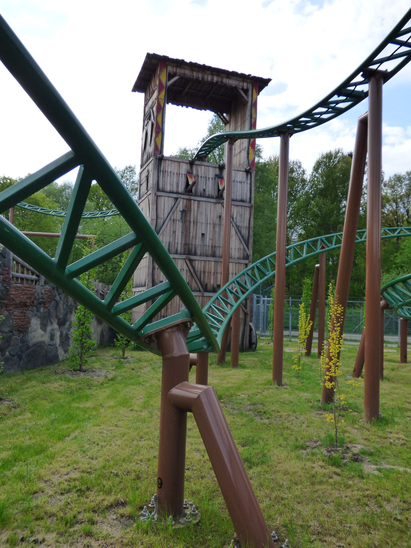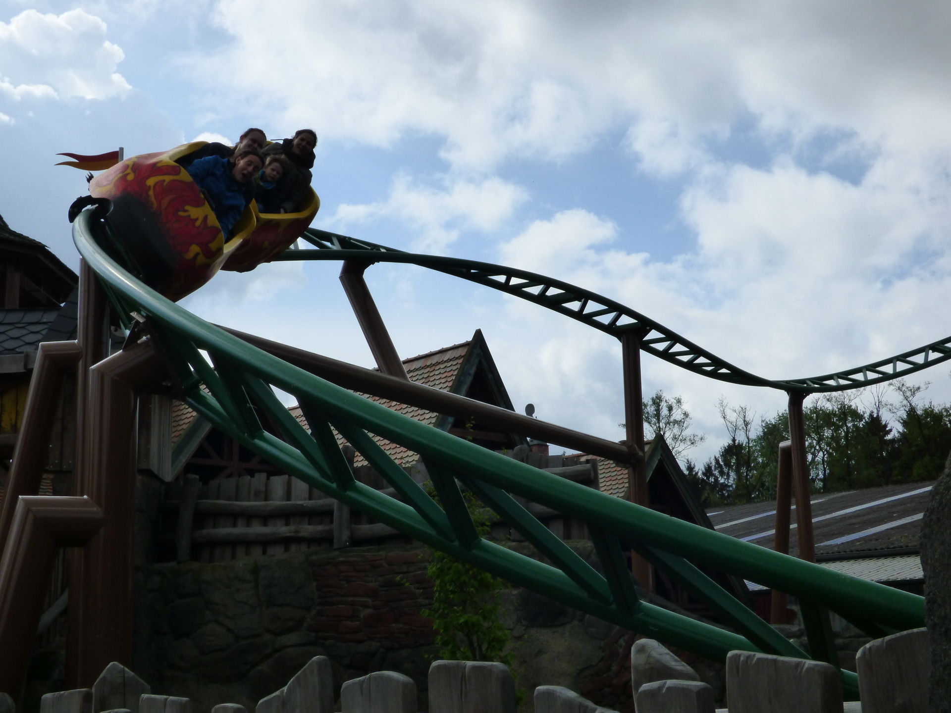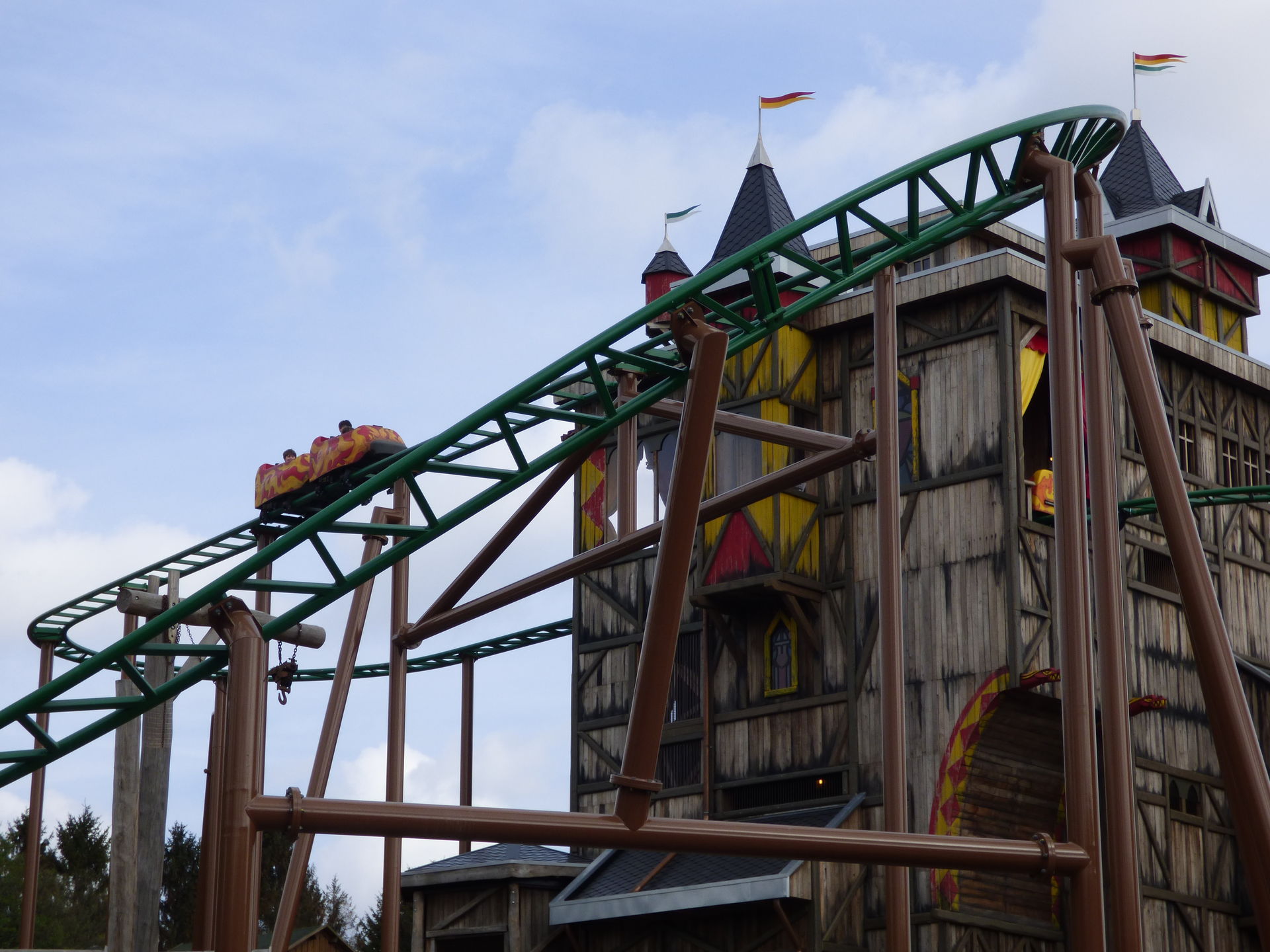 Zunächst einmal muss man sagen, dass die Achterbahn hervorragend in den Bereich integriert wurde. Die Farben sind perfekt gewählt, die braunen Stützen nimmt man aufgrund der Umgebung der Burg überhaupt nicht wahr und auch die grünen Schienen passen sich wunderbar in die Umgebung ein. Lediglich die Gestaltung der Wagen hat mir überhaupt nicht gefallen. Das wirkt so, als hätte man keine Zeit mehr gehabt und mal eben schnel irgendwas da drauf gepinselt. Da sollte man auf jeden Fall noch mal in Ruhe dran.