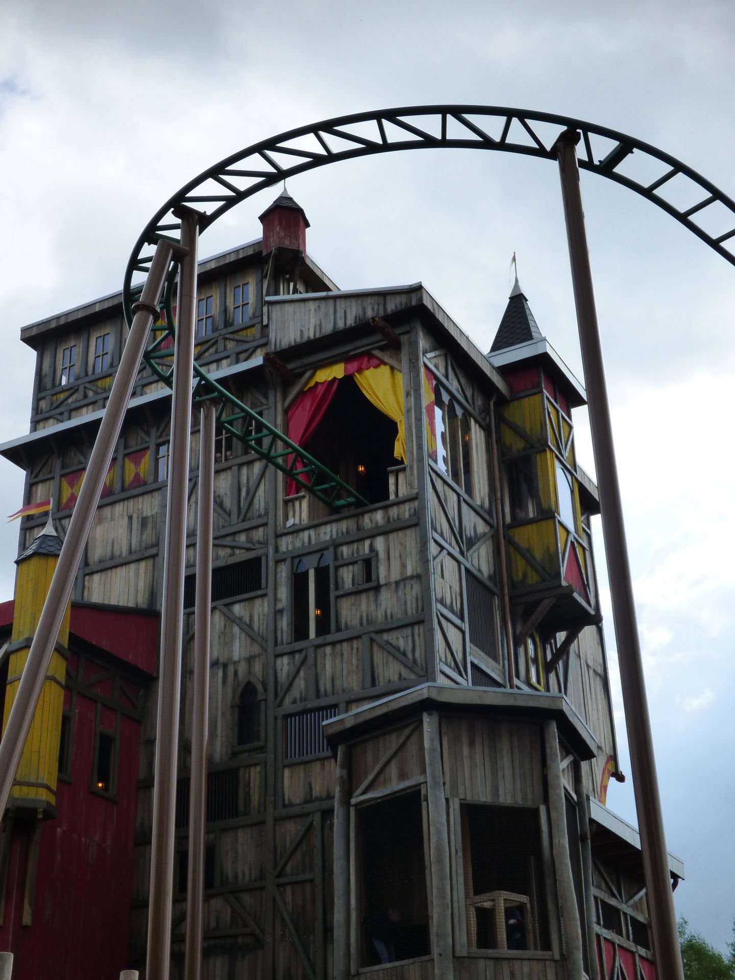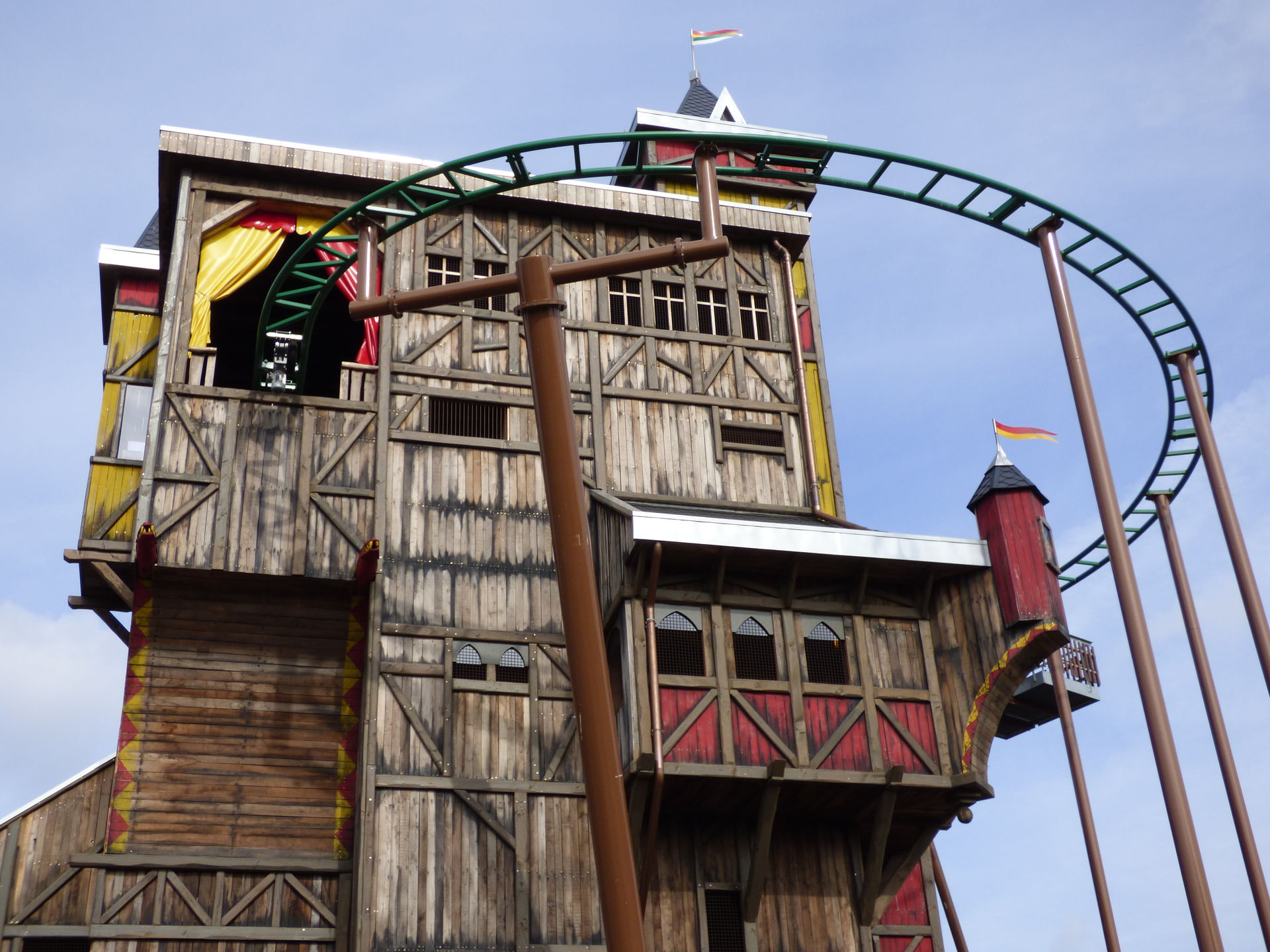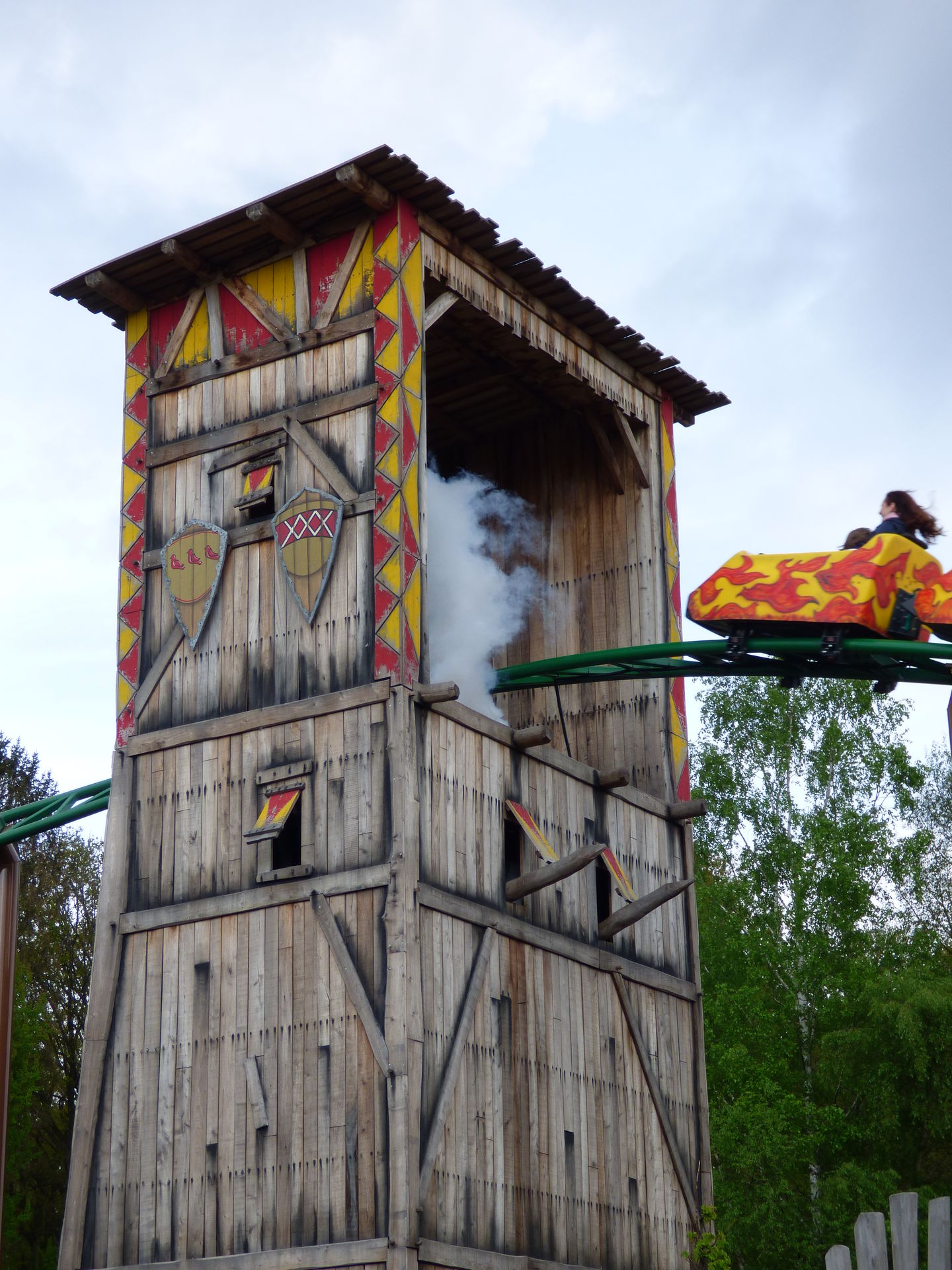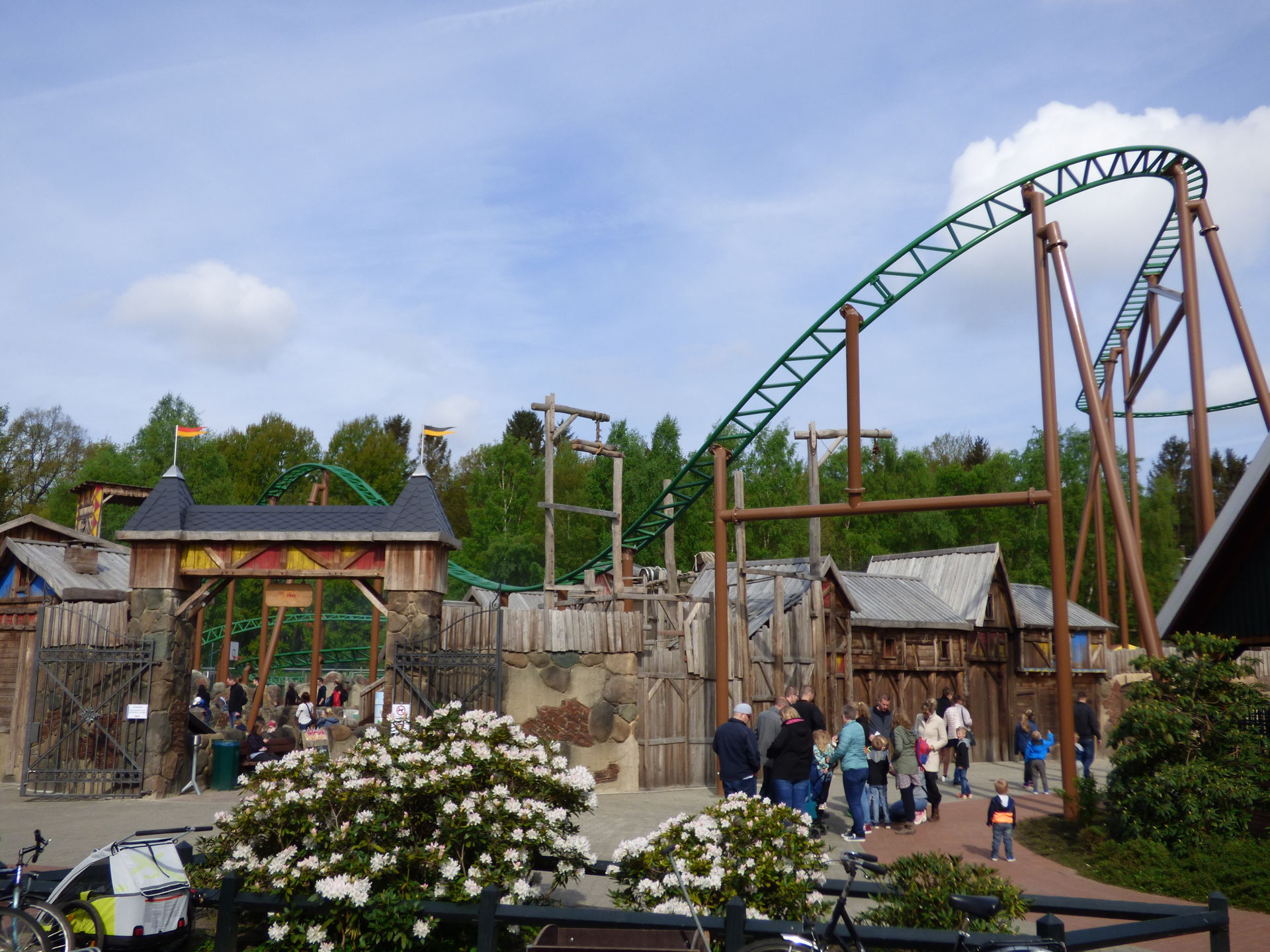 Zunächst einmal muss man sagen, dass die Achterbahn hervorragend in den Bereich integriert wurde. Die Farben sind perfekt gewählt, die braunen Stützen nimmt man aufgrund der Umgebung der Burg überhaupt nicht wahr und auch die grünen Schienen passen sich wunderbar in die Umgebung ein. Lediglich die Gestaltung der Wagen hat mir überhaupt nicht gefallen. Das wirkt so, als hätte man keine Zeit mehr gehabt und mal eben schnel irgendwas da drauf gepinselt. Da sollte man auf jeden Fall noch mal in Ruhe dran.