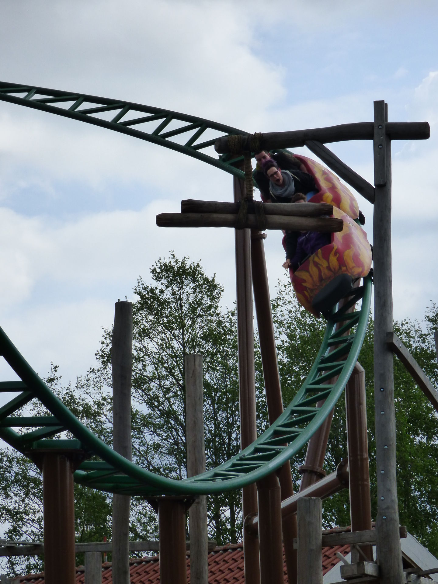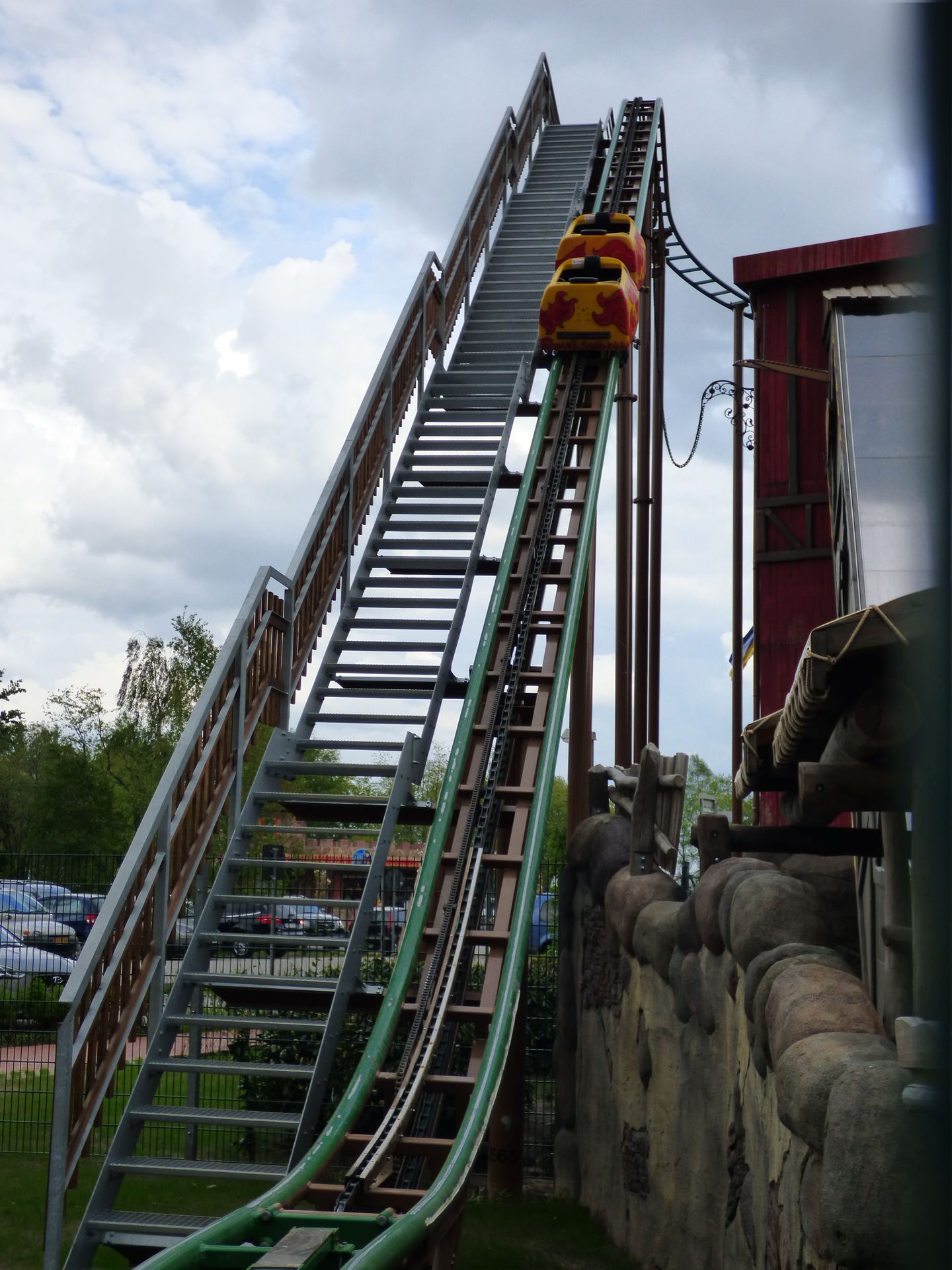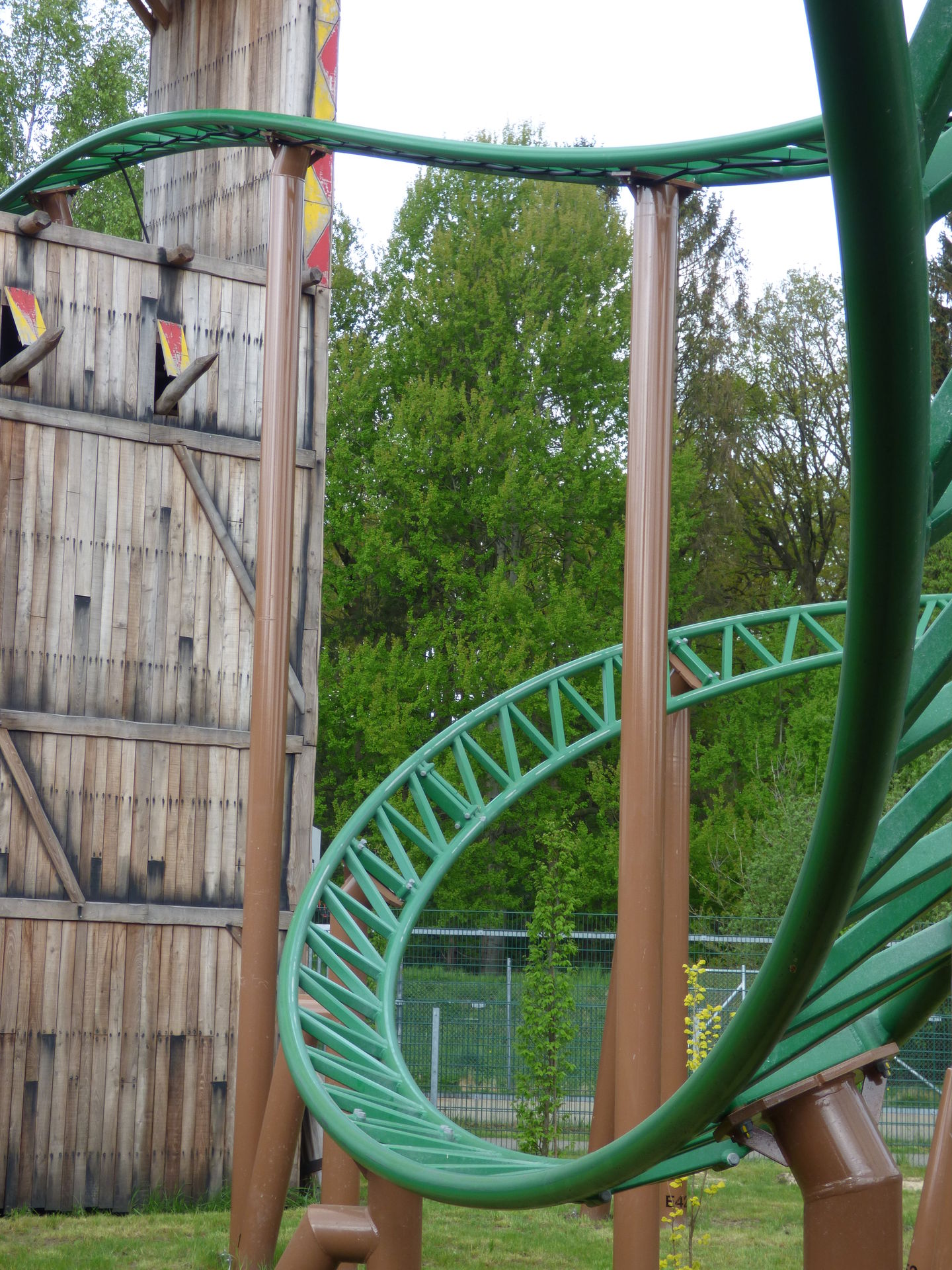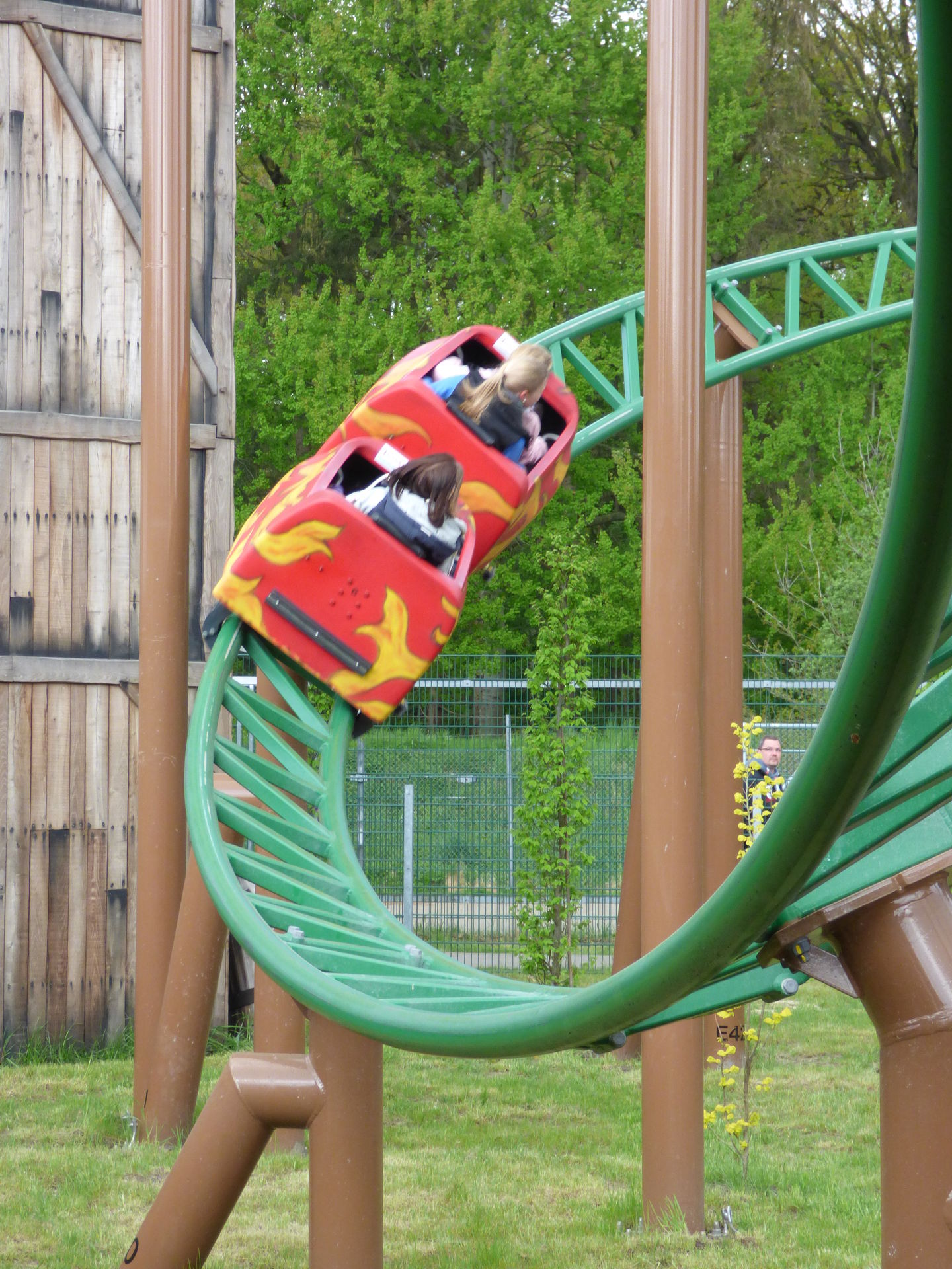 Zunächst einmal muss man sagen, dass die Achterbahn hervorragend in den Bereich integriert wurde. Die Farben sind perfekt gewählt, die braunen Stützen nimmt man aufgrund der Umgebung der Burg überhaupt nicht wahr und auch die grünen Schienen passen sich wunderbar in die Umgebung ein. Lediglich die Gestaltung der Wagen hat mir überhaupt nicht gefallen. Das wirkt so, als hätte man keine Zeit mehr gehabt und mal eben schnel irgendwas da drauf gepinselt. Da sollte man auf jeden Fall noch mal in Ruhe dran.