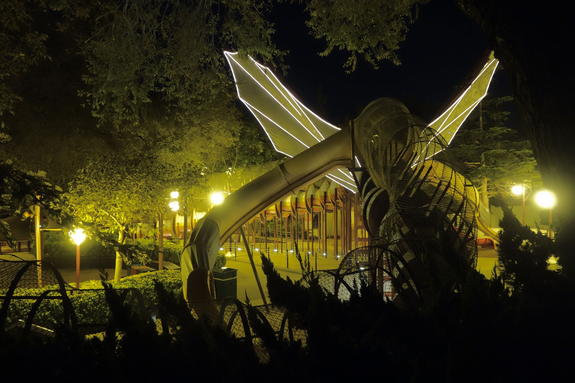 Dass der eher ruhige, von dichten Wäldern geprägte Themenbereich Polynesia so verlassen war, lag wohl an der Wegführung an diesem Abend. Der eigentliche Hauptweg vom Eingang hierher war für ein weiteres Halloween-Maze gesperrt. Und wir hatten ohne Parkplan in der Hand Schwierigkeiten, uns auf den recht verzweigten Wegen in diesem spärlich beleuchteten Bereich zurechtzufinden. Letztlich fanden wir aber doch einen Wegweiser, der uns über einen sonst abgesperrten Verbindungsweg wieder zurück in den Westernbereich führte, von wo wir dann den Weg ins Bett einigermaßen kannten. Dort fielen wir nach diesem überaus positiven ersten Schnupperbesuch etwas erschöpft hinein. Am nächsten Tag sollte es mit Eindrücken bei Tage weitergehen...