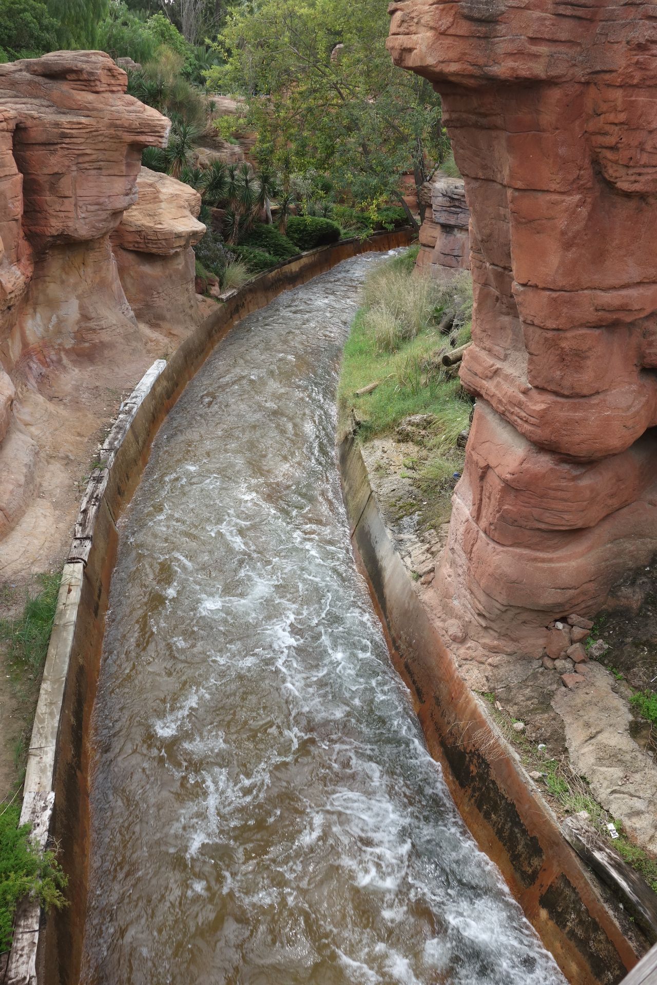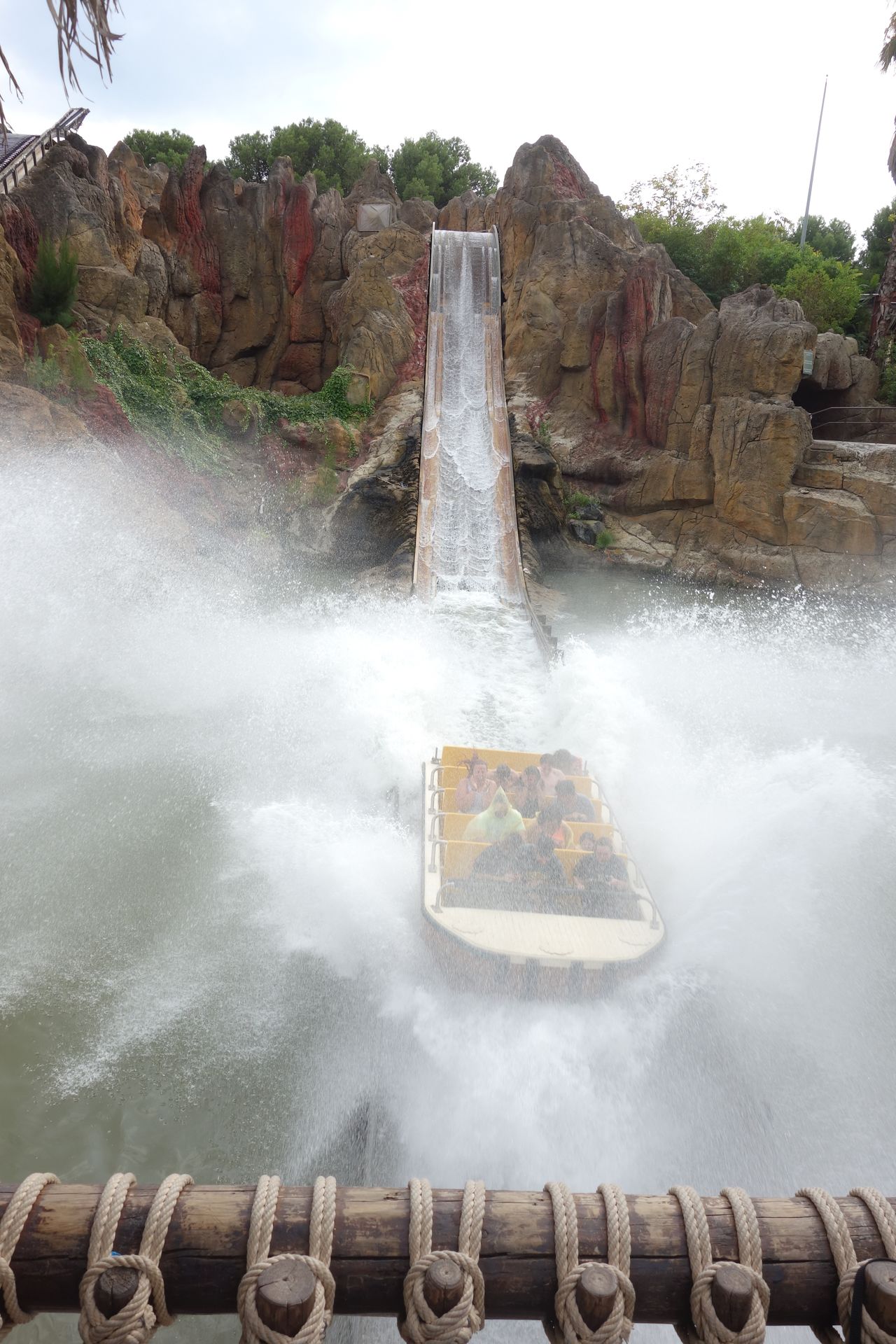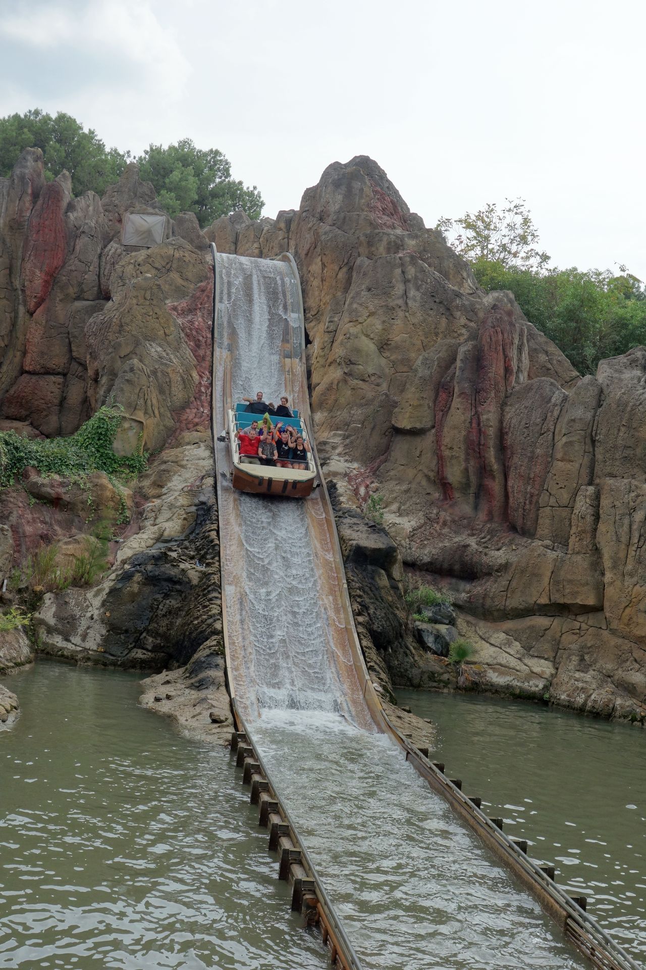 Mit dem Express Pass (das Wristband in Verbindung mit der Zimmerschlüssel- und Parkeintrittskarte) waren wir auch hier quasi direkt im Boot. Ein relativ ruhiger Wildwasserfluss durch die künstliche Felslandschaft, die nur eine leichte Erfrischung parat hielt. Die Wasserkanonen entlang der Strecke waren noch unbesetzt. Von der gleichalten