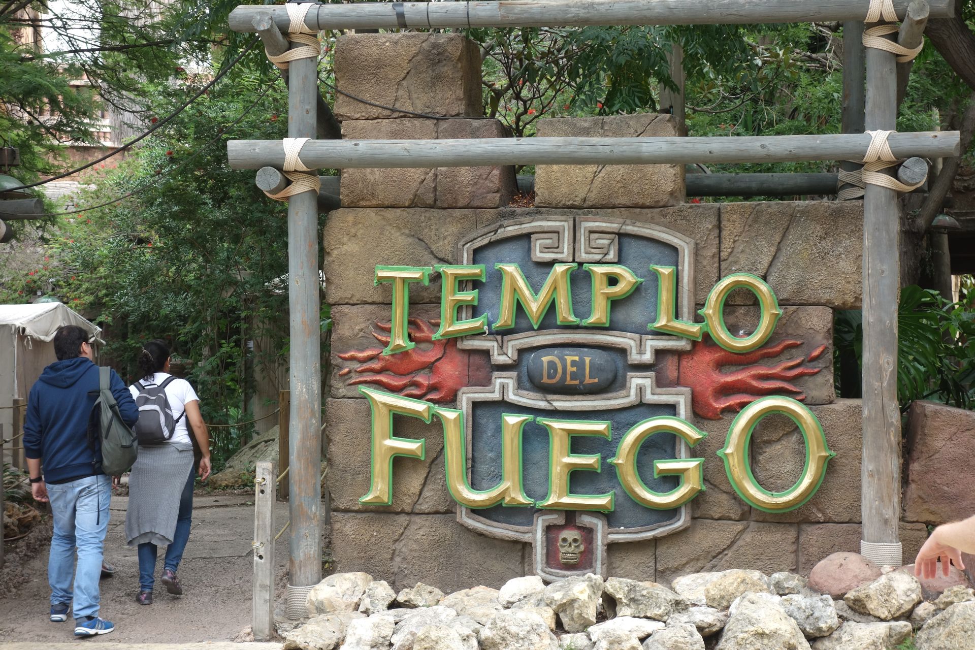 Dank Express Pass mussten wir ja nicht vorzeitig in der Schlange warten, sondern konnten einfach so zur nächsten Vorstellung reinschlüpfen. Dabei werden die Besucher zunächst in einem kleinen, stickigen Räumchen zusammengepfercht, in dem eine Pre-Show stattfindet. Thematisch begleiten wir Dr. Carmen Cadena als eine Mischung von Indiana Jones und Lara Croft bei der Erkundung eines alten Maya-Tempels in dem ein wertvoller Schatz vermutet wird. Die etwas tollpatschige Archäologin braucht allerdings die Hilfe der Besucher, um endlich herauszufinden, wie sich das Tor zur Schatzkammer öffnet. Diese bildet den eigentlichen Show-Raum, in dem die Besucher auf Stegen entlang zwei Seiten der großen Halle verteilt stehen. So sollte eigentlich jeder eine gute Sicht auf die "Bühne" haben, denn hinten sind die Stege nochmals mit einem zusätzlichen Podest erhöht. In der anderen Ecke des Raumes findet sich die gewaltige Kulisse, der Raum dazwischen ist mit Wasser gefüllt. Natürlich wird der Schatz gefunden, aber die Entwendung löst - wie man es nunmal von alten Mayaschätzen erwarten sollte - einen Fluch aus. Nach und nach zerfällt die Tempelanlage, überall bricht Feuer aus, und ein paar Wasserspritzer dürfen auch nicht fehlen. Und die hübsche Archäologin springt natürlich auch noch munter dazwischen herum. Schwer zu beschreiben, das Spektakel muss man einfach mal selbst erlebt haben (auch wenn es für meinen Geschmack ruhig noch etwas länger hätte andauern können). Stolze 35 Millionen hatte man 2001 für diese Pyroshow investiert. Man merkt definitiv, dass damals Universal das Sagen hatte. Der auf Profit ausgerichteten Investorengruppe jetzt ist der Feuertempel dagegen ein Dorn im Auge, die Betriebskosten sind nämlich wohl auch nicht zu verachten. Die Öffnungszeiten sind daher schon extrem eingeschränkt, nicht nur zeitlich, sondern auch täglich. In der Off-Season hat man unter der Woche also ganz schlechte Karten, da hat der Templo del Fuego ausschließlich am Wochenende geöffnet.