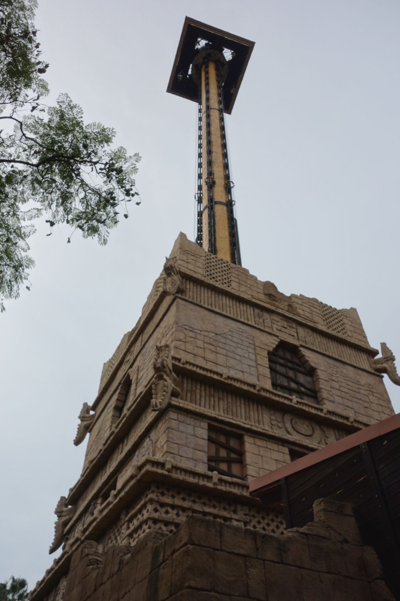 Der 100 Meter hohe (mit Antenne 115 Meter) Intamin Drop Tower inmitten einer mexikanischen Tempelanlage wurde 2005 eröffnet.