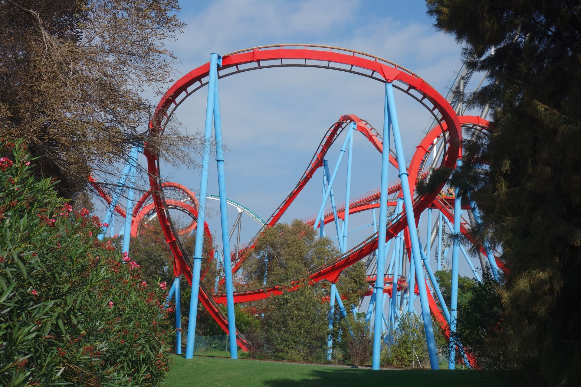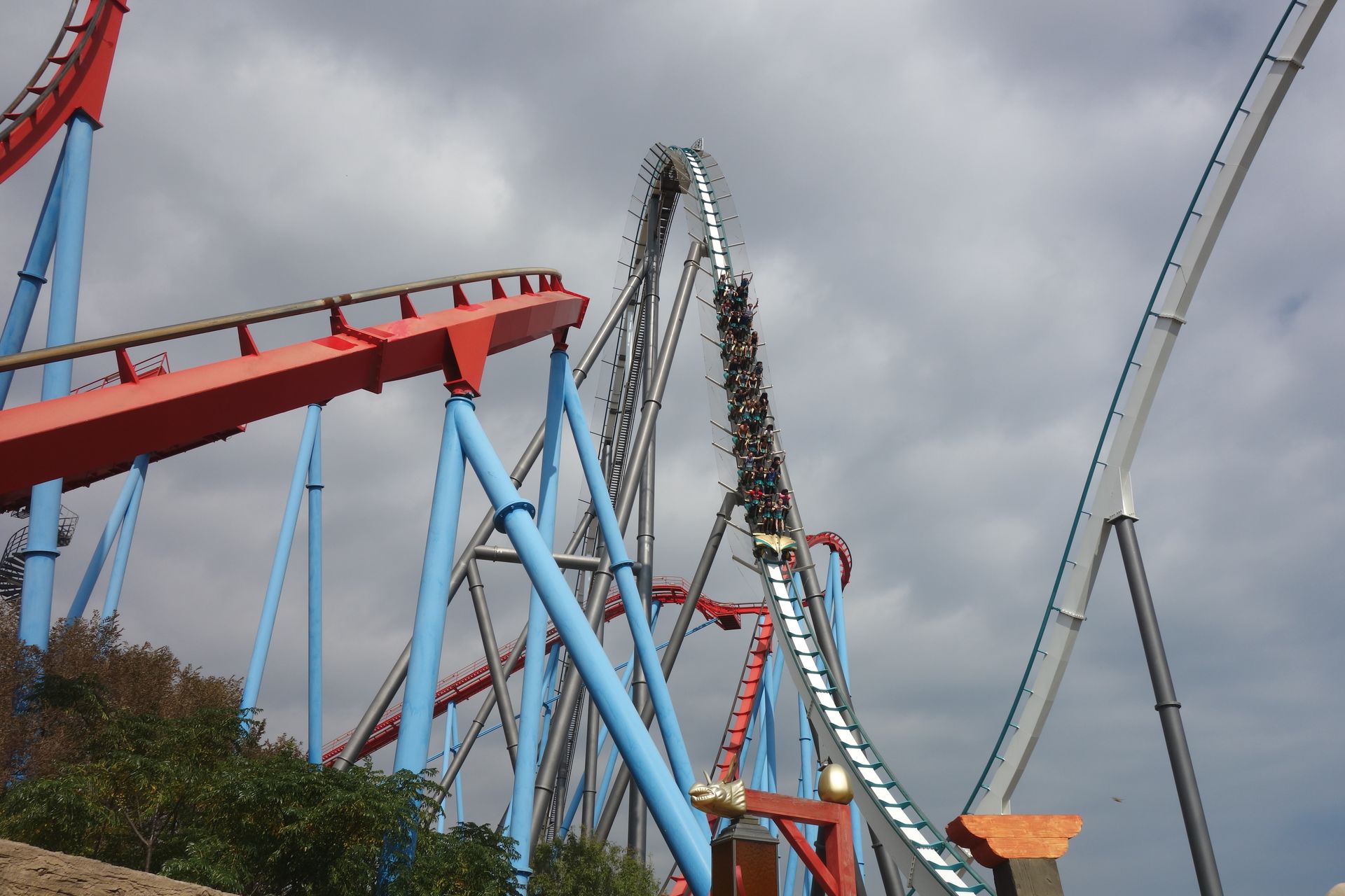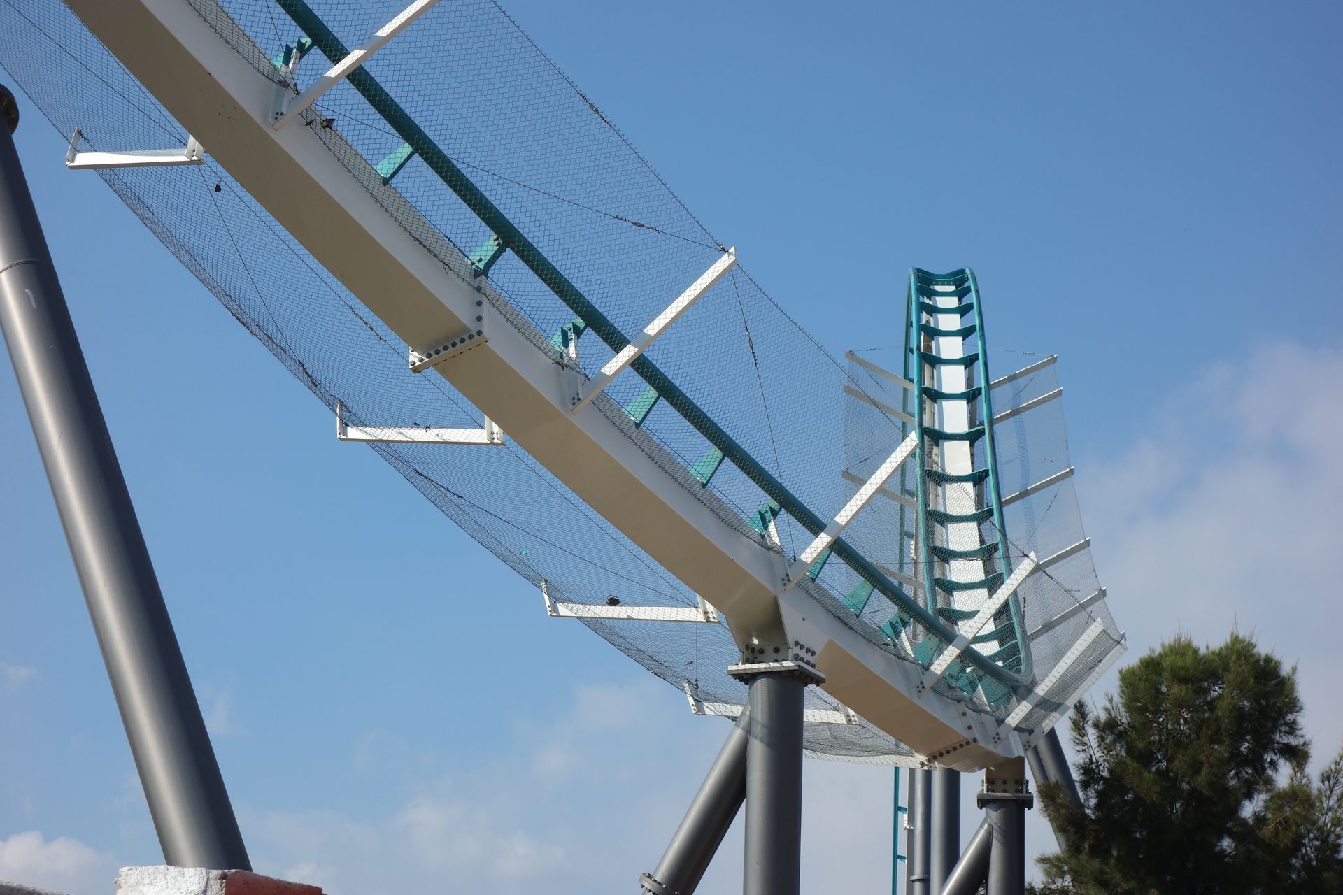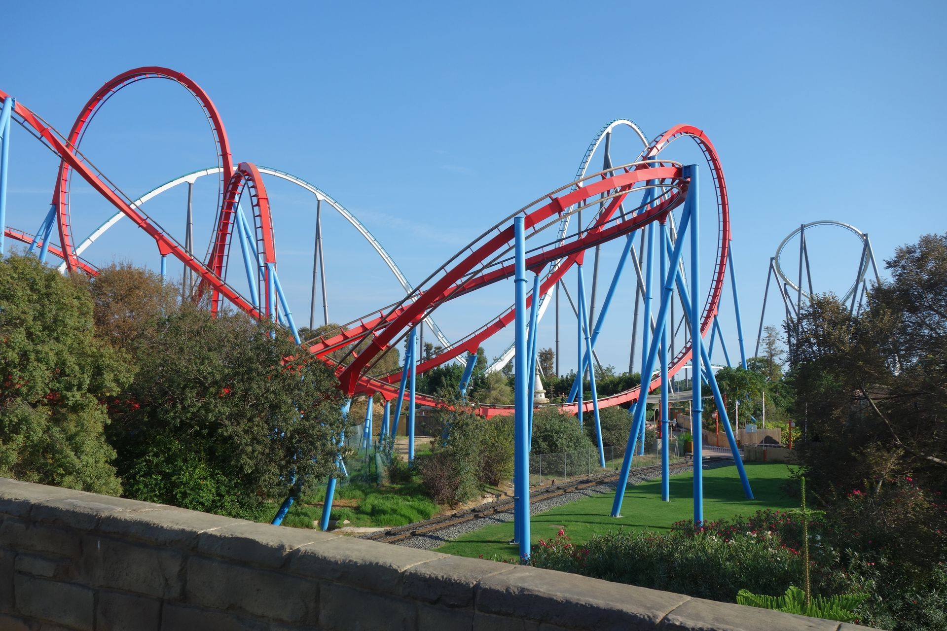 Eine enge Wende über der Strecke der Parkeisenbahn führt zur siebten Inversion, einem Korkenzieher.