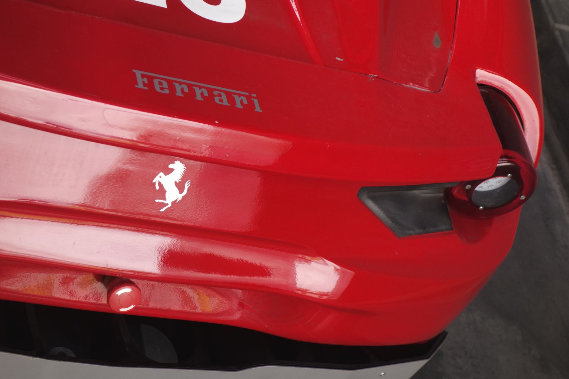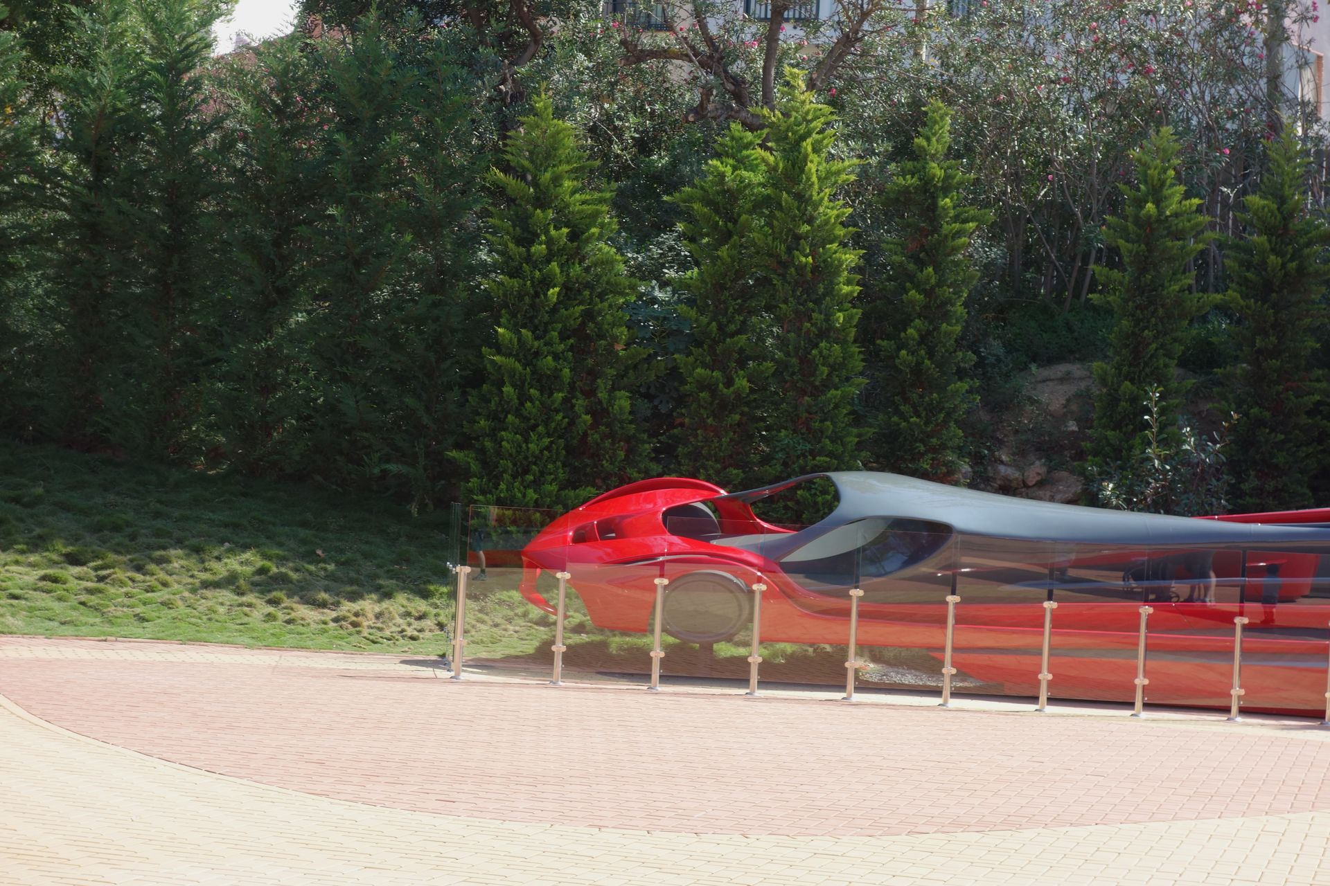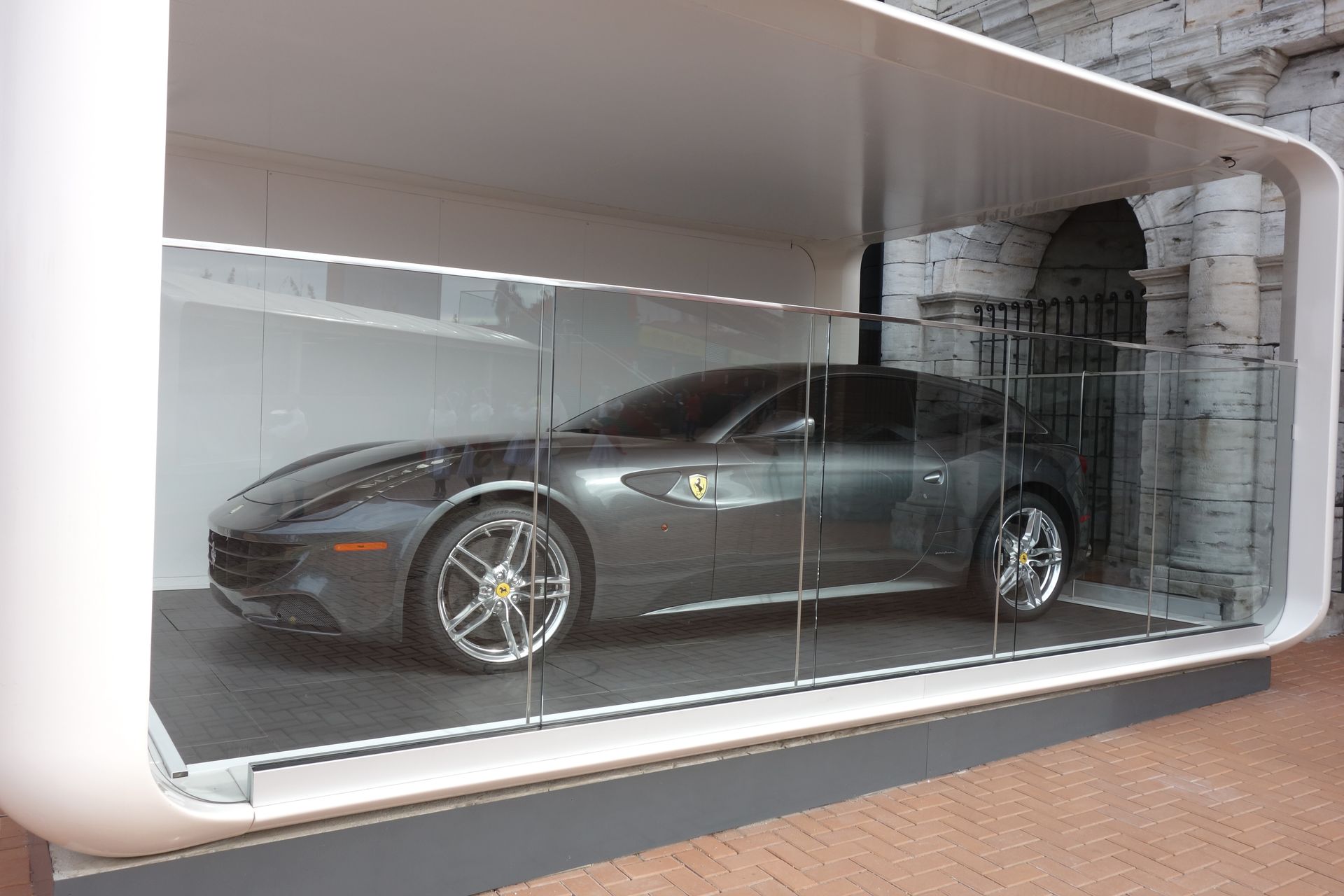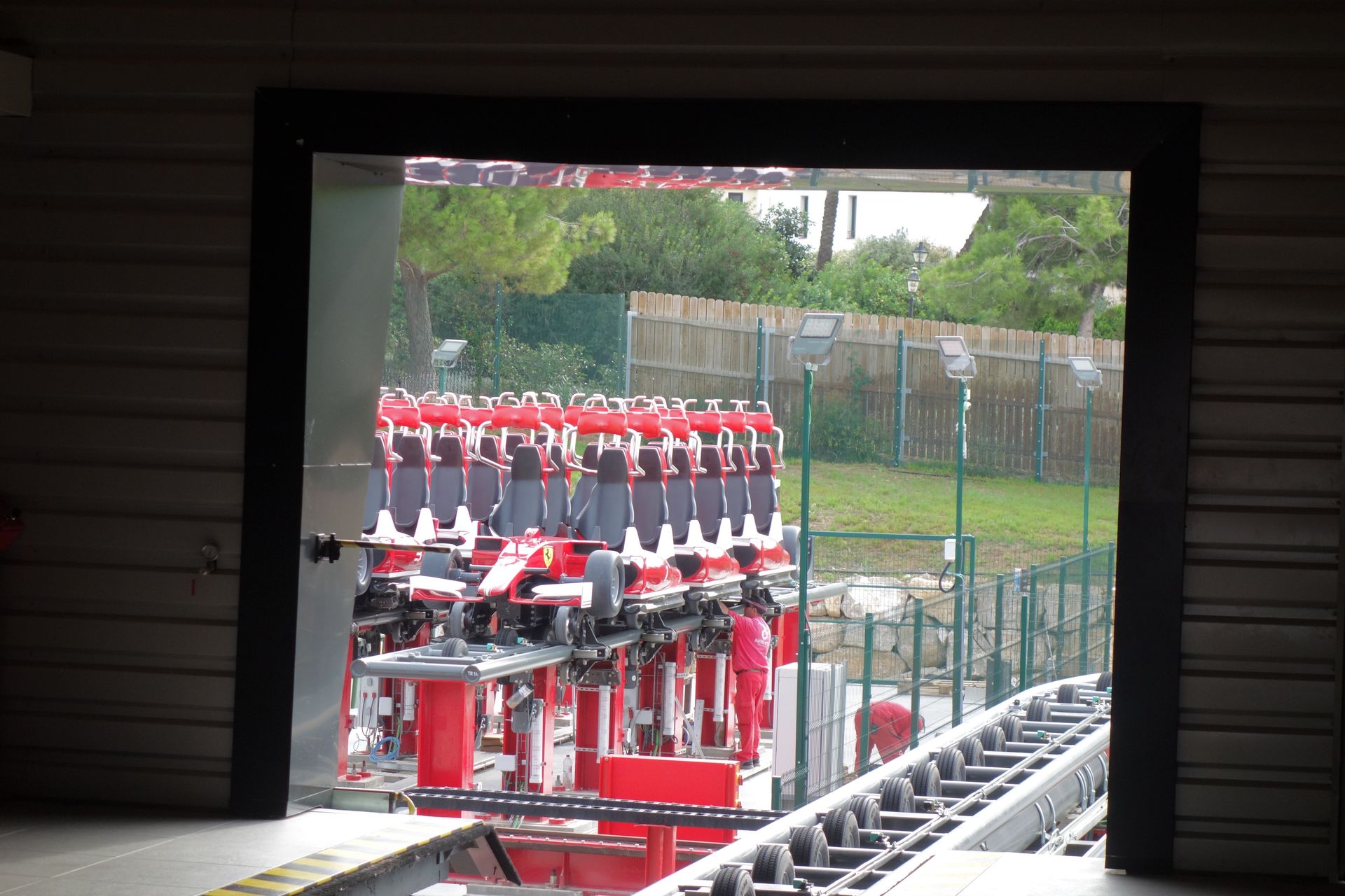 Draußen im Park stehen noch 2-3 andere Ferraris in weißen Boxen mit halbhoher Glaswand.