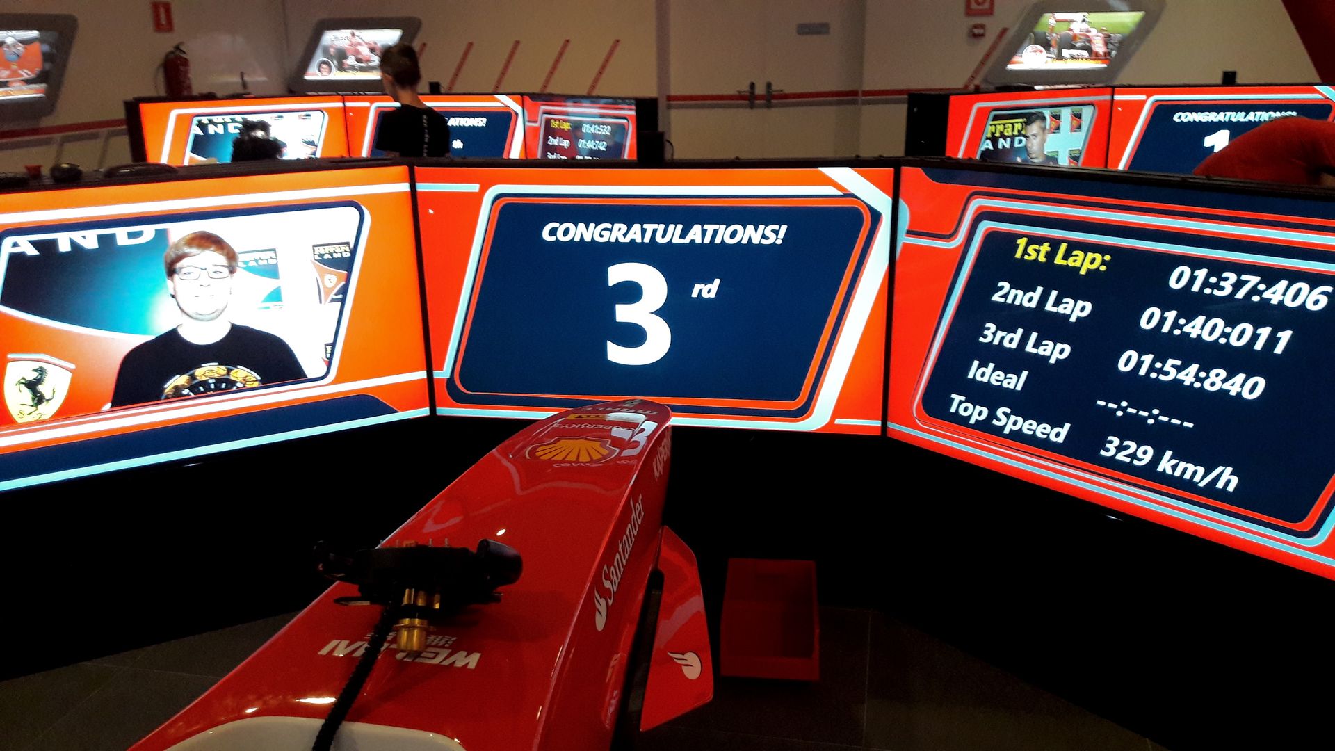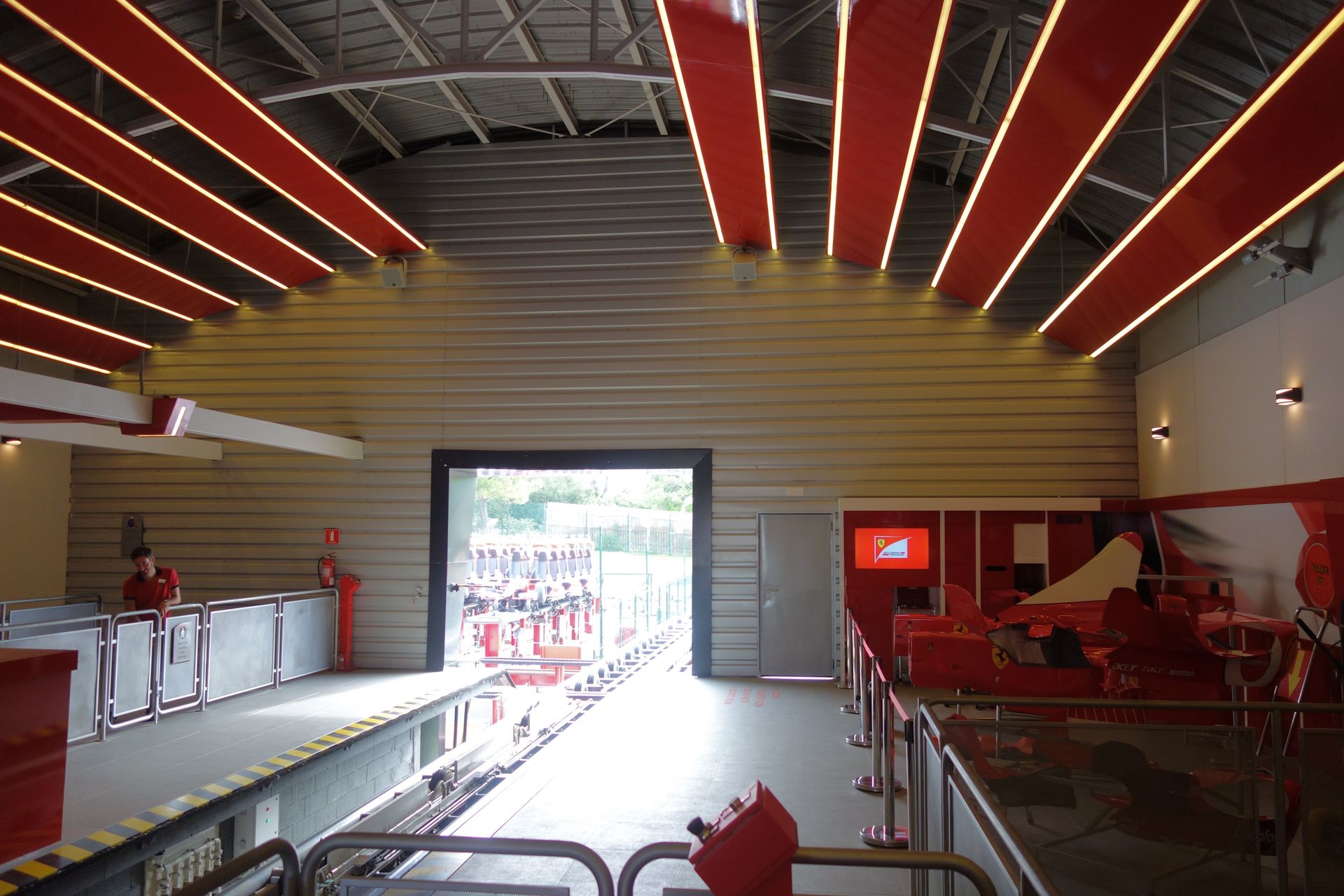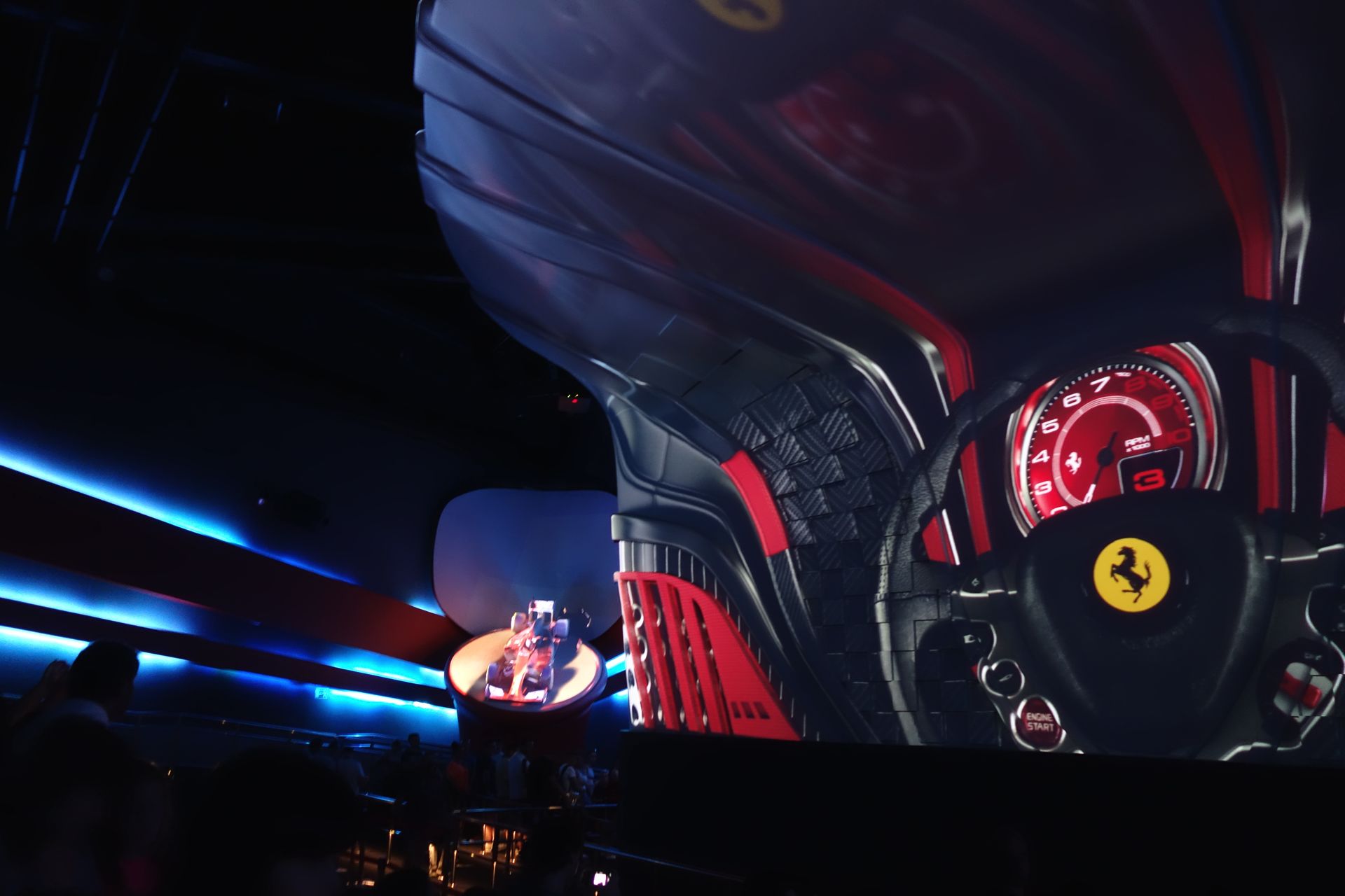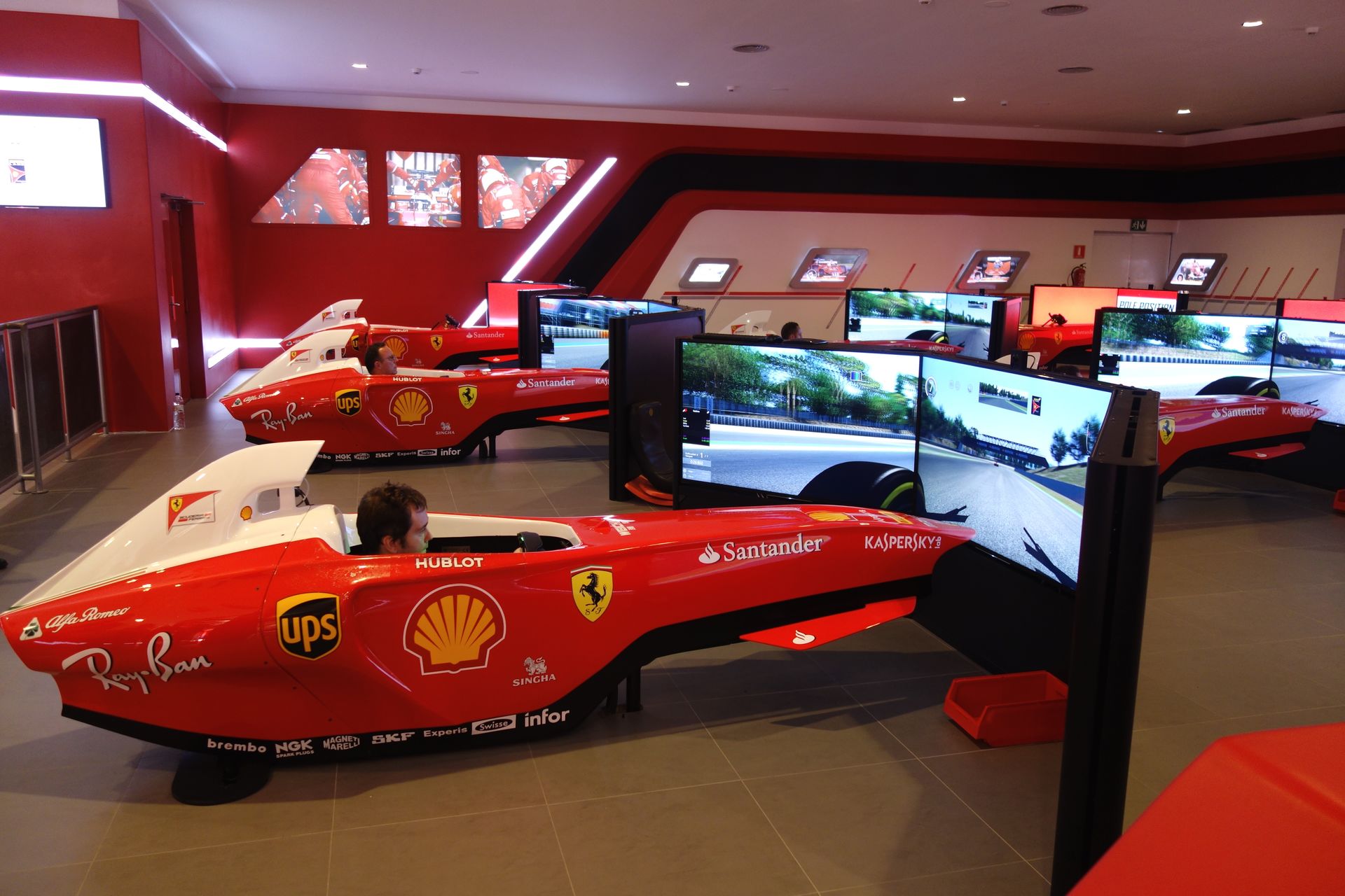 Etwas nervig ist es schon, dass man nochmal im gleichen Raum wie zuvor warten muss, man kann eben nicht mehr viel Neues entdecken. So zog sich die Wartezeit hier noch mehr in die Länge. Irgendwann schafft man es aber auch hier in die Pre-Shows und wird schließlich auf verschiedene Türen aufgeteilt - erneut nur auf einer von drei Ebenen. Dahinter verbergen sich jeweils 8-sitzige Simulatorgondeln von Simworx, die sich allesamt eine große Kuppelleinwand teilen. Also im Grunde ein Simpsons Ride in billig. Man nimmt quasi an einem simulierten Rennen teil, bei dem man in verschiedenen Jahren die verschiedensten Strecken befährt, um sich als künftiger Ferrari-Fahrer zu empfehlen. Sonderlich realistisch sind die Fahrmanöver allerdings nicht, da sind ja sogar ältere Computerspiele besser. Und die Bewegungen dazu sind fast noch schlimmer. Mit Abstand die schwächste Attraktion des ganzen Parks. Wobei die verschiedenen Ferrari-Accessoires im Pre-Show-Bereich (beispielsweise Helme und Handschuhe der aktuellen F1-Stars) schon eine ganz spezielle Atmosphäre erzeugen - zumindest bei mir als Fan.