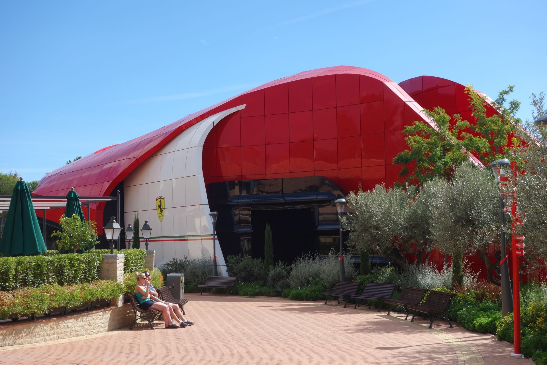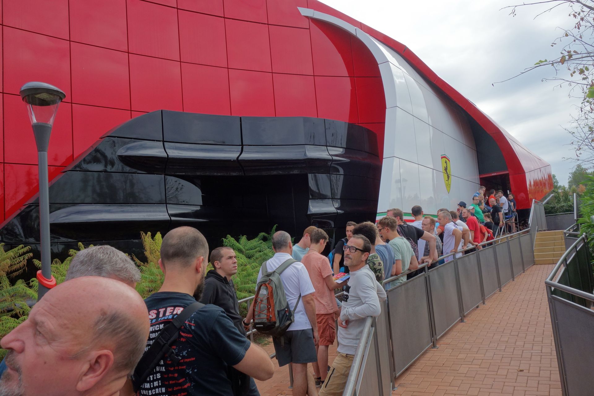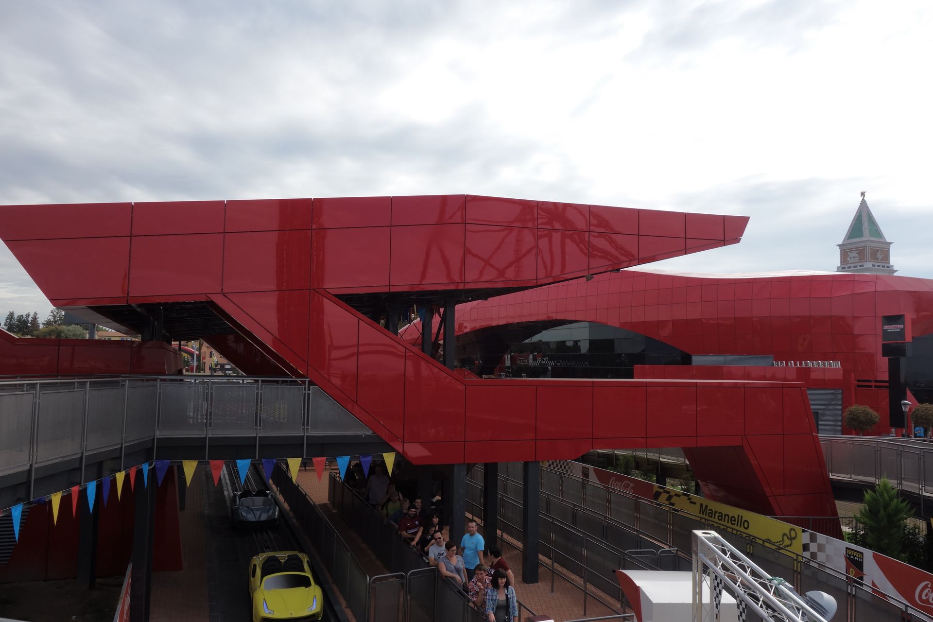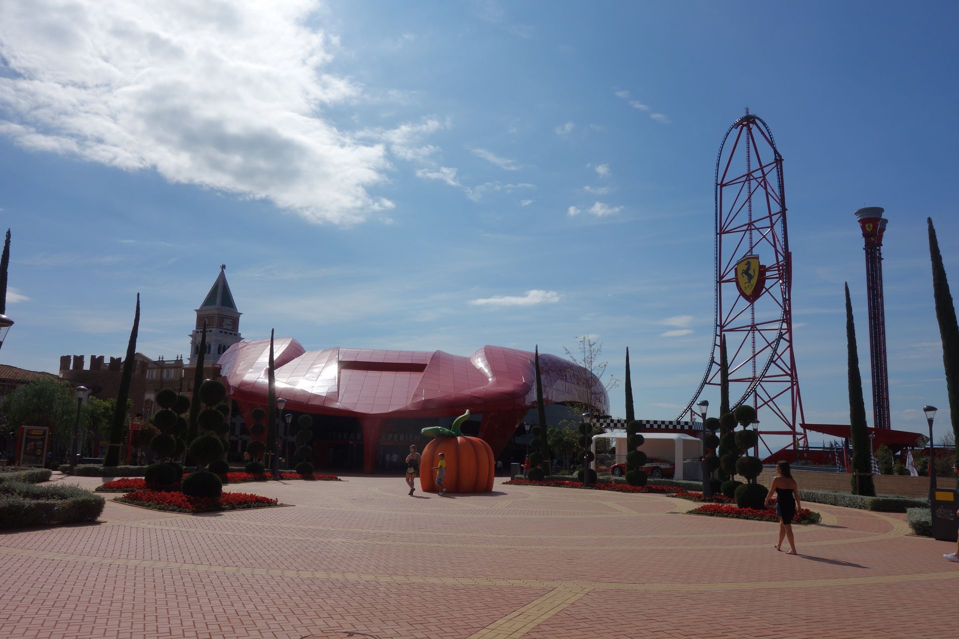 Über die Piazza Maranello und vorbei an einem riesigen Gebäude mit Motorhauben-Dach zog es uns natürlich zunächst zur höchsten Attraktion des Ferrari Landes.