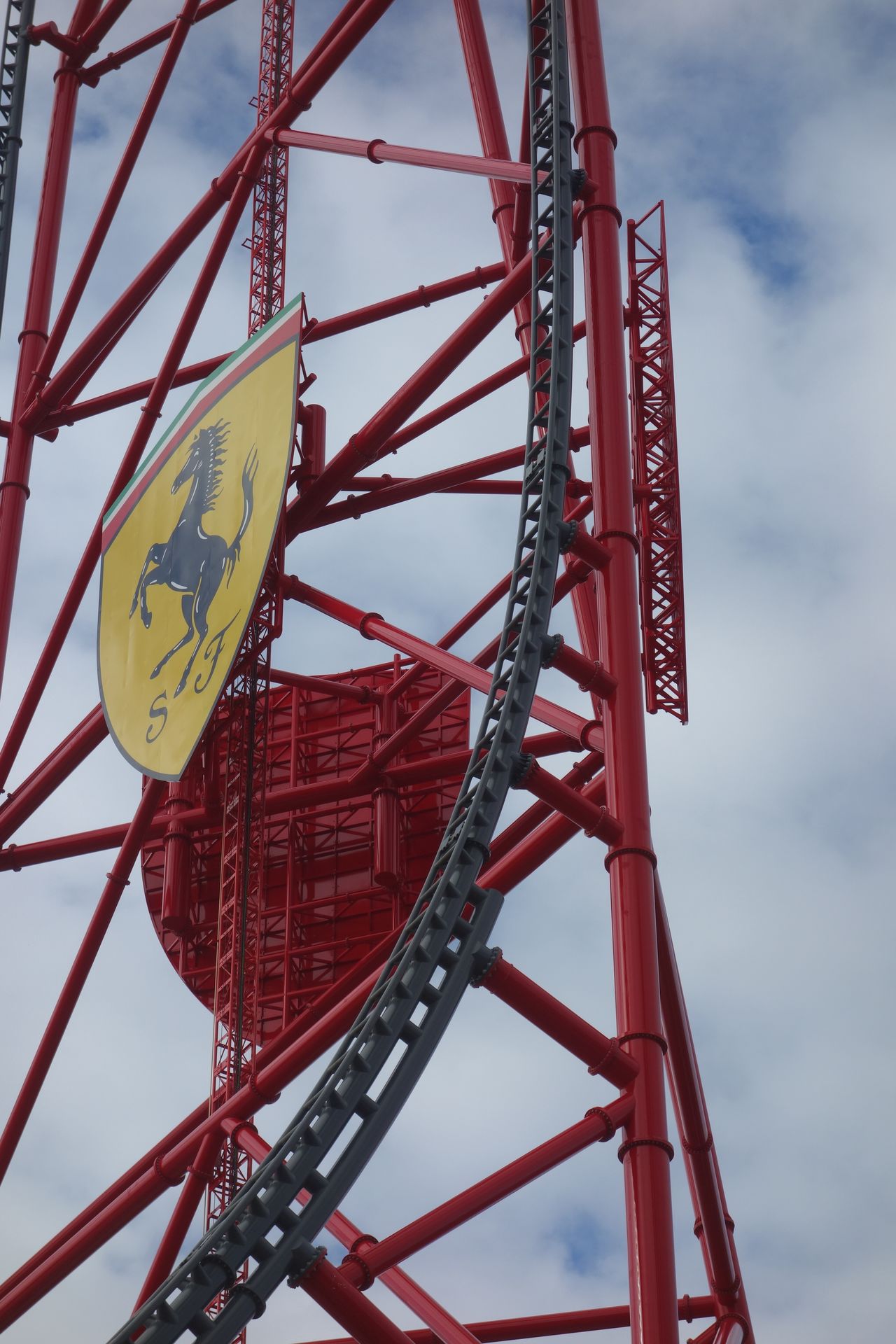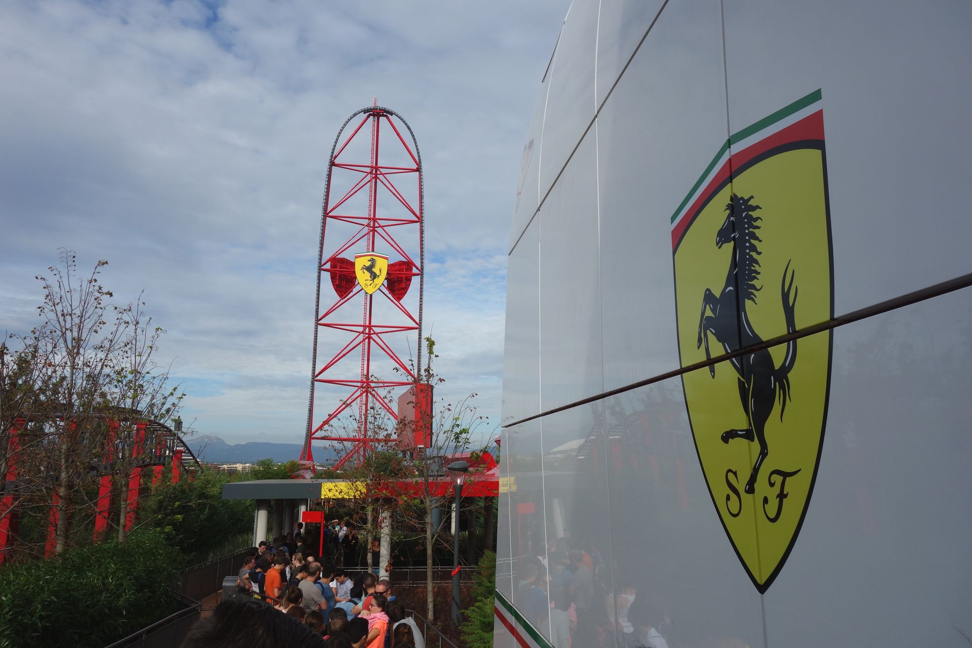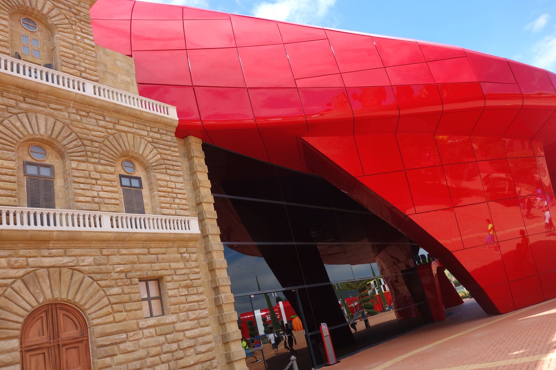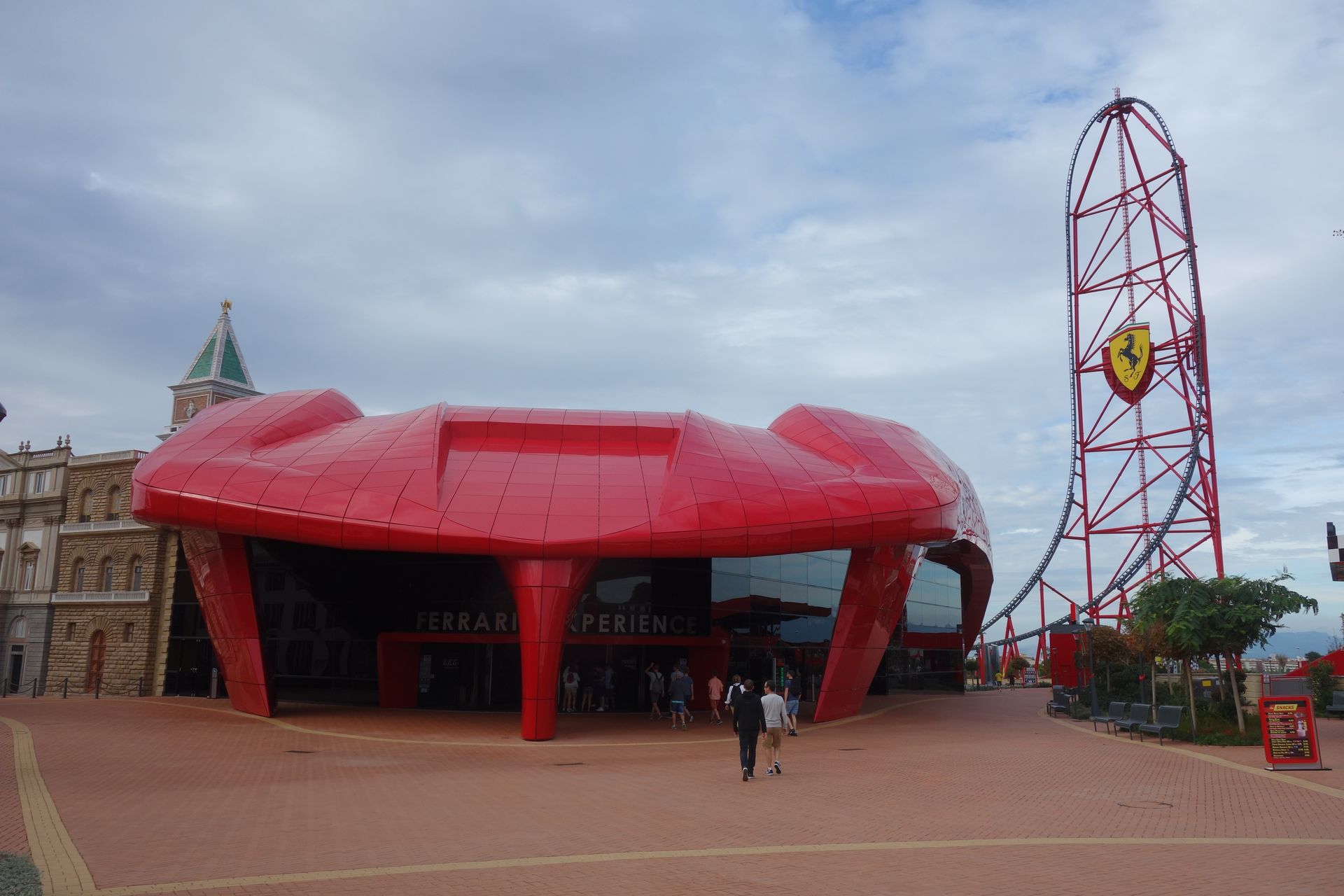 Über die Piazza Maranello und vorbei an einem riesigen Gebäude mit Motorhauben-Dach zog es uns natürlich zunächst zur höchsten Attraktion des Ferrari Landes.