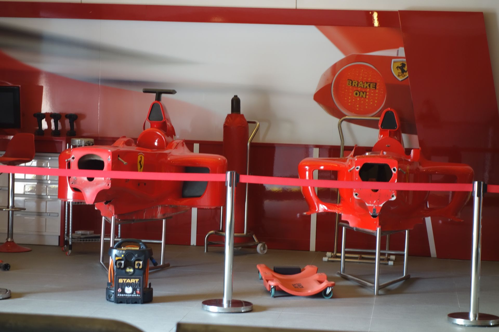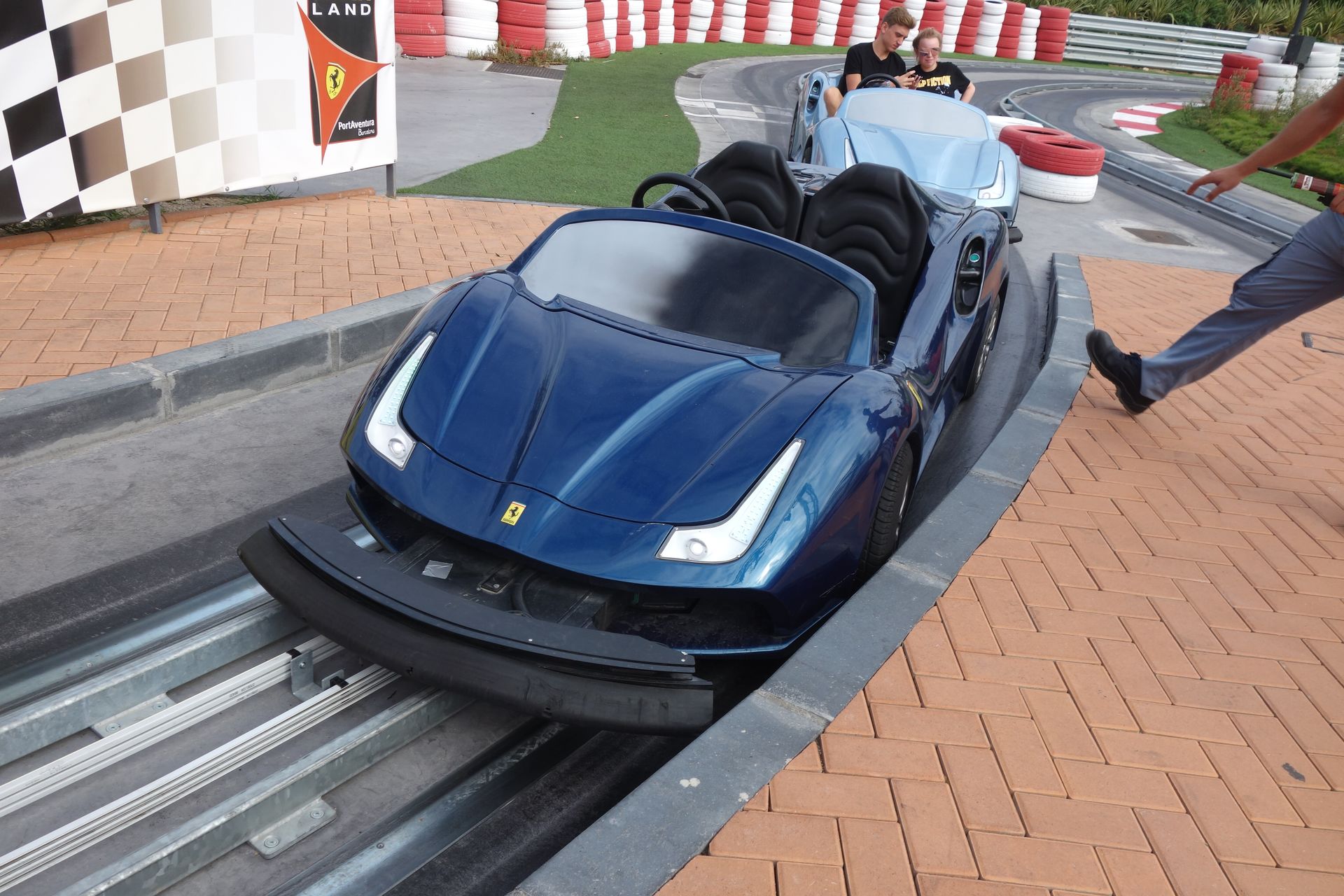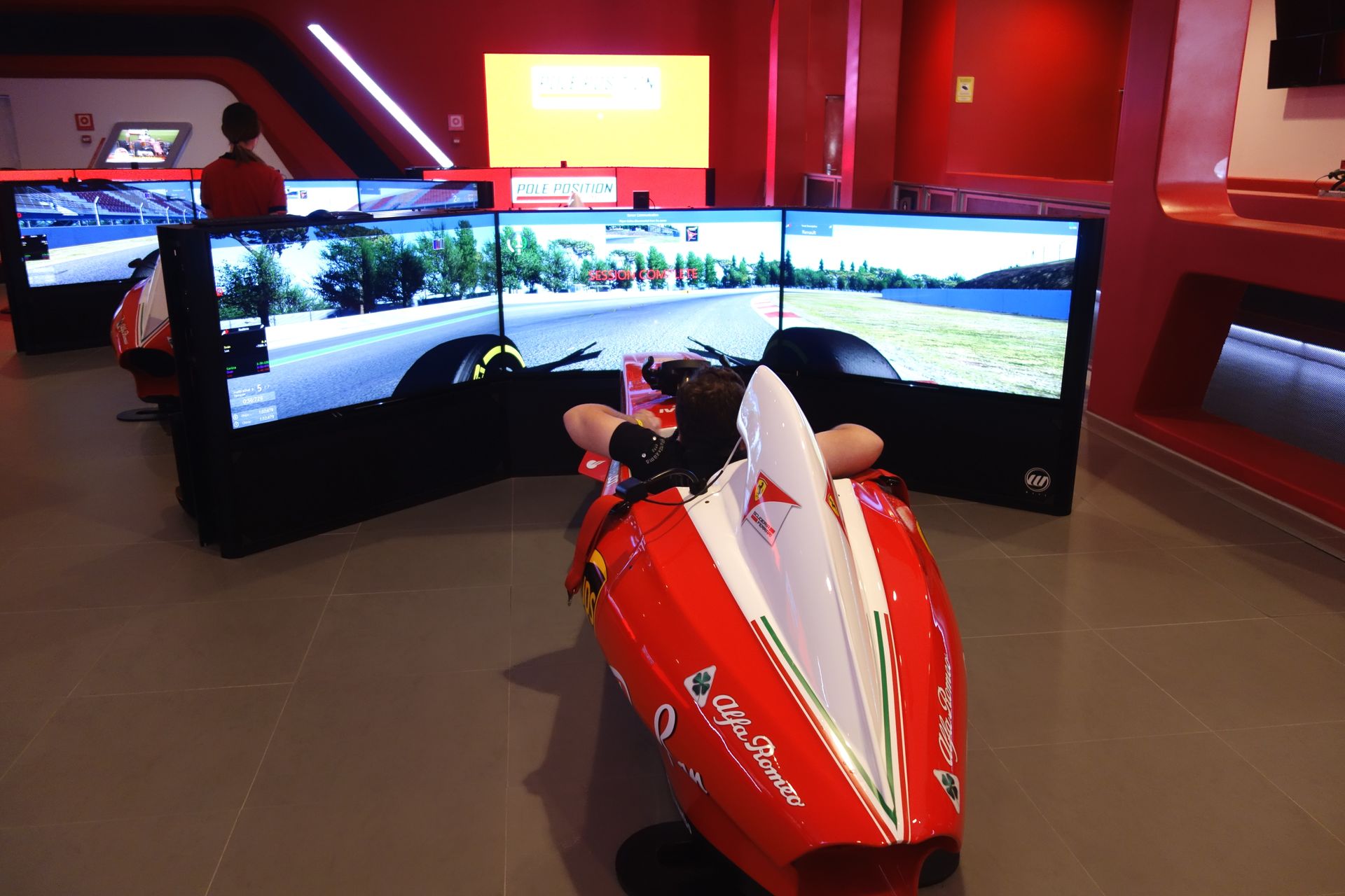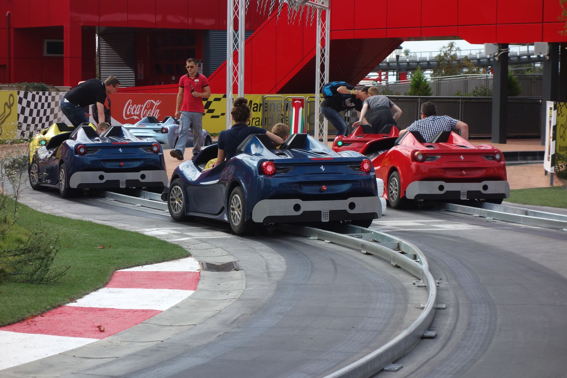 Hier kann man dann tatsächlich mal selber Ferrari fahren. Wenn auch eine Schiene zu große Abweichungen vom vorgegeben Fahrweg verhindert.