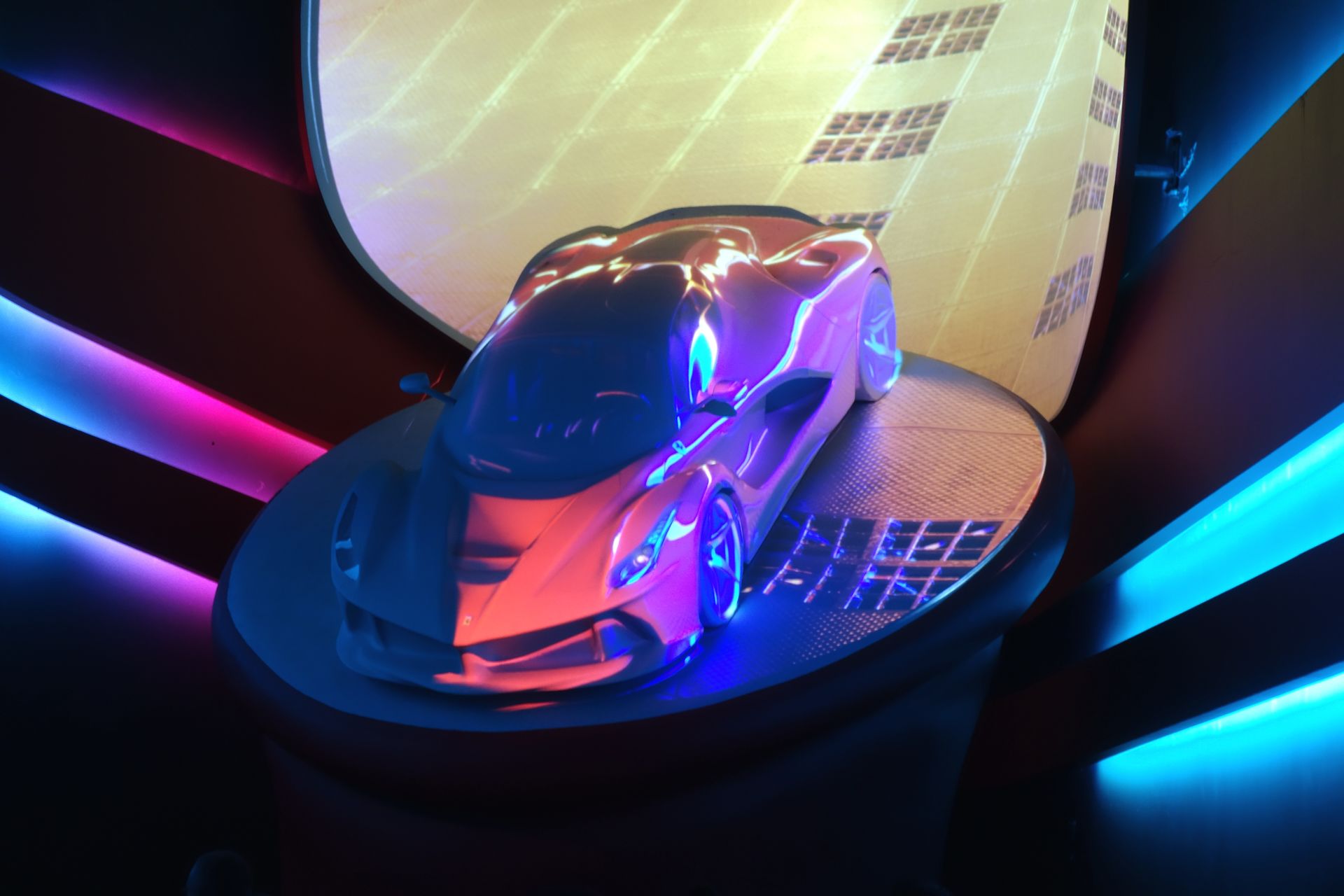 Dazu kommen eine große Leinwand, auf der natürlich der Mythos Ferrari gefeiert wird, sowie zwei mit Videomapping versehene Modelle in den Ecken.