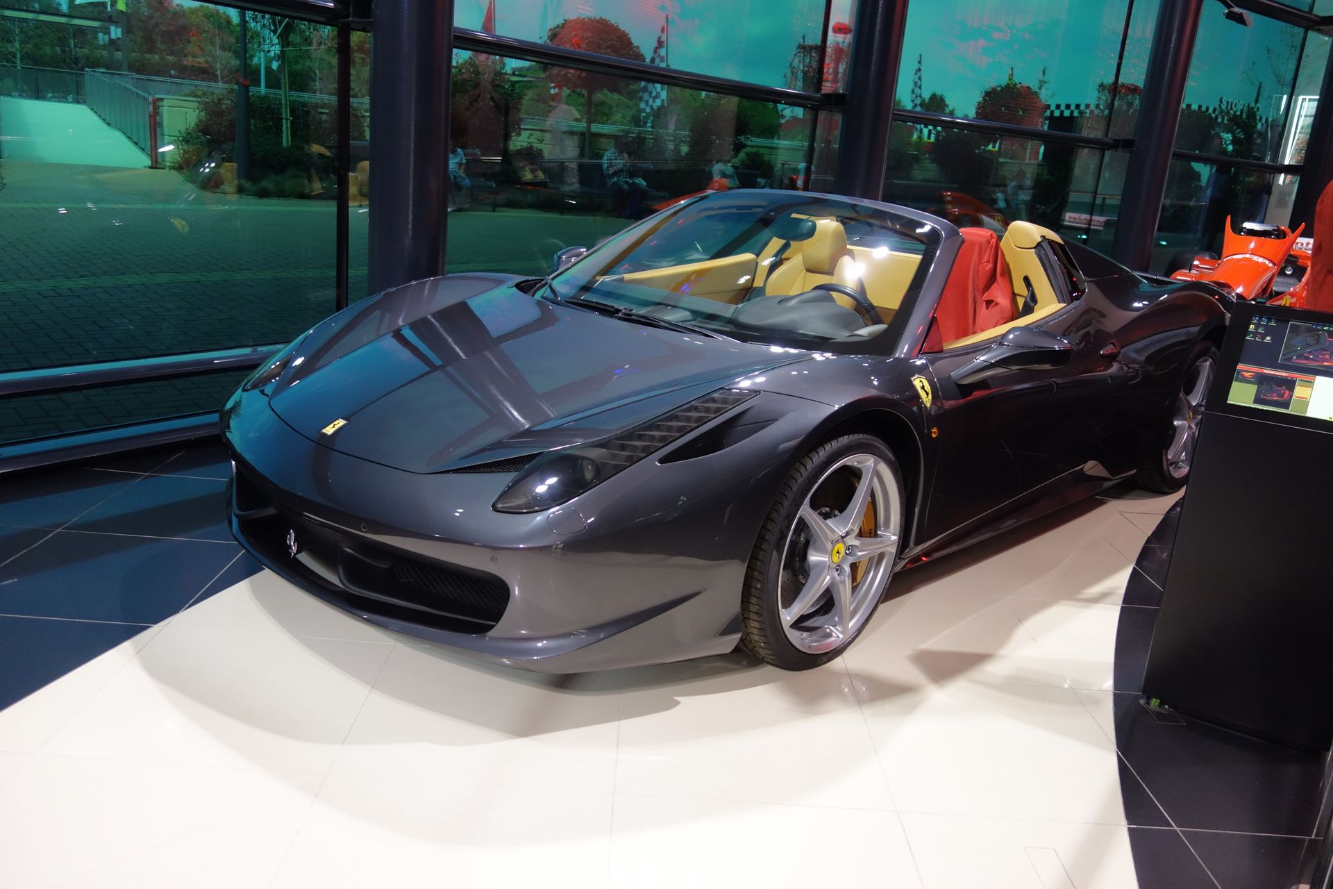 Wer noch immer etwas Kleingeld übrig hat, kann sich auch mal in einem echten Ferrari (458 Spider) sitzend fotografieren lassen.