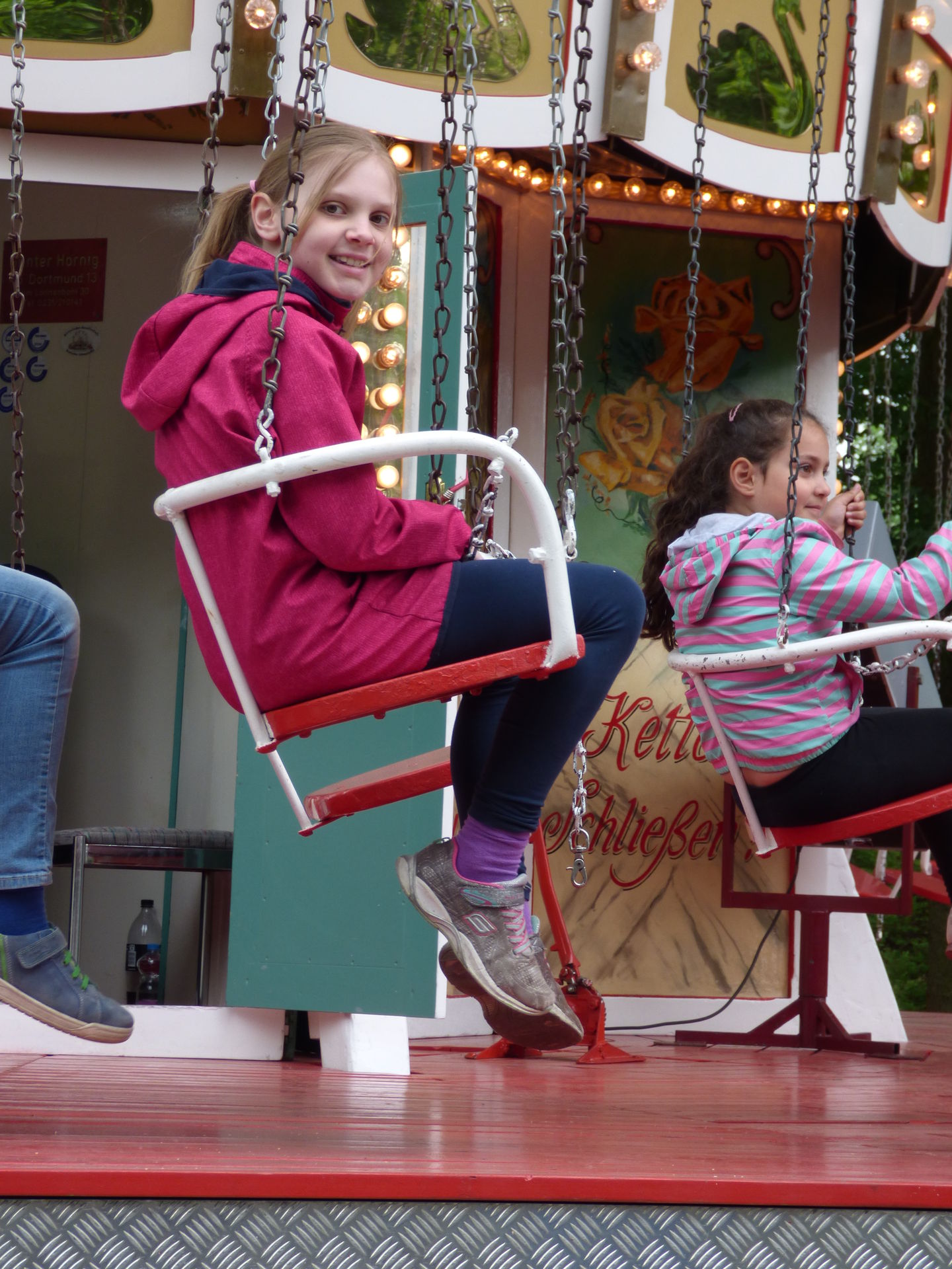 Traditionell beginnt die Kirmes mit einem Gottestdienst auf der Fläche des Auto Skooters, bevor dann um 11.30 Uhr die Kirmes mit drei Böllerschüssen eröffnet wird. Anschließend gibt es eine halbe Stunde Freifahrten auf allen Fahrgeschäften. Mia nutzte die Gunst der Stunde und begann den Kirmesbummel mit einer Runde auf der Kinderschleife. Da sind die Grenzen bei der Kleinen immer noch sehr verschwommen, heute ab in den Hexentanz, morgen dann van Helsing und dann an Tagen wie diesen auch gerne mal wieder Kinderschleife. Aber hey, die Kleine soll das machen, was ihr Spaß macht.