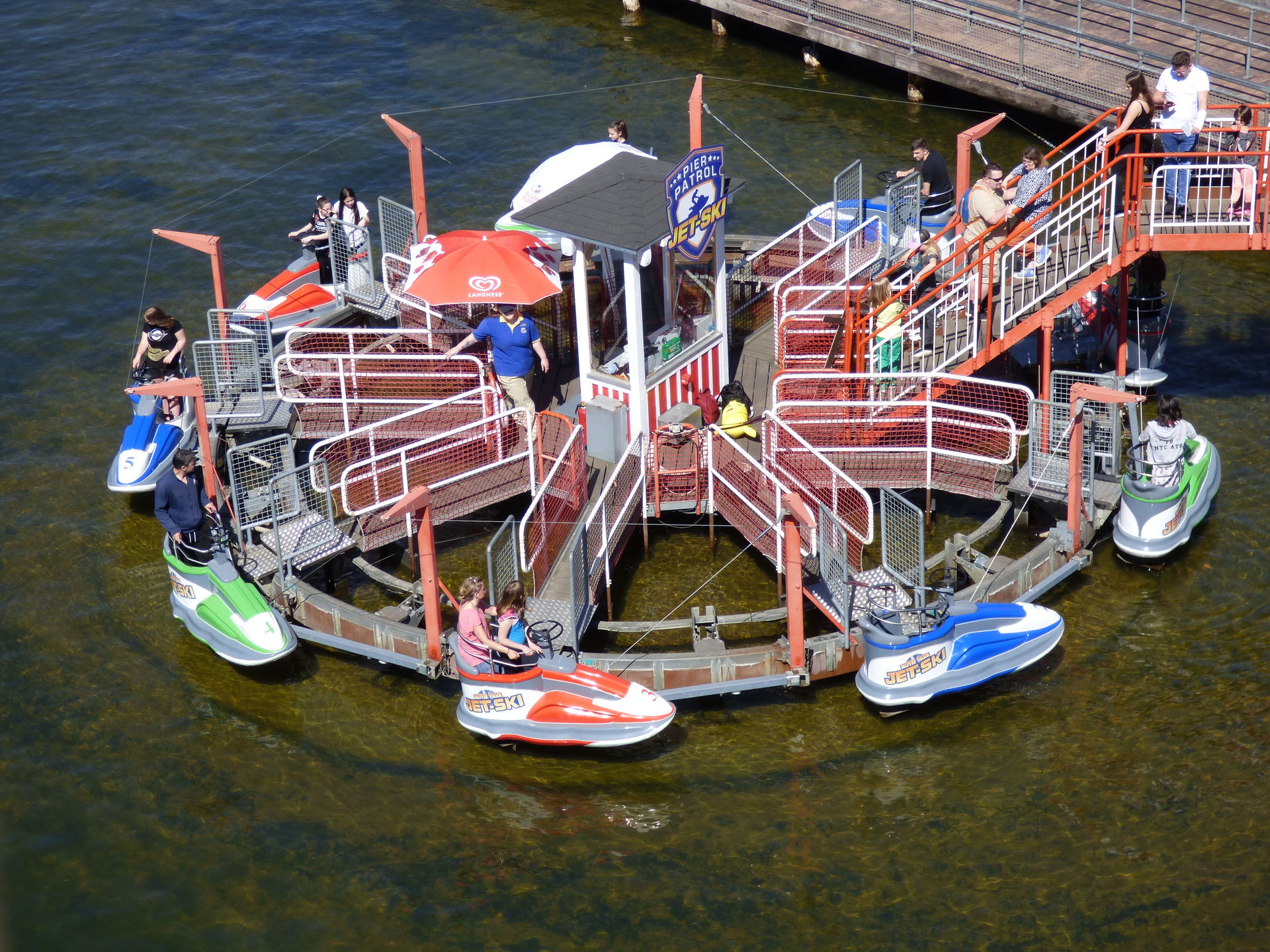 Zierer natürlich an und somit findet man diese beliebte Attraktion auch hier am Santa Monica Pier. Es trägt den Namen Pier Patrol-Jet Ski und bietet maximal 18 Personen in 9 Gondel pro Fahrt ein feucht fröhliches Erlebnis. Wenn man mit dem Gerät einigermaßen umgehen kann, schafft man es hier auch wunderbar, die Zuschauer am Rand nass zu machen. Man muss halt wissen wie es geht.