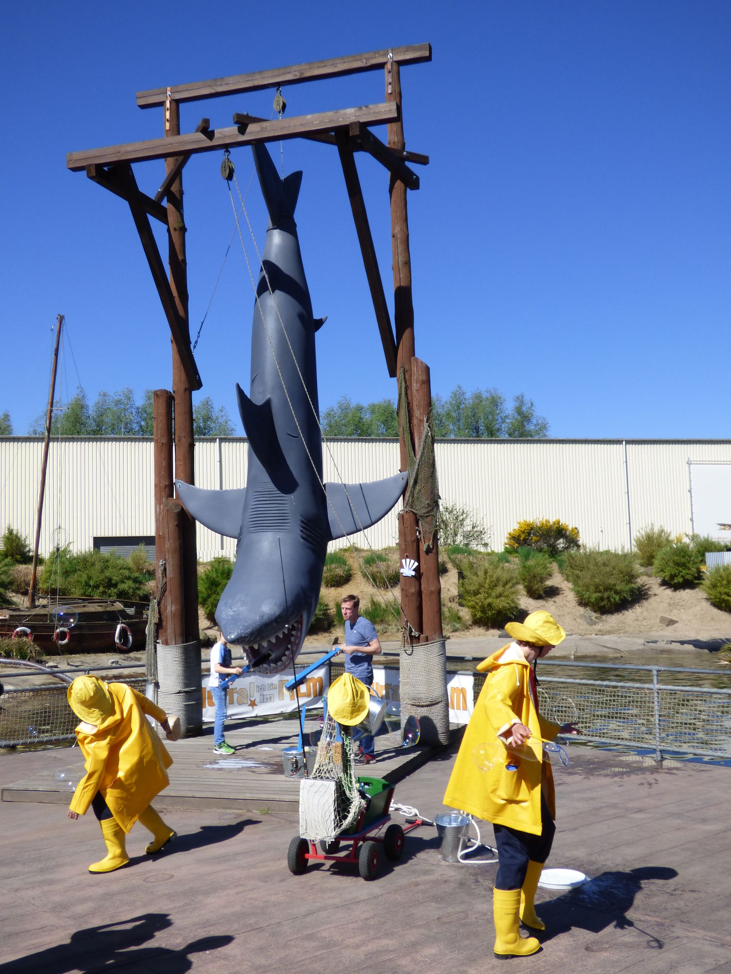 Direkt nach Betreten des Piers trifft man auf der linken Seite auf den schönen Foto Point mit dem über Kopf hängenden Hai. Hier gibt es in dieser Saison auch über den Tag verteilt immer wieder lustiges, kleines Street Entertainment. Da werden die Besucher animiert, dem Hai die Zähne zu putzen, die Blumen am Wegesrand zu gießen und große Seifenblasen können auch gemacht werden. Eine nette kleine Showeinlage, zumal hier auch immer Leute sind, die entweder Schnappschüsse mit dem Hai machen oder aber in der kleinen Ruhezone daneben verweilen.