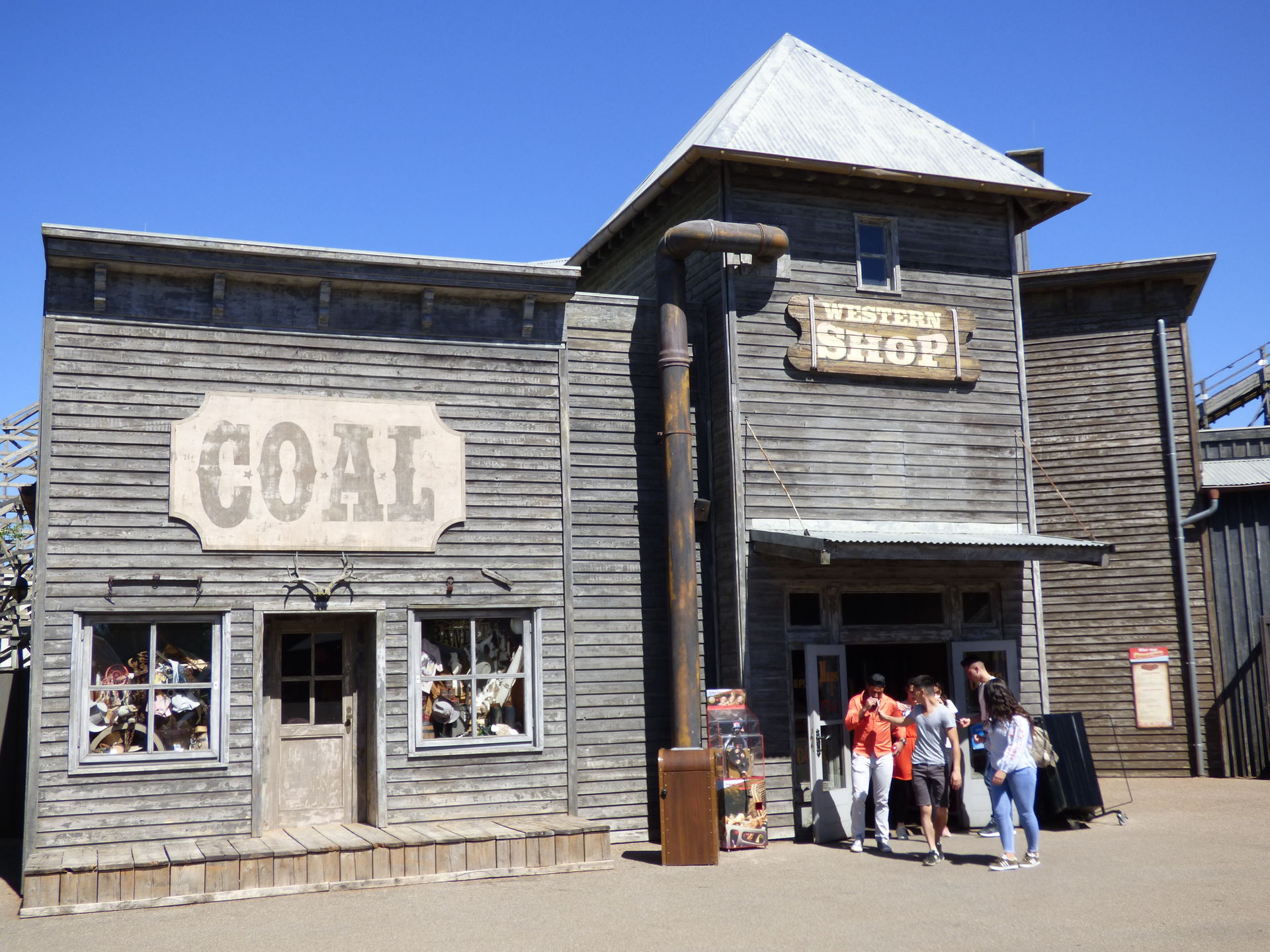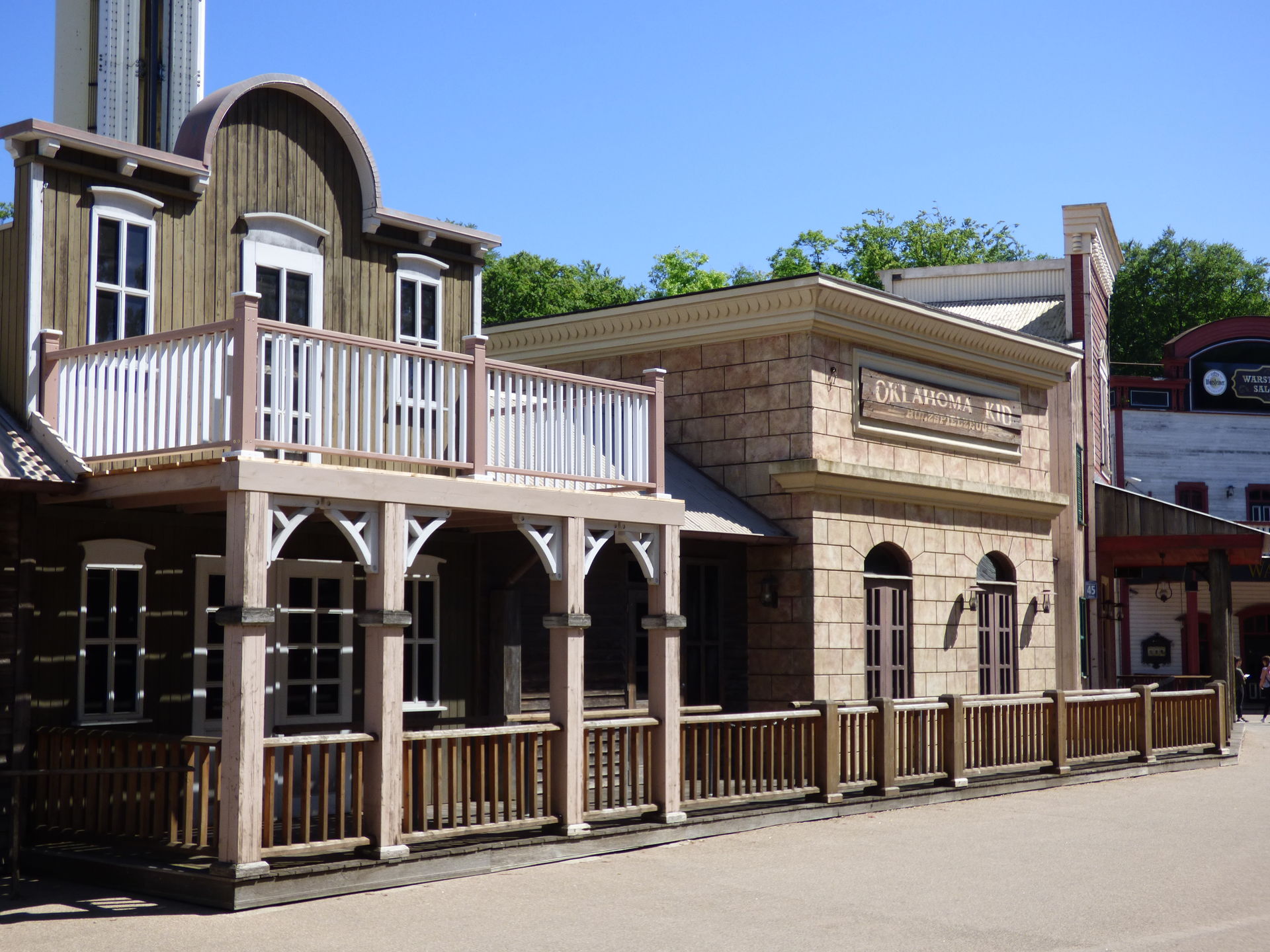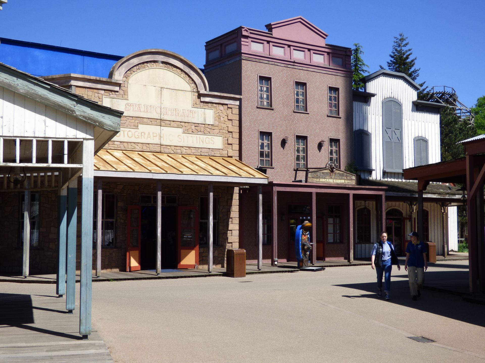 Wie man auf den folgenden Fotos sieht, zerstören die eigentlich gar nichts, weil sie halt komprimiert an einer Stelle auftreten. Ich habe mich mittlerweile dran gewöhnt. Und den Rest des Themenbereichs genieße ich einfach. Ich mag dieses Western Theming einfach und bin über jede Westernstadt froh, die in den Parks noch erhalten bleibt.