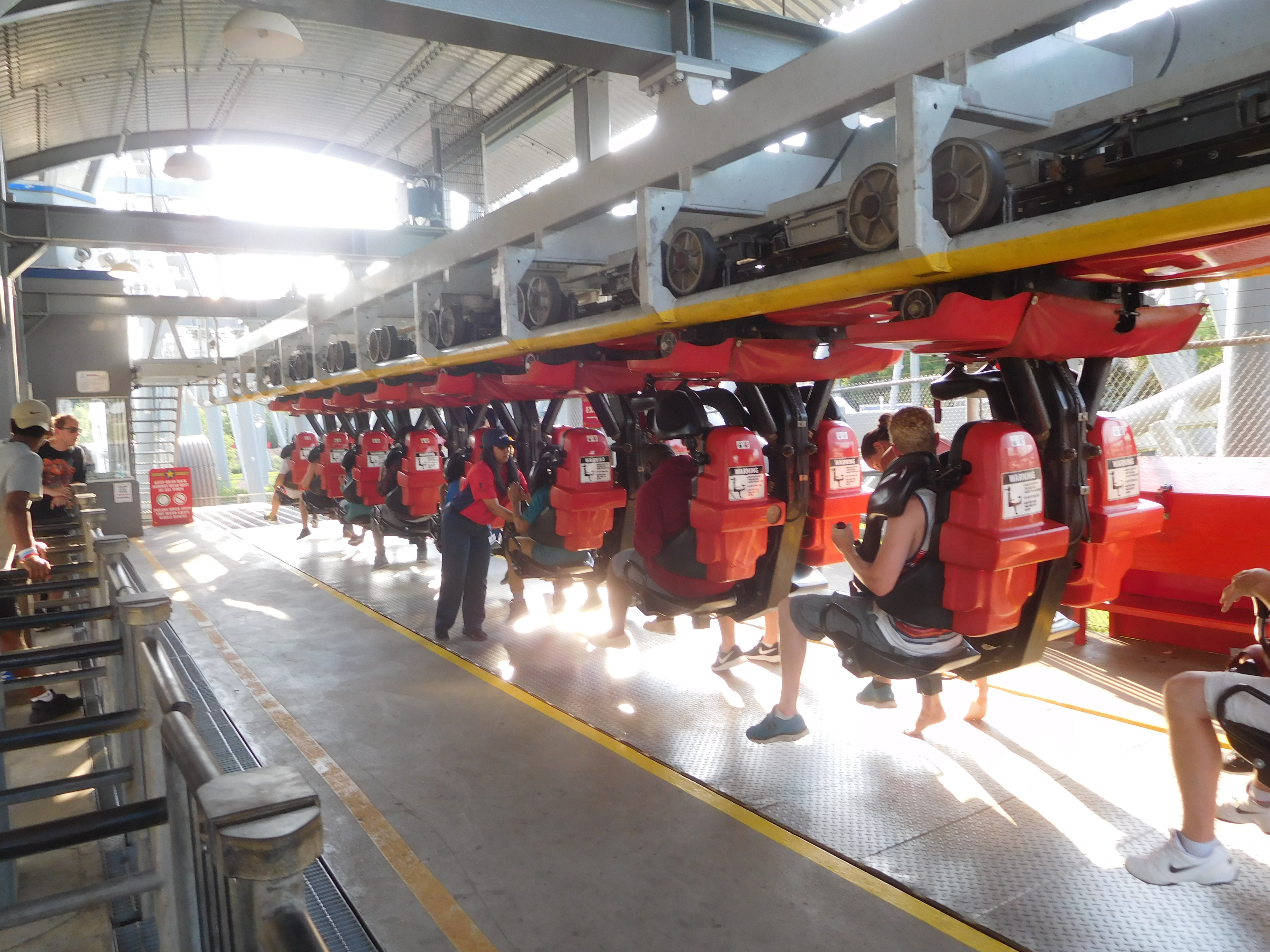 Trotz der langen Warteschlange mussten wir nur 20 Minuten warten, da sie alle Wagen drin hatten und es so trotz geringer Kapazität relativ flott voranging. In der Station steigt man am Wagen dann eine Treppe hinauf und stellt sich zunächst an seinen Platz. Dann wird das Gitter hinter einem geschlossen und beim Verlassen der Station wird der Wagen in Flugposition gedreht.