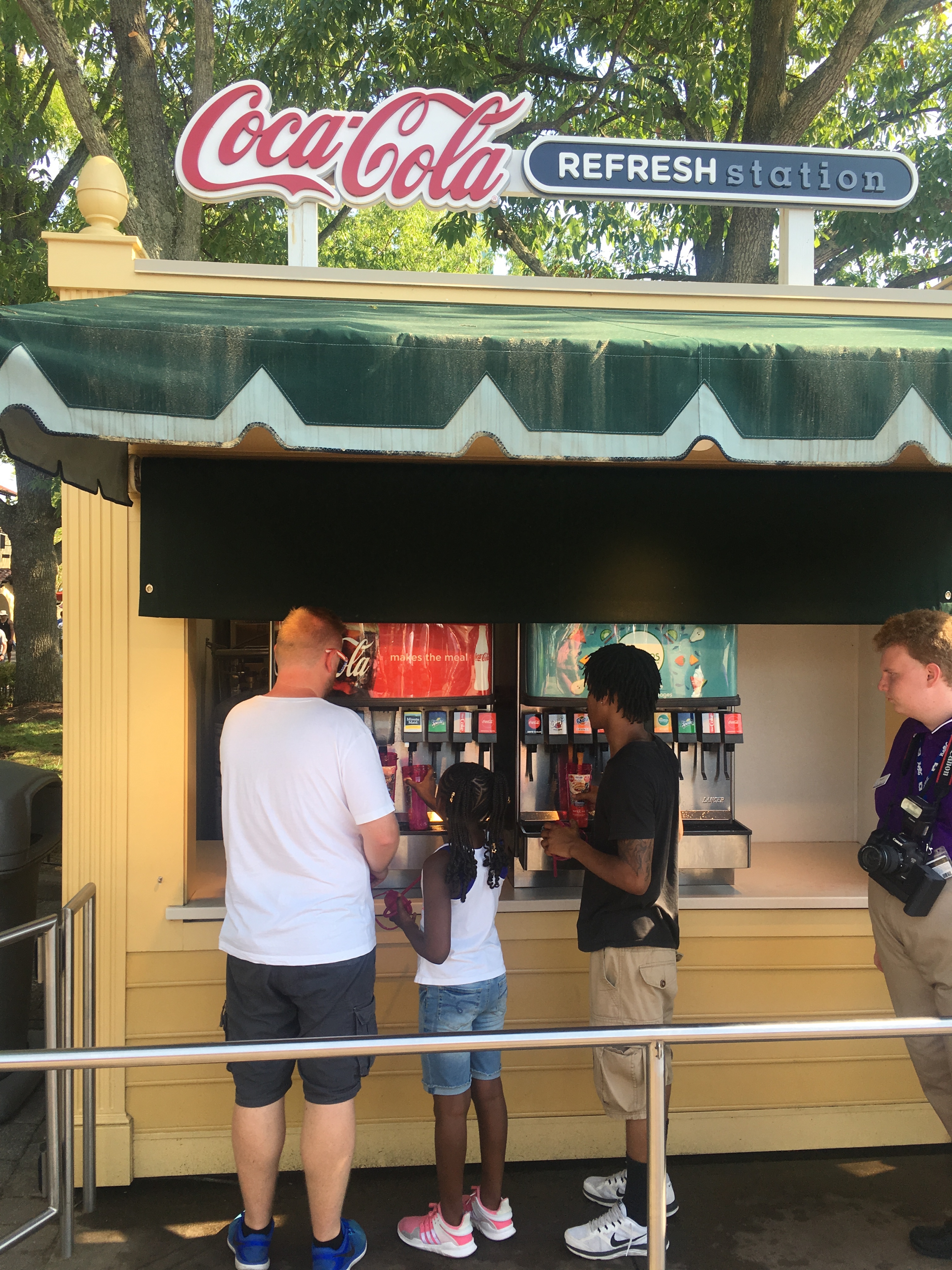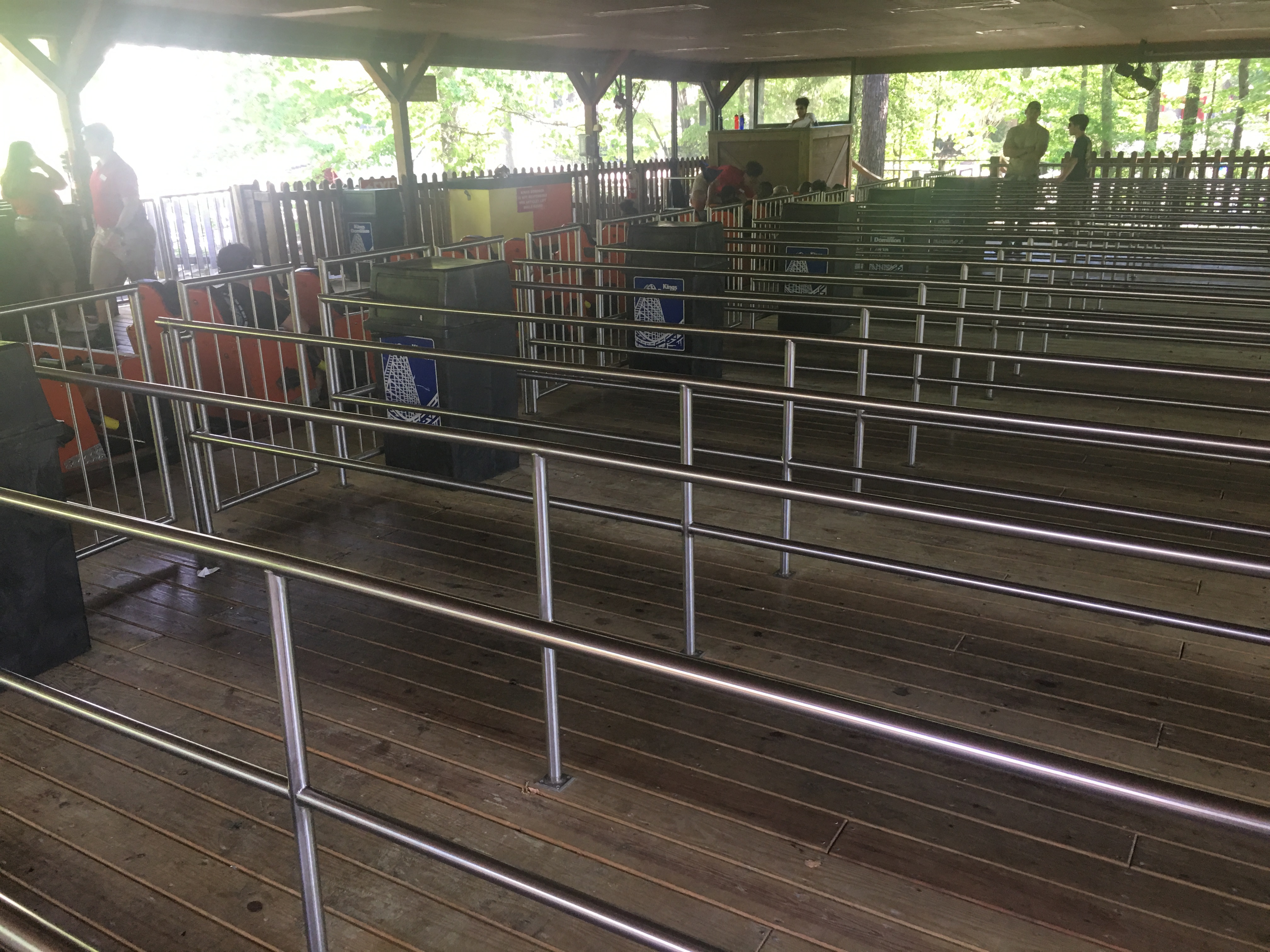 Ich vermute, man hat gemerkt, dass die Anzahl der Wartenden gestiegen ist, und man möchte wohl nun den zweiten Zug auf den Track holen. Nach Technikern wird gefunkt, die auch nach ein paar Minuten zu viert in der Station ankommen. Aber wie sich herausstellt, geht es nicht um den zweiten Zug, sondern um ein Problem mit der Stationseinfahrt. Der Zug will scheinbar nicht mehr. Knöpfe werden ein- und ausgeschaltet und es wird diskutiert. Ein paar von den Ride-Ops beginnen Plastikbecher mit Wasser in der Station bereitzustellen - schließlich sitzen die Leute im Zug schon gut zehn Minuten in der prallen Sonne. Mir selbst kommen Bedenken, ob ich das auch erleben möchte.