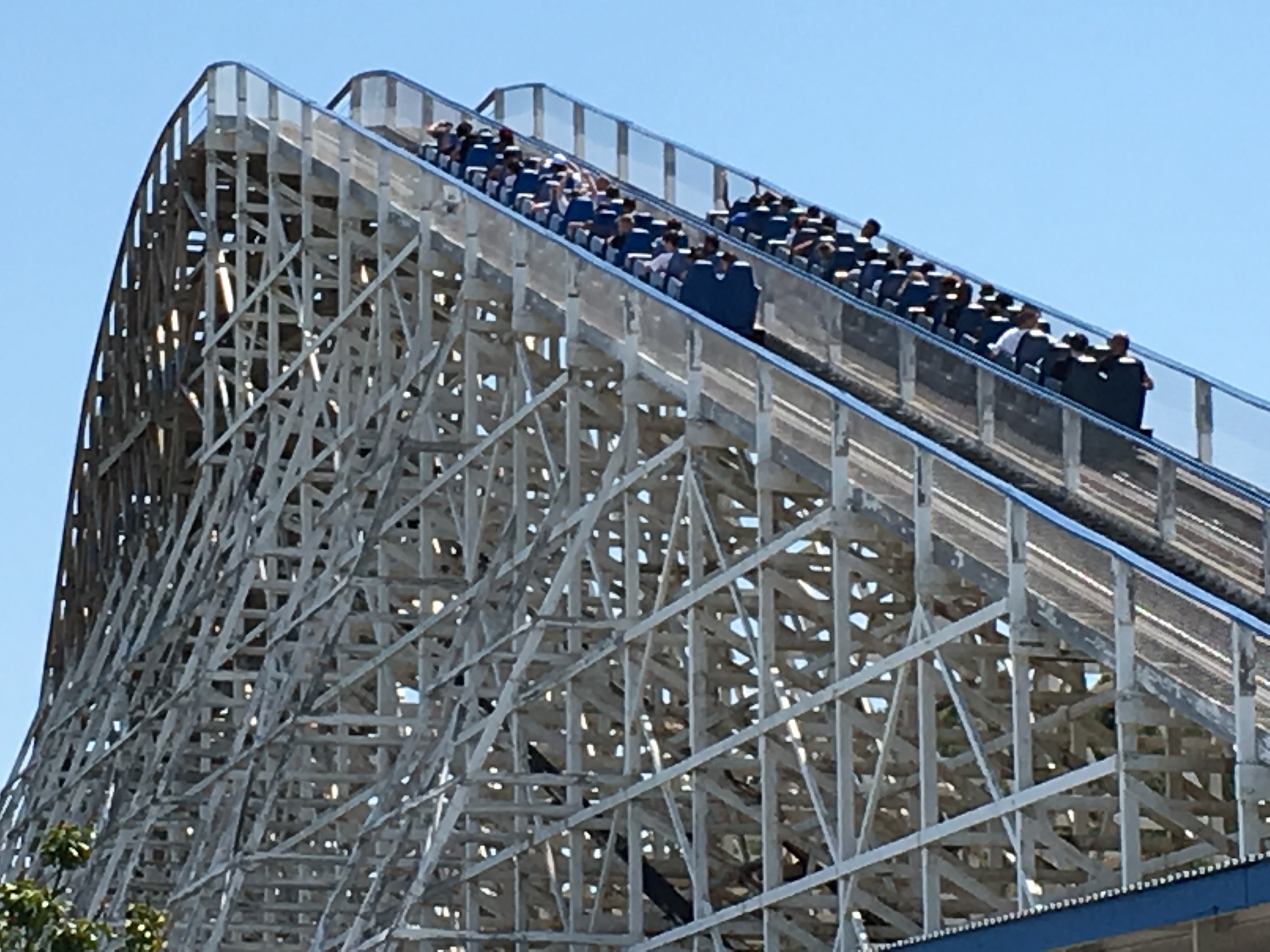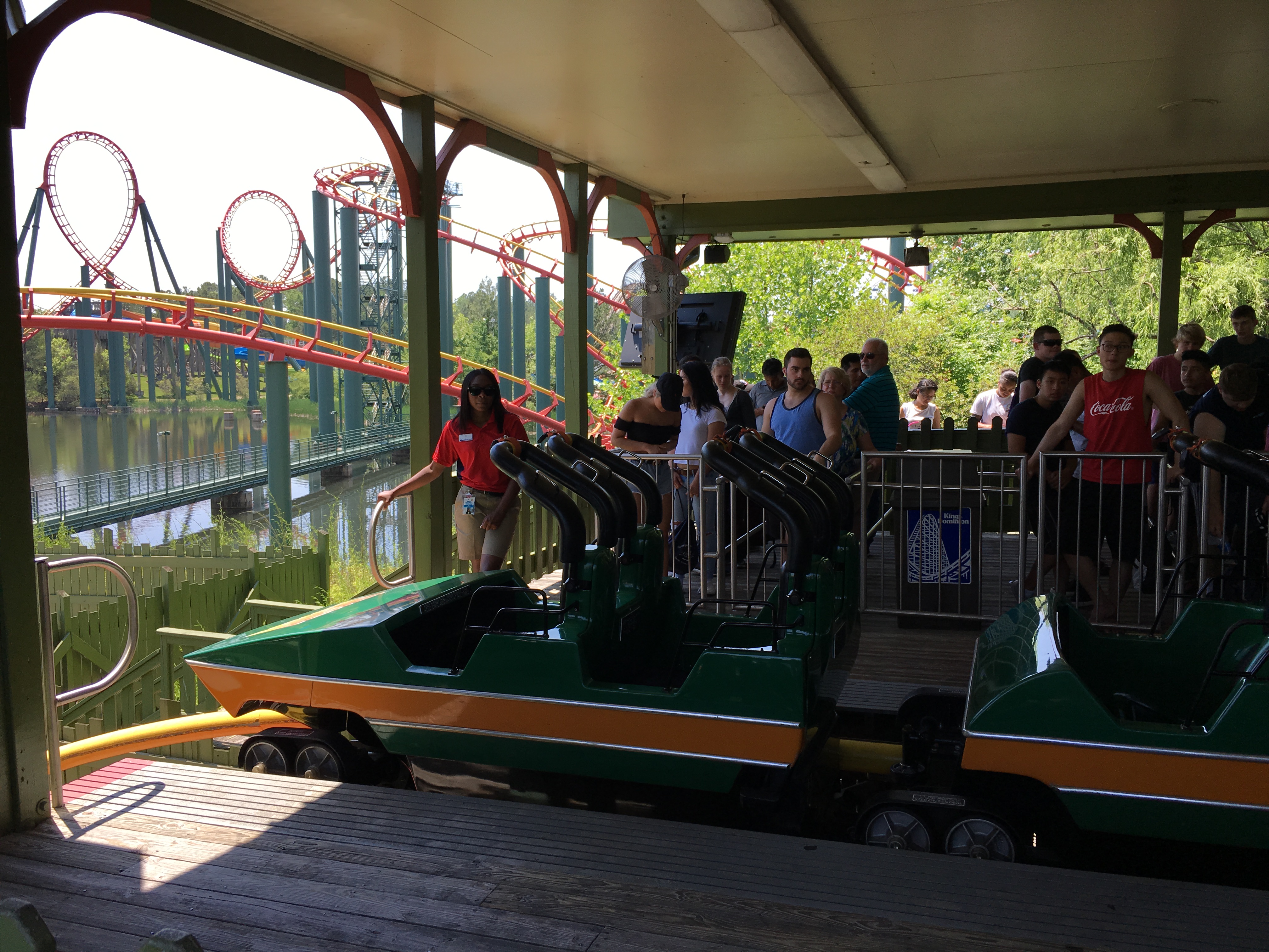 Inversion. Recht zügig dieses gedrehte Holz mit einem spaßigen Ende. Aber definitiv nicht zu einer Wiederholungsfahrt bei zweieinhalb Stunden Wartezeit im Einzugbetrieb einladend.