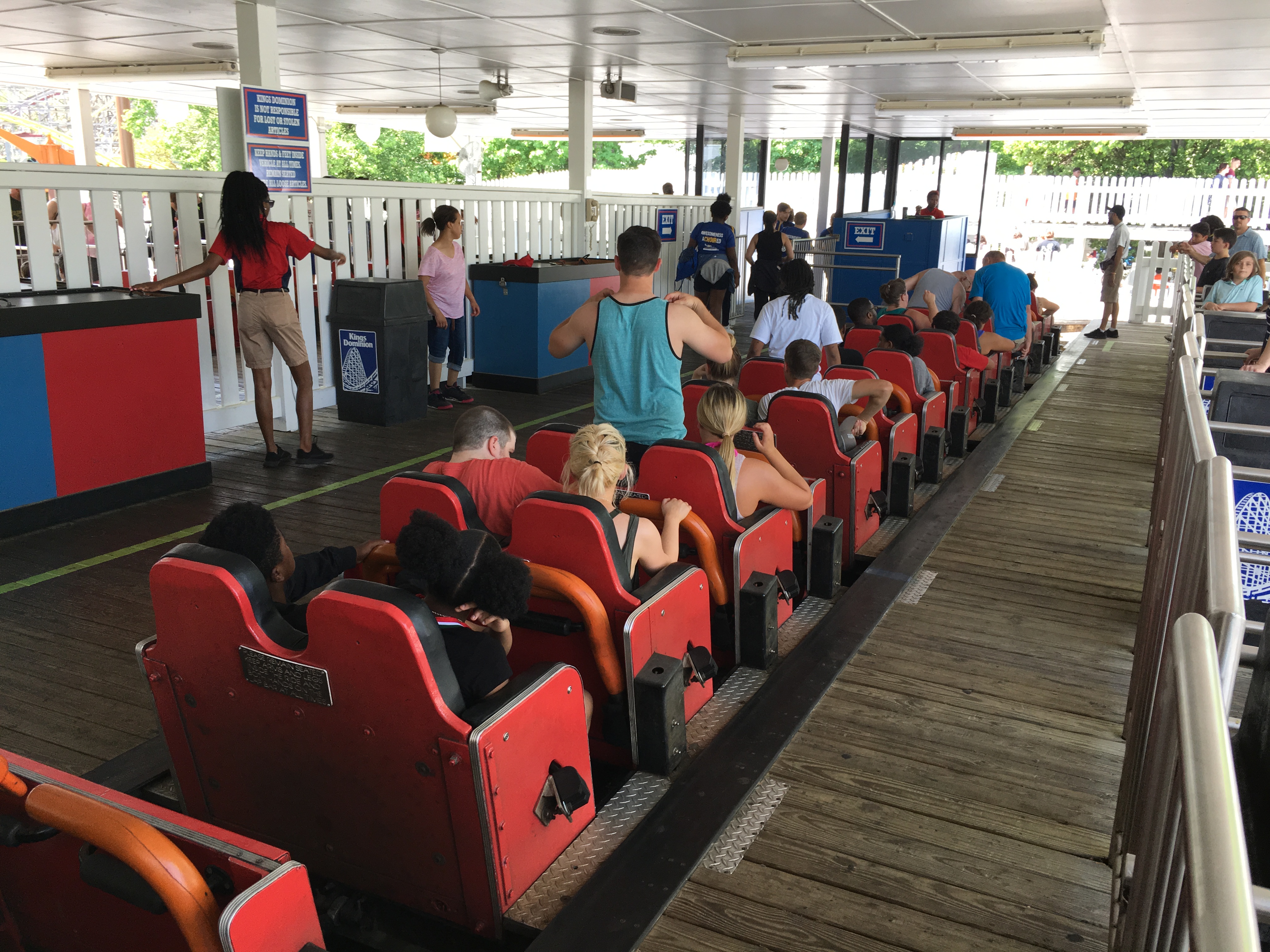 Nach einer gefühlten Ewigkeit rollt der Zug dann doch unter Klatschen in die Station. Was nicht so gut klappt ist das Verteilen der Wasserbecher. Die meisten Mitfahrer bekommen gar nicht mit, dass es Vorbereitungen für das Aussteigen gegeben hatte. Okay jetzt noch eine Leerfahrt, dann die vor uns ... und dann fahren wir mit Twisted Timbers. Zwei Stunden nachdem wir den Park betreten haben.