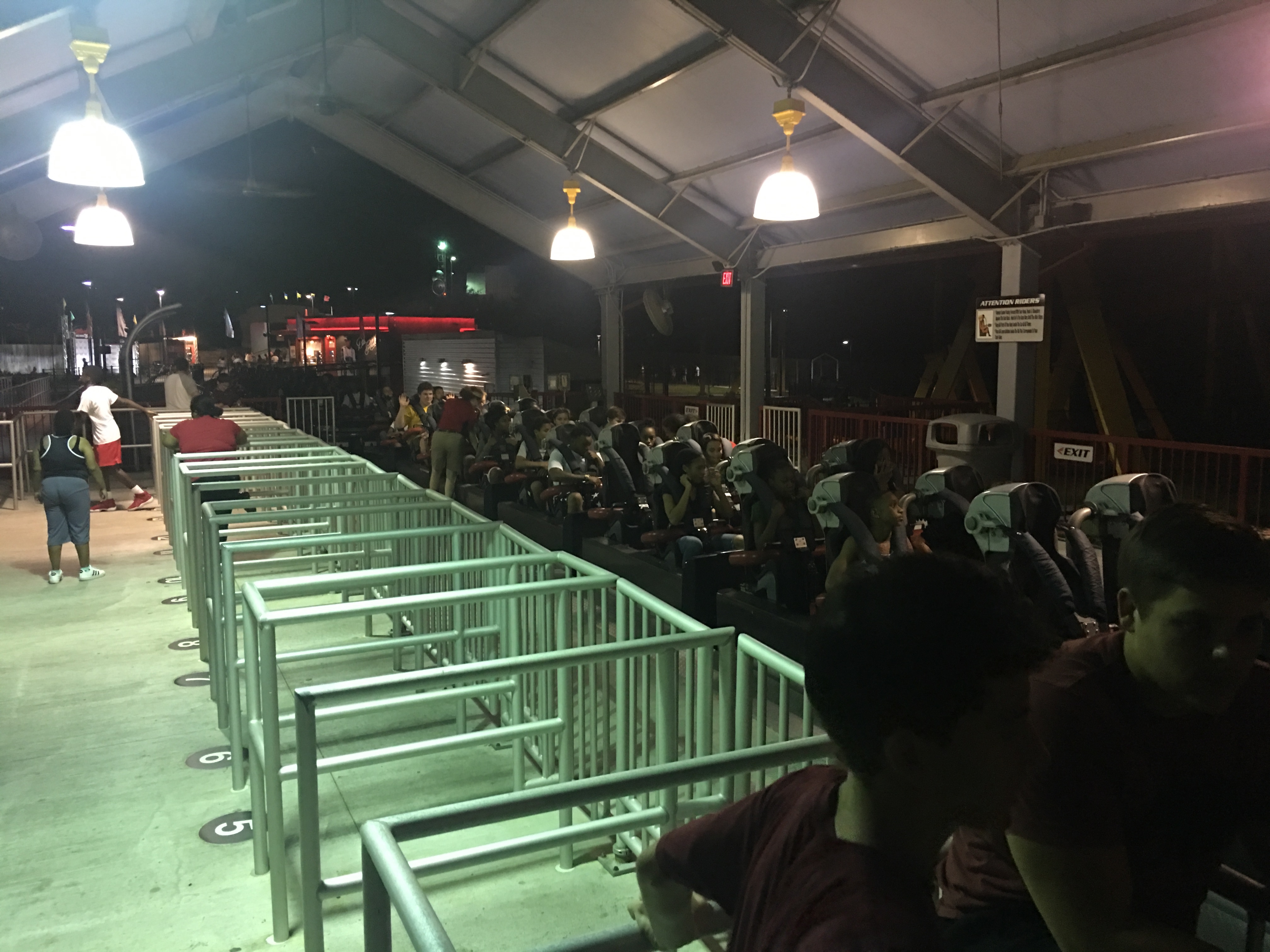Nach einem kurzen Warten auf der Treppe hinauf zur Station, die schon im vormittäglichen Sonnenlicht durchflutet daherkommt und mir den Schweiß aus den Poren treibt, kommen wir in der überdachten Station an. Hier sorgen Ventillatoren für Abkühlung. Es heißt noch ein paar Fahrten warten, bevor wir den Einlass passieren können und uns dann den gewünschten Sitzplatz aussuchen. Wir machen den fatalen Fehler unserem Motto treu zu bleiben "First Ride, First Row" - ca. zehn Menschen stehen vor uns dort an, so dass es ungefähr eine halbe Stunde noch dauern wird, bevor wir "boarden" können.