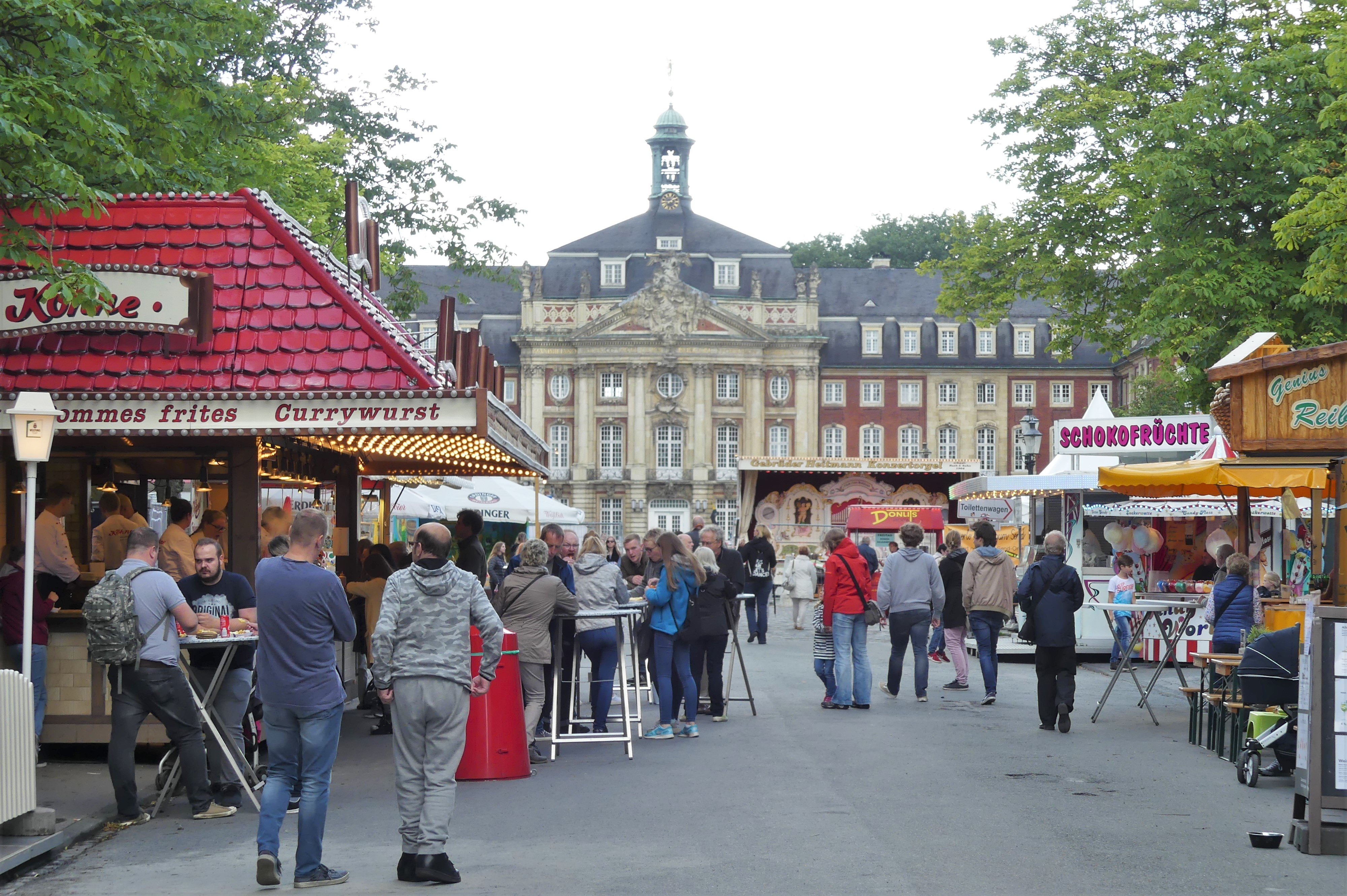 Gleich dreimal im Jahr findet in Münster der Send auf dem Schlossplatz statt. Im Sommer noch mit der urpsünglich üblichen Sendspielzeit von fünf Tagen. Hier und da wird schon die Sinnhaftigkeit der Sommerausgabe in Frage gestellt, da in Jahren mit frühem Ostertermin, der Früjahrssend erst Mitte bis Ende April statt findet, das heißt: In diesem Jahr war auf dem Schlossplatz zwischen Frühjahrs- und Sommerveranstaltung gerade mal 8 Wochen Kirmespause. Zunächst erweckte die aktuelle Sendausgabe am Freitagnachmitte tatsächlich den Eindruck in Münster herrsche ein wenig Kirmesmüdigkeit, was sich jedoch gegen Abend legte, denn dann (leider als ich meinen Fotorundgang schon abgeschlossen hatte) füllte sich der Platz deutlich und alle der sich vor Ort befindlichen Fahrgeschäfte hatten gut zu tun. Die Beschickung fiel jedoch recht einseitig aus. Wirkliche Hochfahrgeschäfte neben dem Riesenrad suchte man auf dem Platz vergebens. Dafür gab es - vor allem auf der Südhälfte des Platzes - ein regelrechtes Rundfahrgeschäftsfestival: Insgesamt wurden sieben Varianten der Kreisfahrt geboten (mal abgesehen von den Kinderfahrgeschäften).