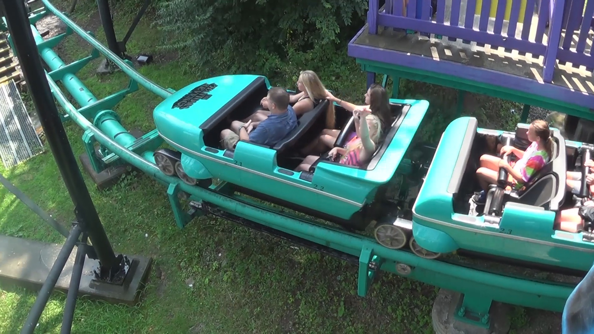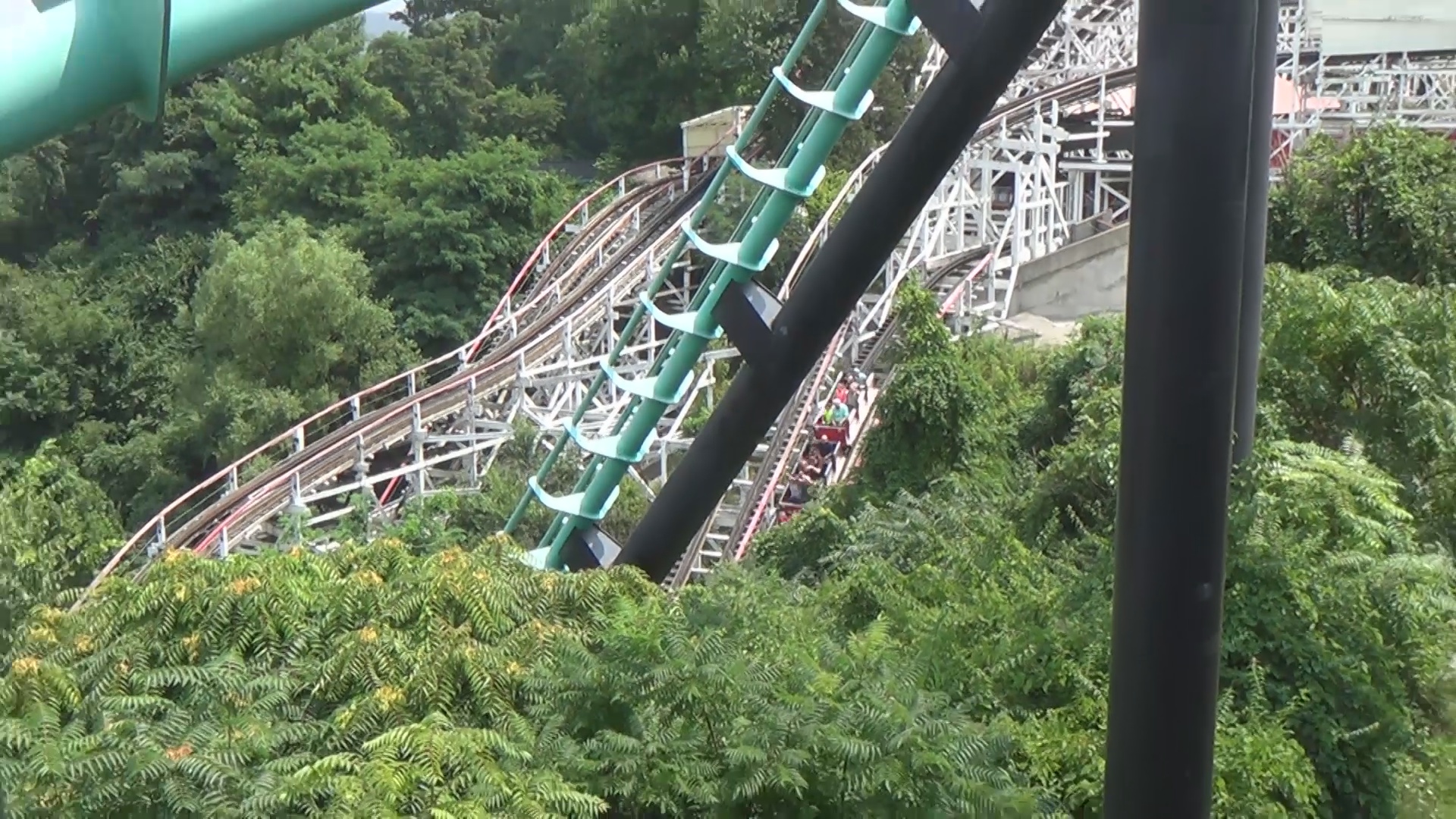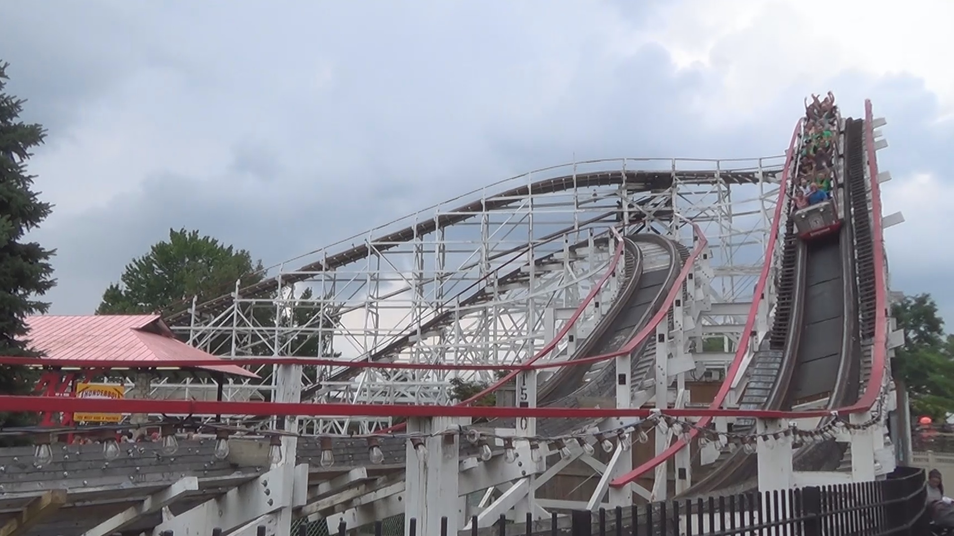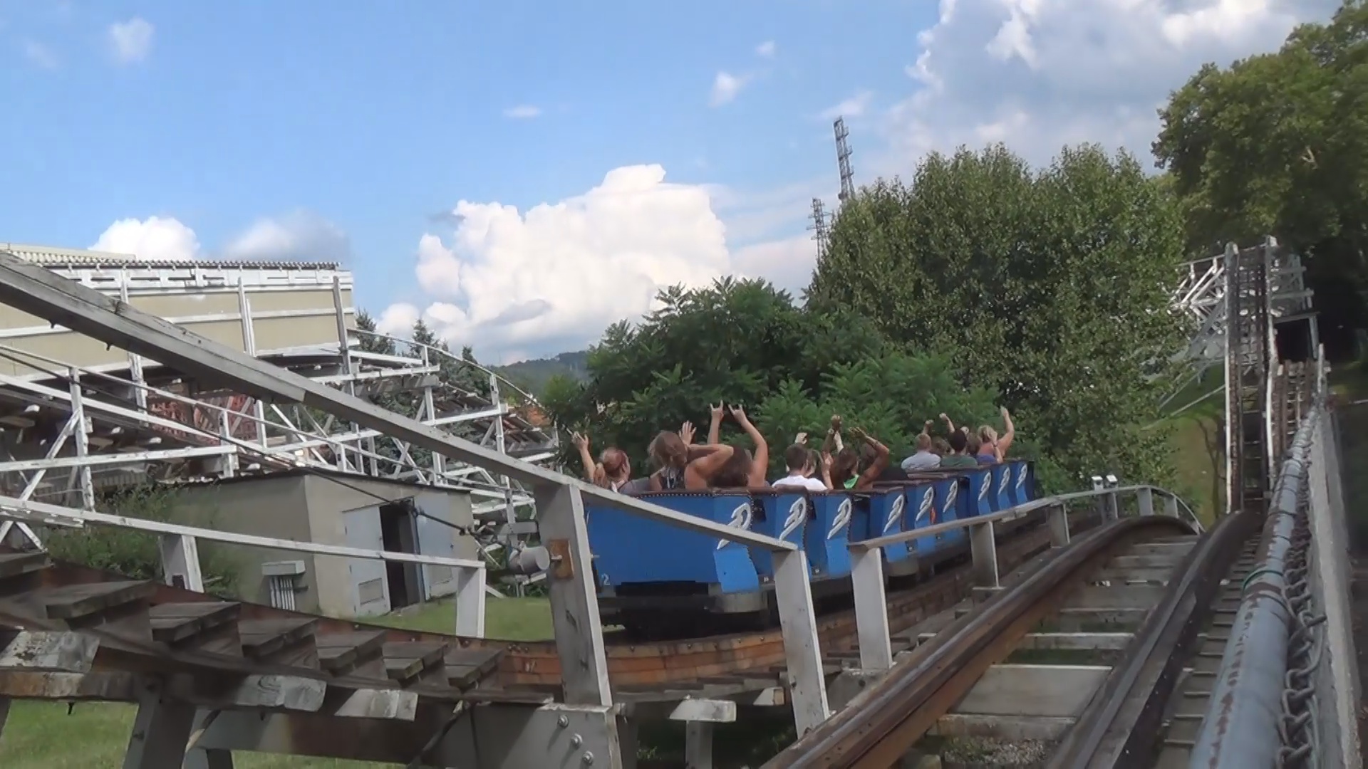 Der hölzerne Blitz jedenfalls ließ uns auch noch ein wenig warten, überzeugte uns dann aber durch seine tolle Lage mit besagtem Blick talwärts und ein sehr besonderes Layout, welches insbesondere für eine zum Zeitpunkt 90 Jahre alte Bahn mehr als spektakulär sein dürfte. Mehrere Drops in den Graben, einer davon direkt nach Stationsausfahrt, schöne Lateral-Kräfte und recht komfortable Wagen machen diese Aneinanderreihung von Rechtskurven zu einem wunderbaren Achterbahn-Erlebnis. Hier wären wir gerne nochmals eingestiegen, es bot sich aber aus zeitlichen Gründen leider auch später nicht wieder an.