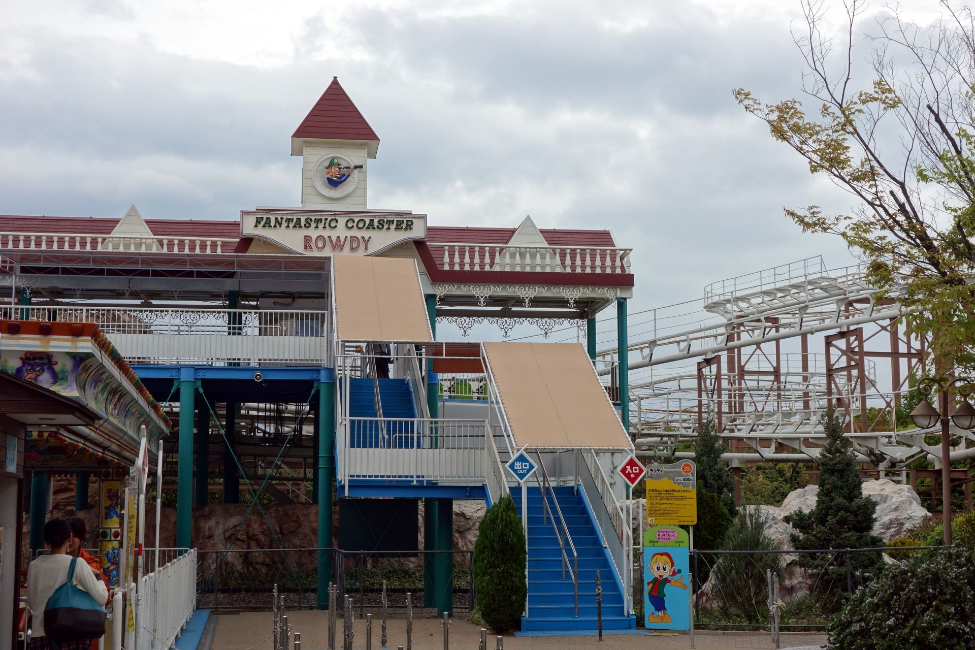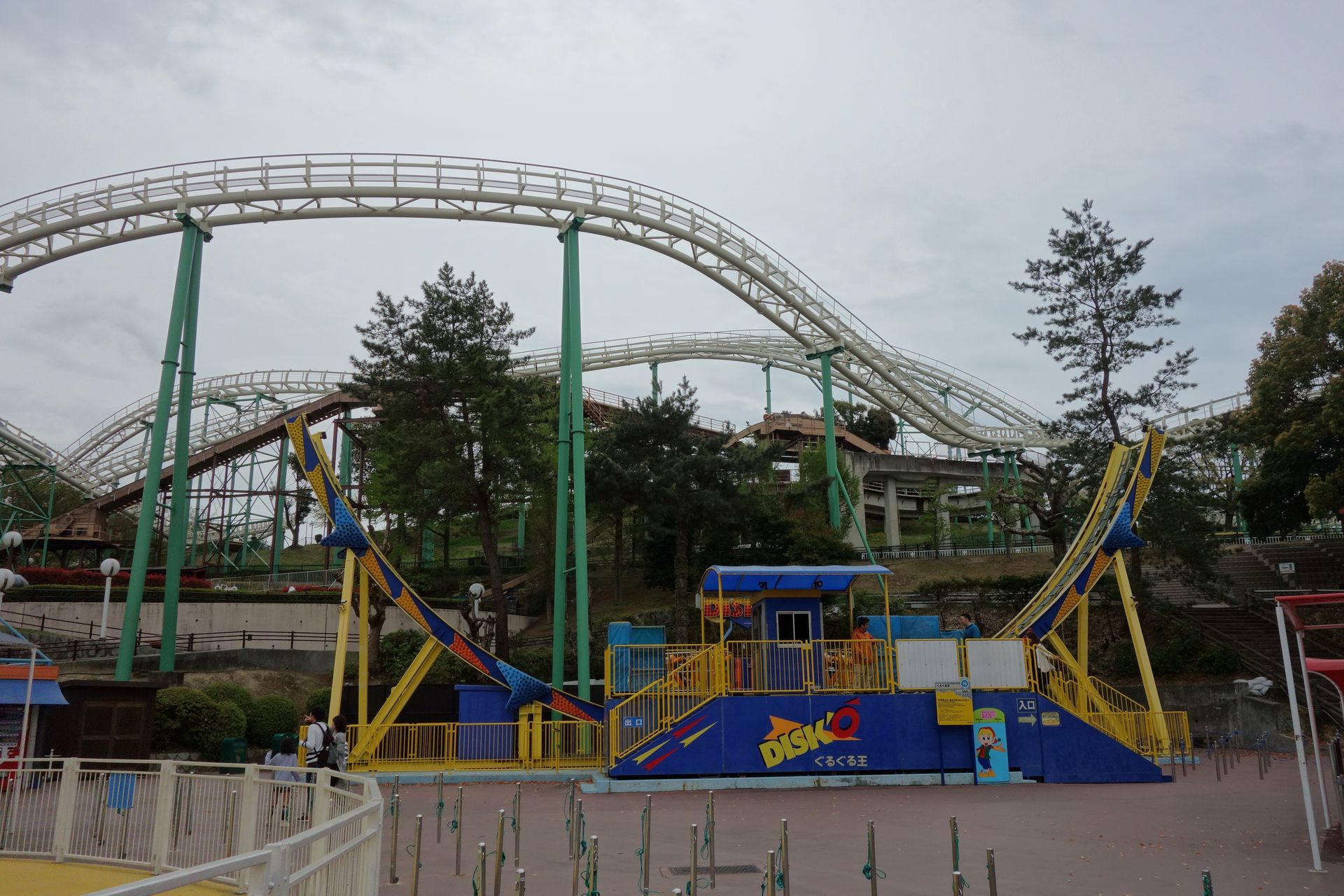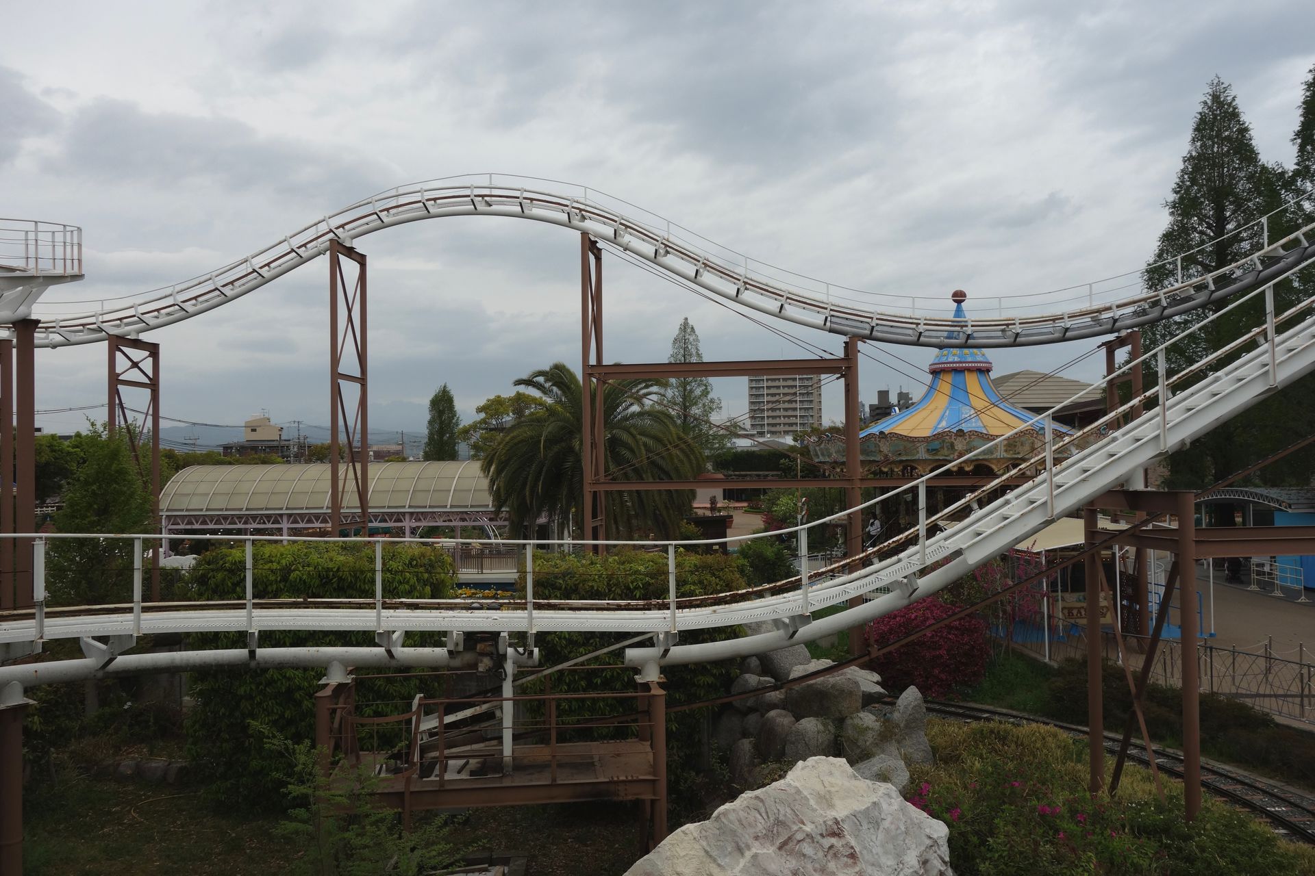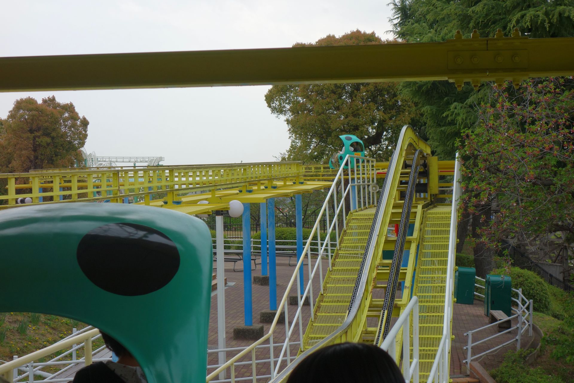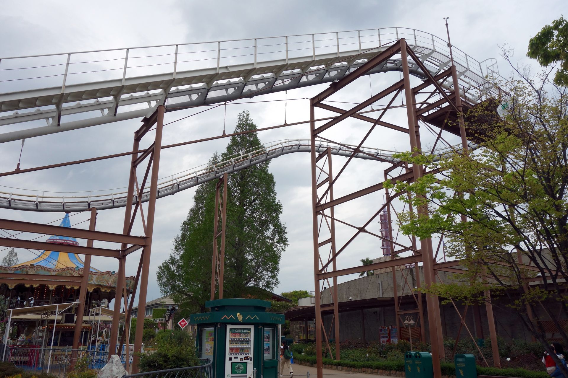 Dieser wurde ebenfalls von Senyo Kogyo erbaut, ist aber mit (von rcdb vermuteter) Eröffnung 2003 die jüngste Achterbahn im Hirakata Park. Ein Kind brauchten wir glücklicherweise nicht, der Origami-Faltkurs Klasse 1 reichte aus, damit wir uns in die Wägelchen hineinfalten konnten (ok, im Vergleich zu den hinteren Reihen des Red Falon war das Platzangebot hier doch schon fast üppig). Der Lifthill bugsierte uns mit aller ihm zur Verfügung stehender Kraft die paar Meter nach oben, dann ging es doch recht zügig durch die Kurven.