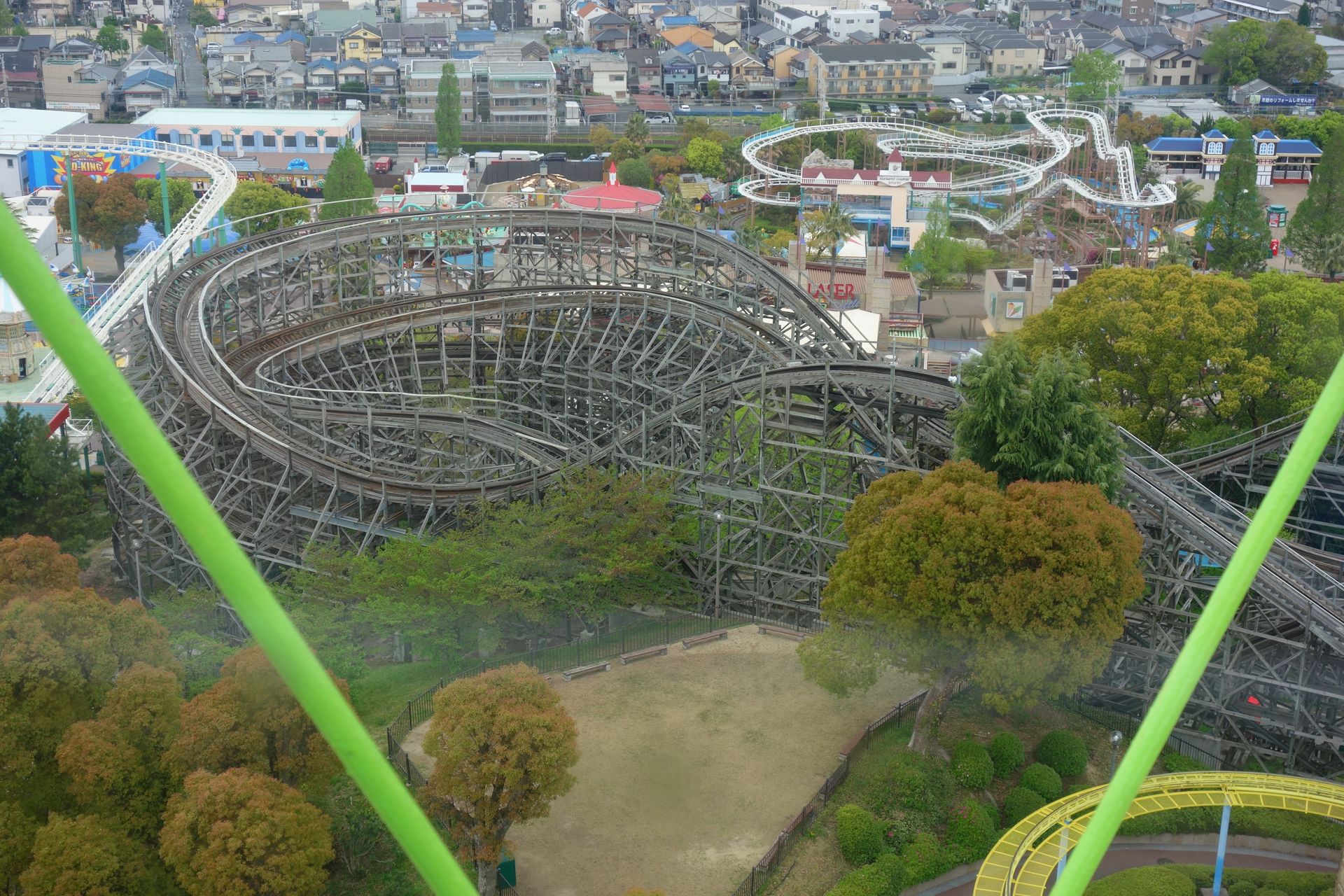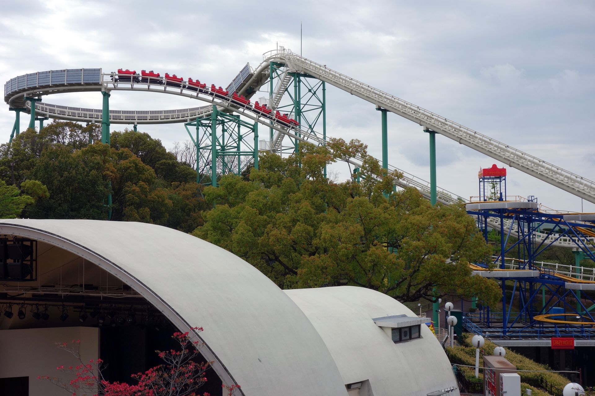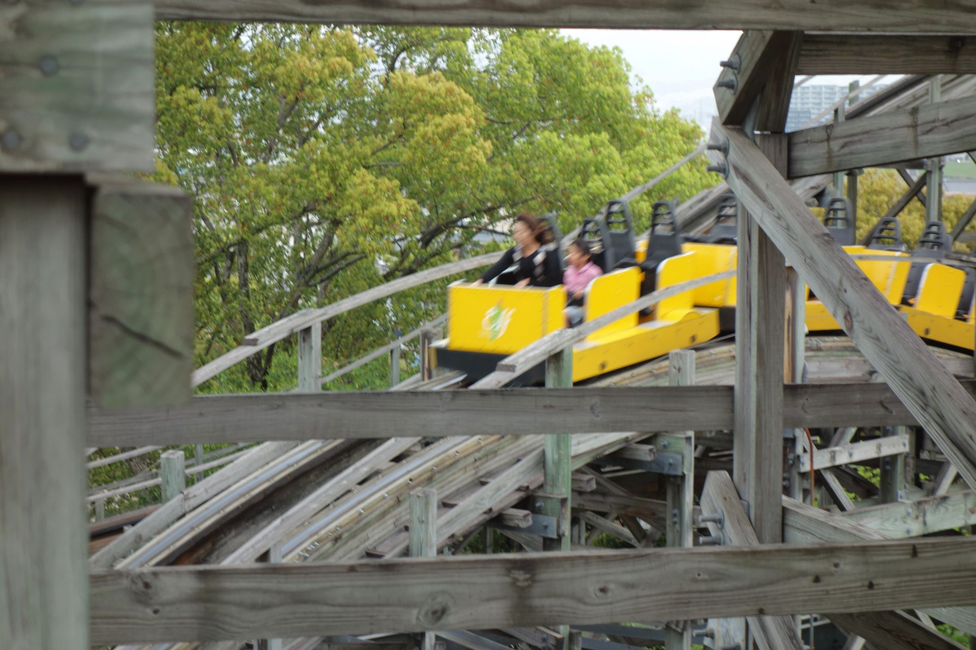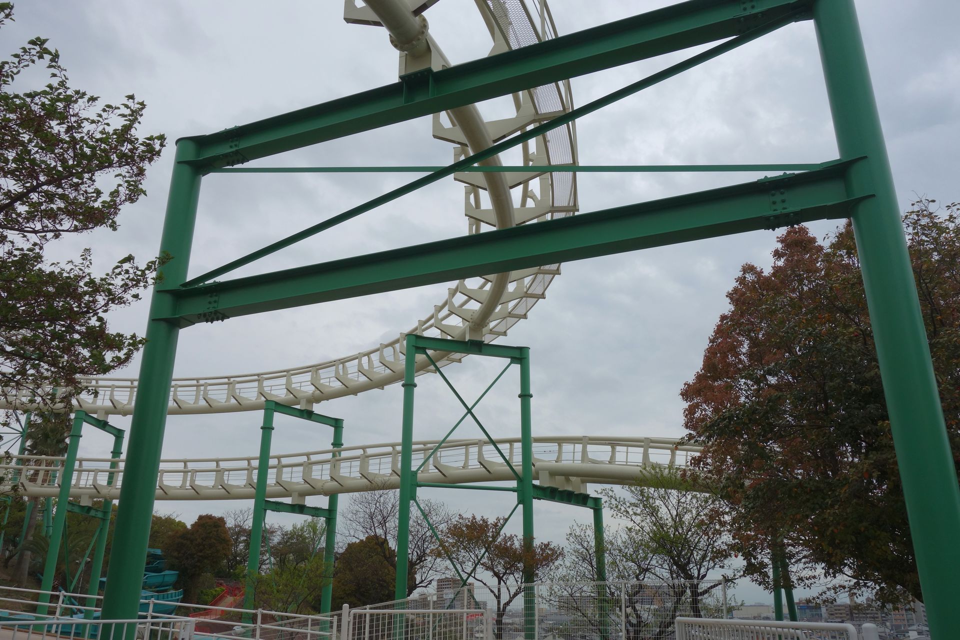 Dieser wurde ebenfalls von Senyo Kogyo erbaut, ist aber mit (von rcdb vermuteter) Eröffnung 2003 die jüngste Achterbahn im Hirakata Park. Ein Kind brauchten wir glücklicherweise nicht, der Origami-Faltkurs Klasse 1 reichte aus, damit wir uns in die Wägelchen hineinfalten konnten (ok, im Vergleich zu den hinteren Reihen des Red Falon war das Platzangebot hier doch schon fast üppig). Der Lifthill bugsierte uns mit aller ihm zur Verfügung stehender Kraft die paar Meter nach oben, dann ging es doch recht zügig durch die Kurven.