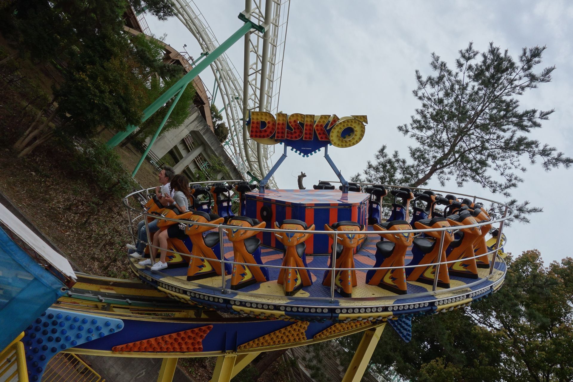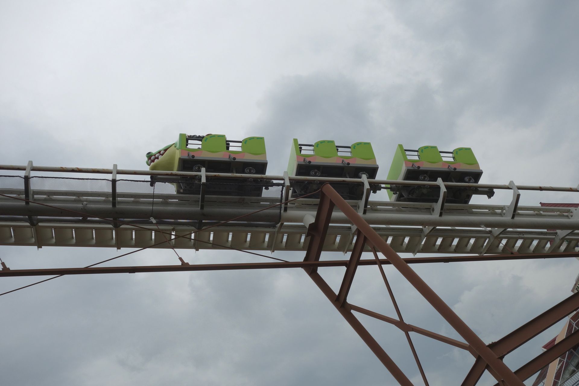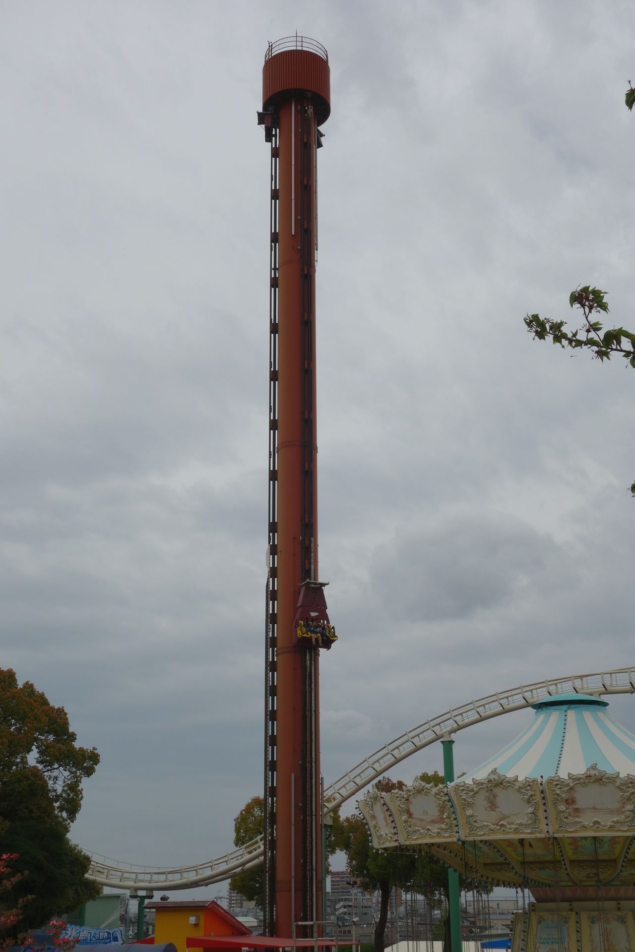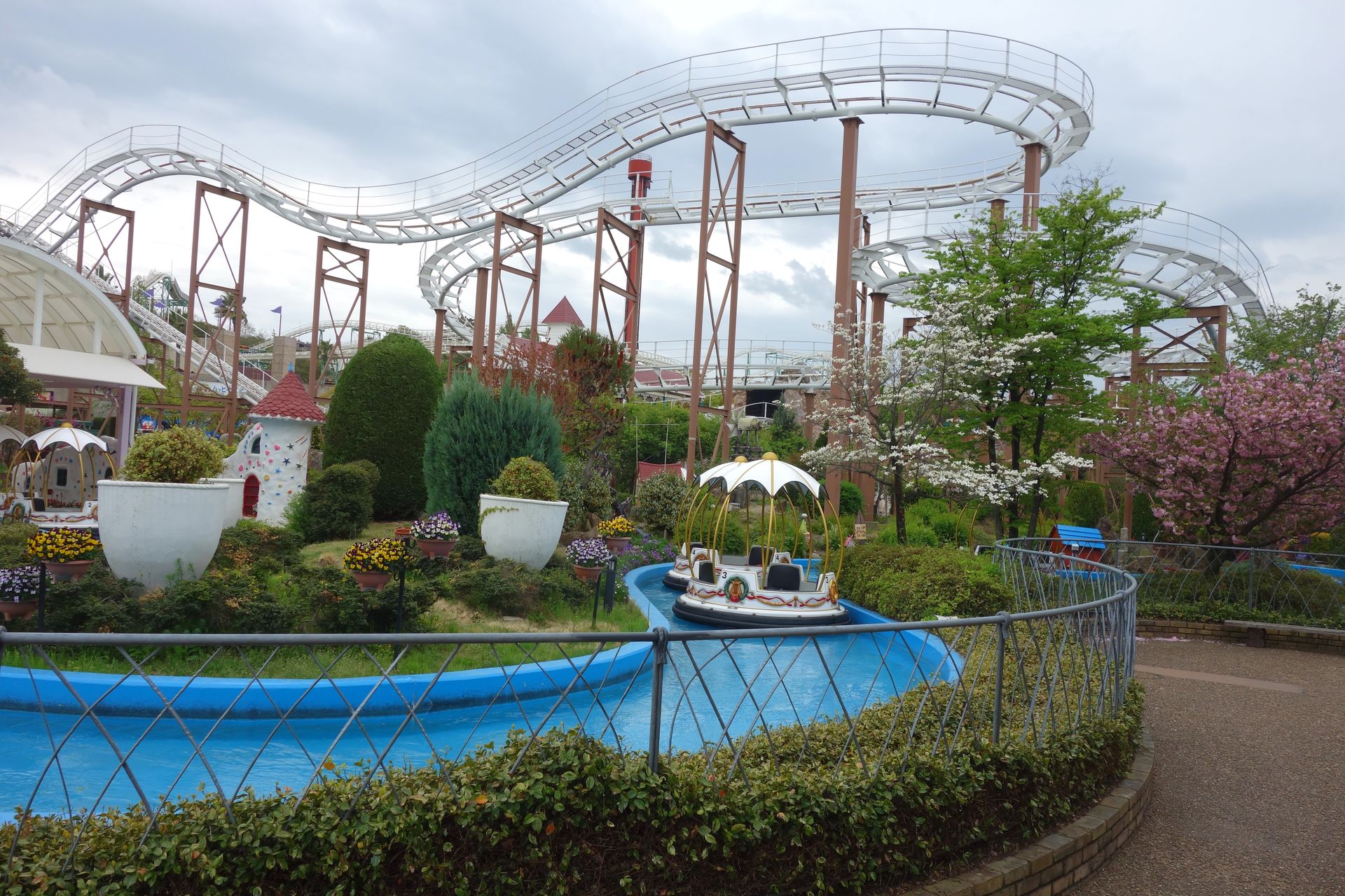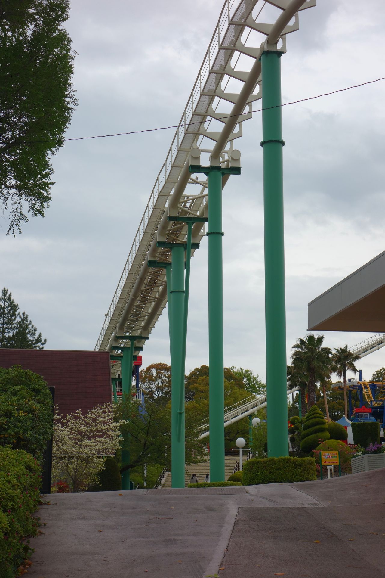 Dieser wurde ebenfalls von Senyo Kogyo erbaut, ist aber mit (von rcdb vermuteter) Eröffnung 2003 die jüngste Achterbahn im Hirakata Park. Ein Kind brauchten wir glücklicherweise nicht, der Origami-Faltkurs Klasse 1 reichte aus, damit wir uns in die Wägelchen hineinfalten konnten (ok, im Vergleich zu den hinteren Reihen des Red Falon war das Platzangebot hier doch schon fast üppig). Der Lifthill bugsierte uns mit aller ihm zur Verfügung stehender Kraft die paar Meter nach oben, dann ging es doch recht zügig durch die Kurven.