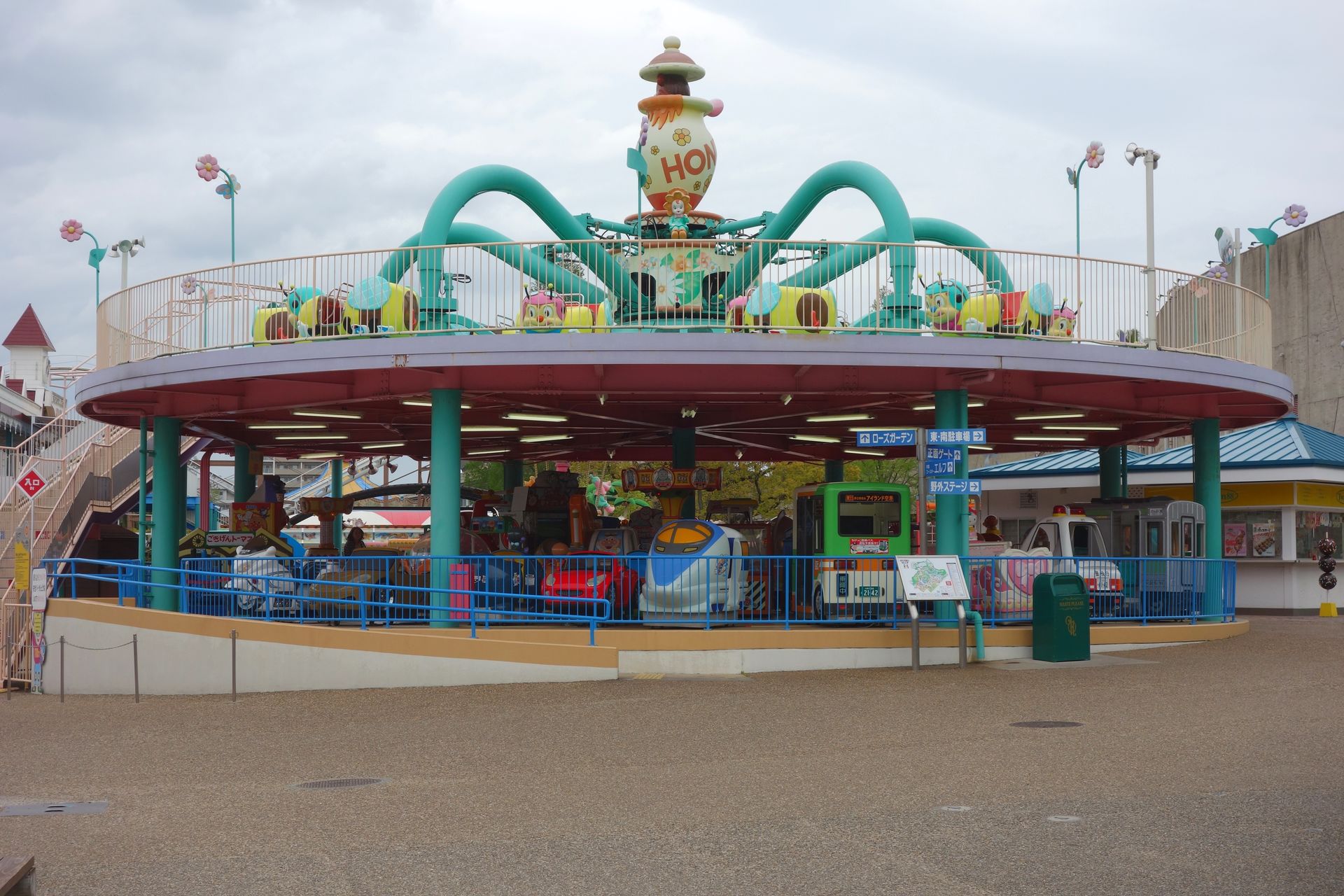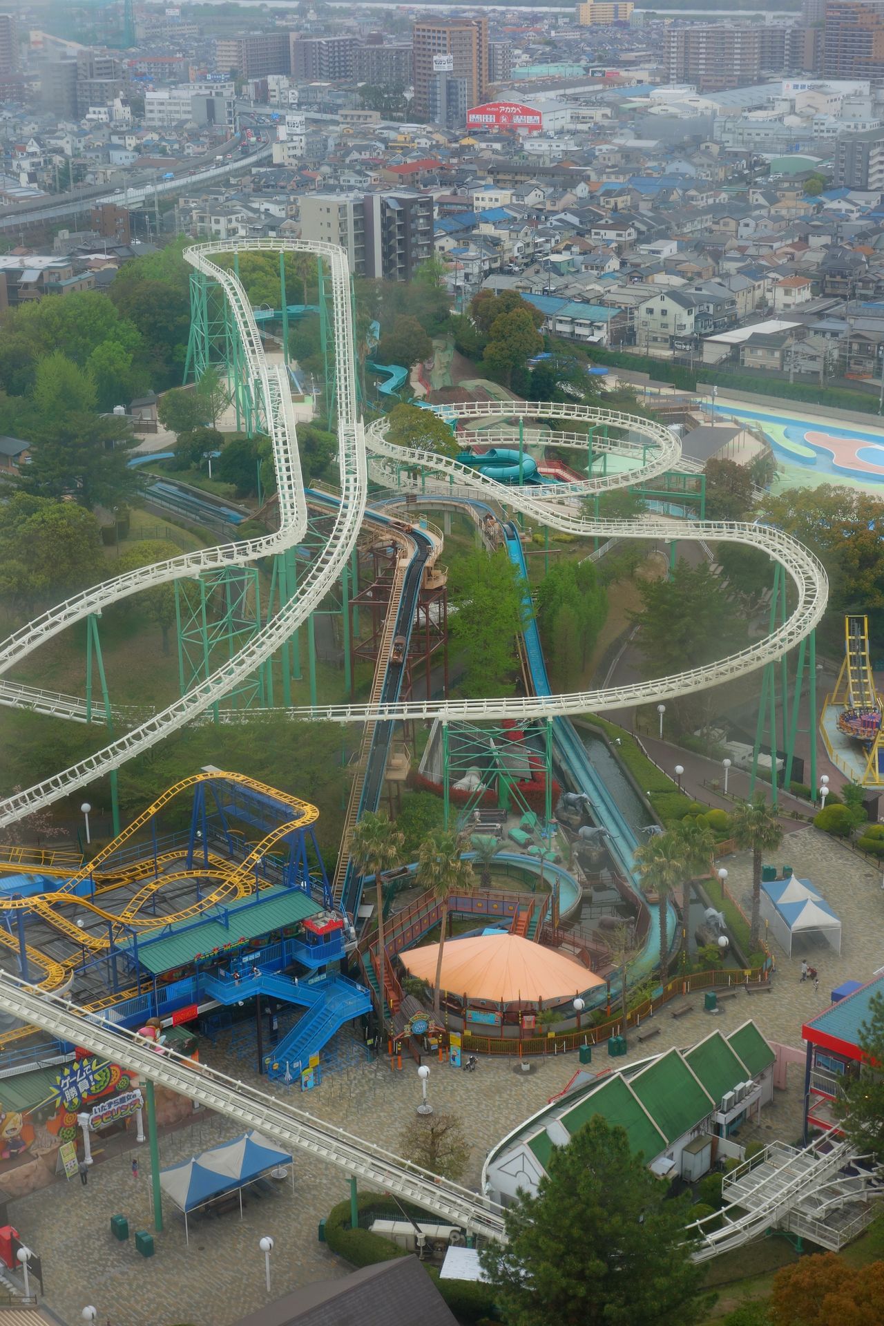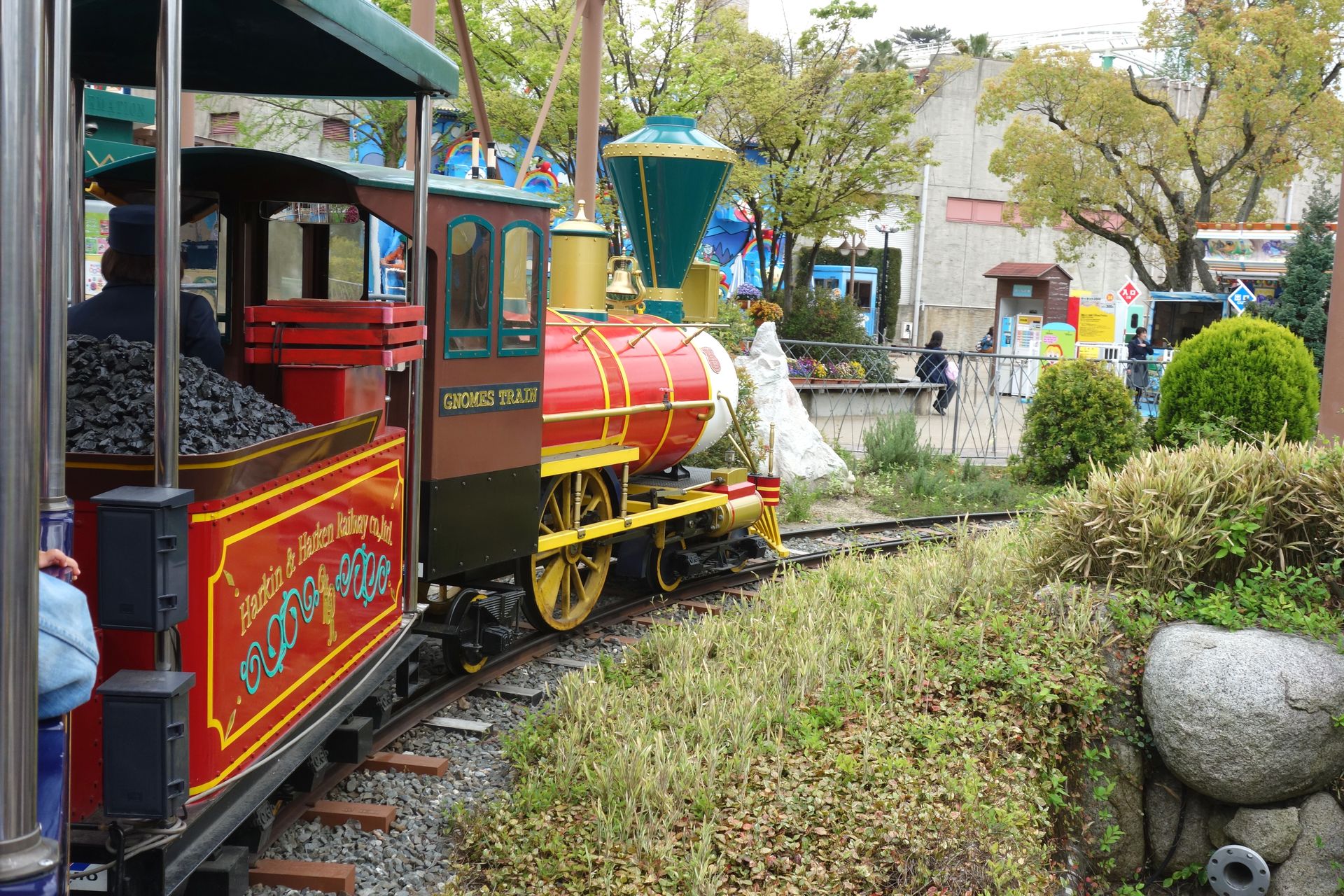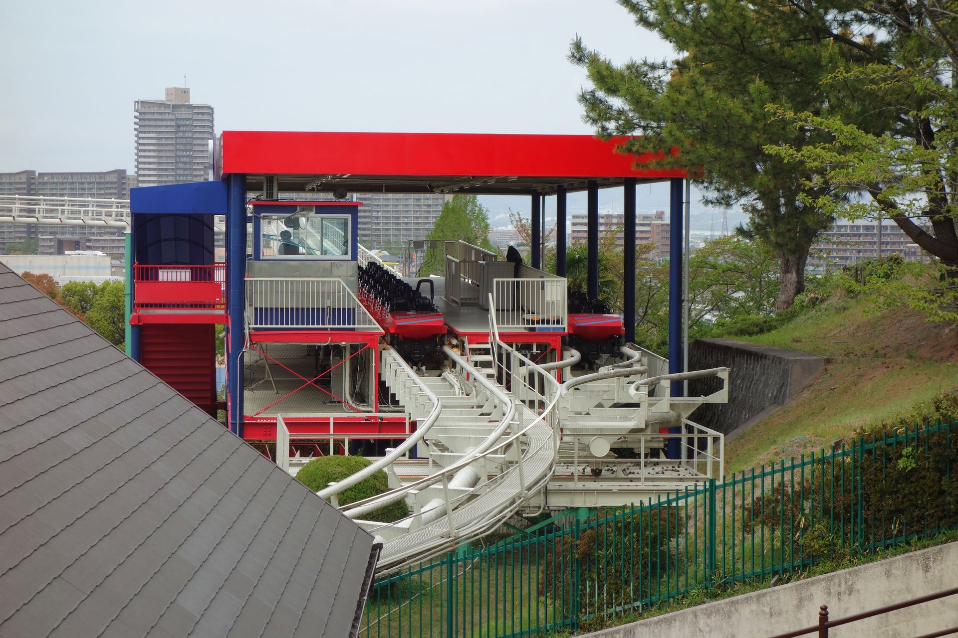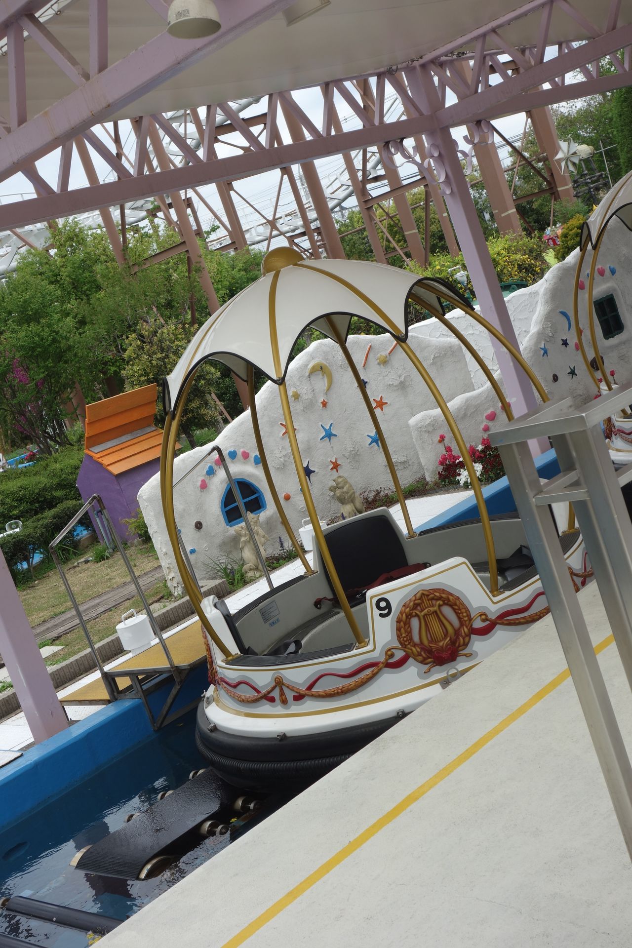 Dieser wurde ebenfalls von Senyo Kogyo erbaut, ist aber mit (von rcdb vermuteter) Eröffnung 2003 die jüngste Achterbahn im Hirakata Park. Ein Kind brauchten wir glücklicherweise nicht, der Origami-Faltkurs Klasse 1 reichte aus, damit wir uns in die Wägelchen hineinfalten konnten (ok, im Vergleich zu den hinteren Reihen des Red Falon war das Platzangebot hier doch schon fast üppig). Der Lifthill bugsierte uns mit aller ihm zur Verfügung stehender Kraft die paar Meter nach oben, dann ging es doch recht zügig durch die Kurven.