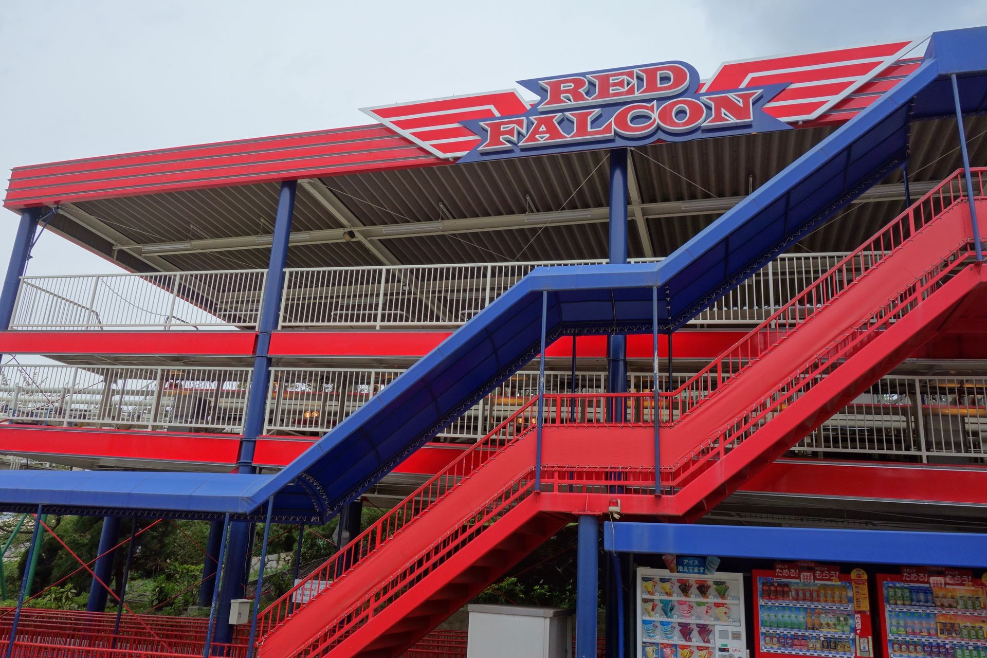 Genau wie Snoopy's Great Race in den Universal Studios wurde Red Falcon vom in Osaka beheimateten Hersteller Senyo Kogyo erbaut. Allerdings wohl schon im Jahre 1988. Gesichert wird man in den Wagen von Schulterbügeln, was angesichts der Streckenführung und dem sonstigen Wagendesign doch etwas arg übertrieben wirkt. Man sitzt so tief, dass es auch bei etwas stärkerer