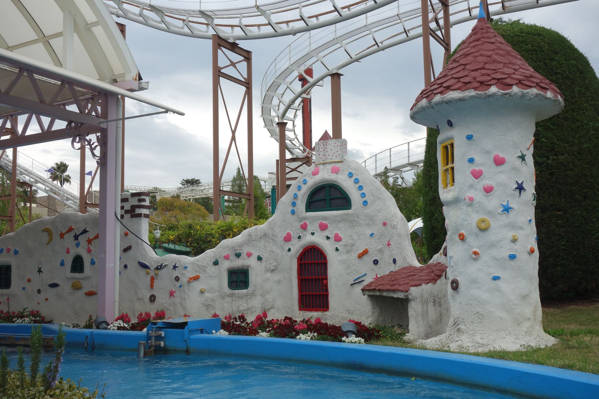 Wie man sieht, befinden sich die Parkplätze des Parks quasi auf dessen Rückseite. Natürlich hat man dort auch noch zwei weitere Eingänge. Autos waren auf den Parkplätzen allerdings nicht zu sehen, die Besucher schienen allesamt mit der Bahn angereits zu sein. Allzu viele waren das aber nicht, meistens waren wir bei unseren Fahrten alleine. Wir konnten also eigentlich überall direkt zusteigen und hatten bei den großen Achterbahnen obendrein weitestgehend freie Platzwahl. So waren wir doch schneller durch als gedacht und hatten zudem noch einige der kleineren Attraktionen mitgenommen. Die verbliebene Zeit nutzten wir nun für Wiederholungsfahrten auf der endlich warmgefahrenen Episode of Little Fairies und auch Red Falcon.