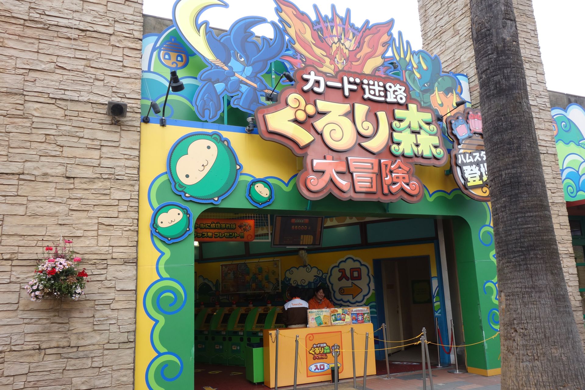 Der gezeigte Eingang gehört zu einem weiteren Walkthrough-Game. Die Mitarbeiterin am Eingang erkannte uns sofort als Ausländer und händigte uns Pappkarten mit der Spielanleitung in englischer Sprache aus. Nach kurzer Studie gaben wir zu erkennen, dass wir das Spiel verstanden hätten, worauf man uns die Spielfiguren aushändigte. Klobige Plastikkerlchen in unterschiedlichen Farben mit weit aufgerissenem Mund, der eine weiße Fläche zeigte. Mit diesen muss man durch ein wabenförmiges Labyrinth laufen, in dem hin und wieder kleine, tischhohe Säulen stehen. Auf diesen findet sich ebenfalls eine Fläche, die in einer der Farben der Spielfiguren beleuchtet ist. Passt die Farbe zur Spielfigur, stellt man diese auf besagte Fläche und eine freudige Tonfolge in Verbindung mit dem Aufblinken des Spielfigurenmundes bestätigt, dass man soeben einen Punkt gesammelt hat. Aber damit es nicht zu einfach wird, wechseln die Säulen nach einer gewissen Zeit einfach die Farbe. Mehrfach kam ich Sekundenbruchteile zu spät mit meiner grünen Figur. Und zweimal hintereinander die gleiche Säule abzuhaken, funktioniert natürlich auch nicht. Irgendwann hat man genügend Punkte beisammen und darf zum nächsten Level gehen. Dazu müsste man aber erstmal merken, dass die Figur statt des Punktesammel-Geräuschs nun eben einen entsprechenden Spruch ablässt. Und dann sollte man natürlich noch den richtigen Weg finden. Beides dauerte bei mir etwas, aber letztlich schaffte ich es dann doch. Level zwei ist im Grunde dasselbe, nur das die Wände zusätzlich verspiegelt sind, um den Schwierigkeitsgrad zu erhöhen. Hat man auch hier seine Punkte gesammelt, landet man wieder im großen Raum mit dem Eingang, wo man seine Figur auf einen der Automaten stellt. Irgendwie muss man dann ein bisschen auf Knöpfen rumdrücken, um den Endgegner zu besiegen, da habe ich aber vermutlich verloren. Dennoch spuckten die Automaten für jeden von uns je eine Sammelkarte aus. War ganz witzig, auch wenn wir Null Ahnung hatten, was wir da nun taten - oder hätten tun sollen.