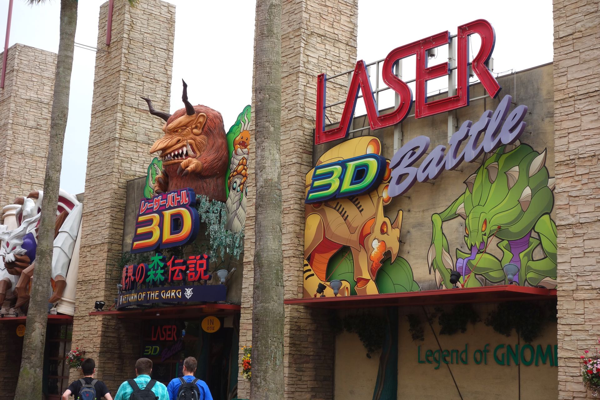Auf dem Bild leider nicht zu erkennen ist der Sitz für den "Fahrer". Quasi ein Drehhocker, damit er sich auch zur Seite drehen und mitschießen kann. Die Fahrt selbst war auf jeden Fall schön gestaltet, im Gestrüpp versteckten sich vorwiegend starre Tierfiguren, vereinzelt hat man aber auch recht simple Bewegungen eingebaut. Erschießen soll man die Tiere aber nicht, die Ziele sind kleine Aliens mit Leuchtpunkten, die sich zwischen den Tieren herumtreiben. Sah so aus, als wäre die Schießerei irgendwann mal nachträglich hinzugefügt worden. Im Anschluss führte uns der Weg quasi gegenüber wieder eine Ebene nach oben, wo man eine kleine Entertainment-Gasse geschaffen hat.