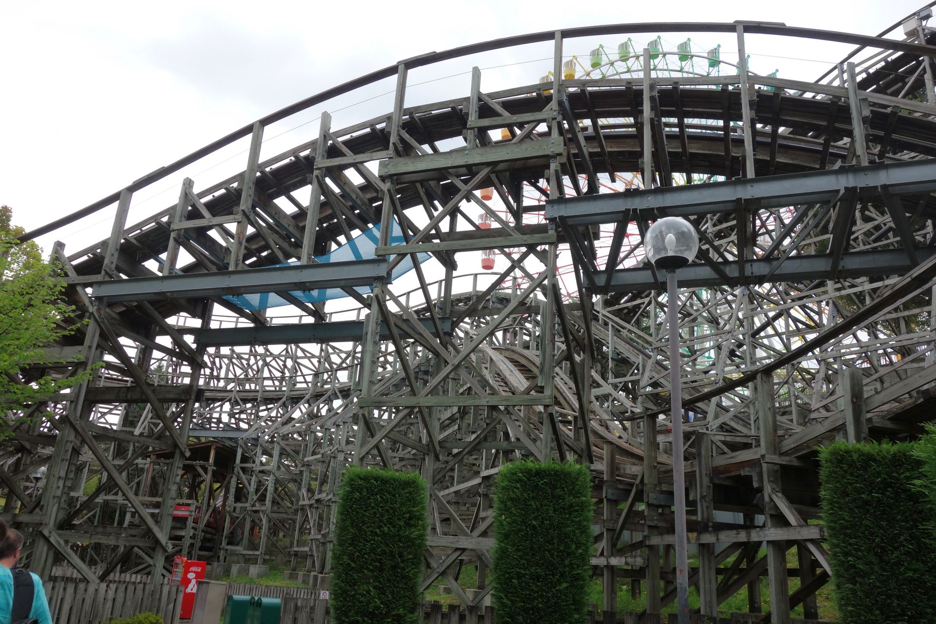 Pünktlich auf die Minute wurde der Eingang geöffnet und wir konnten mit einer Handvoll anderer Besucher eintreten. Die erste Achterbahn war nicht zu übersehen.