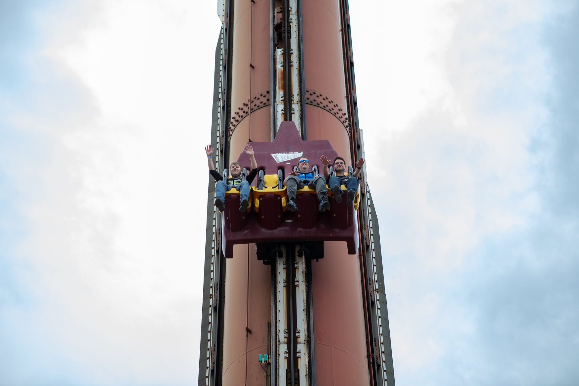 Daneben ging es im Intamin'schen Giant Drop Meteo gut 50 Meter in die Höhe, interessanterweise ohne zusätzliche Gurte an den Bügeln.