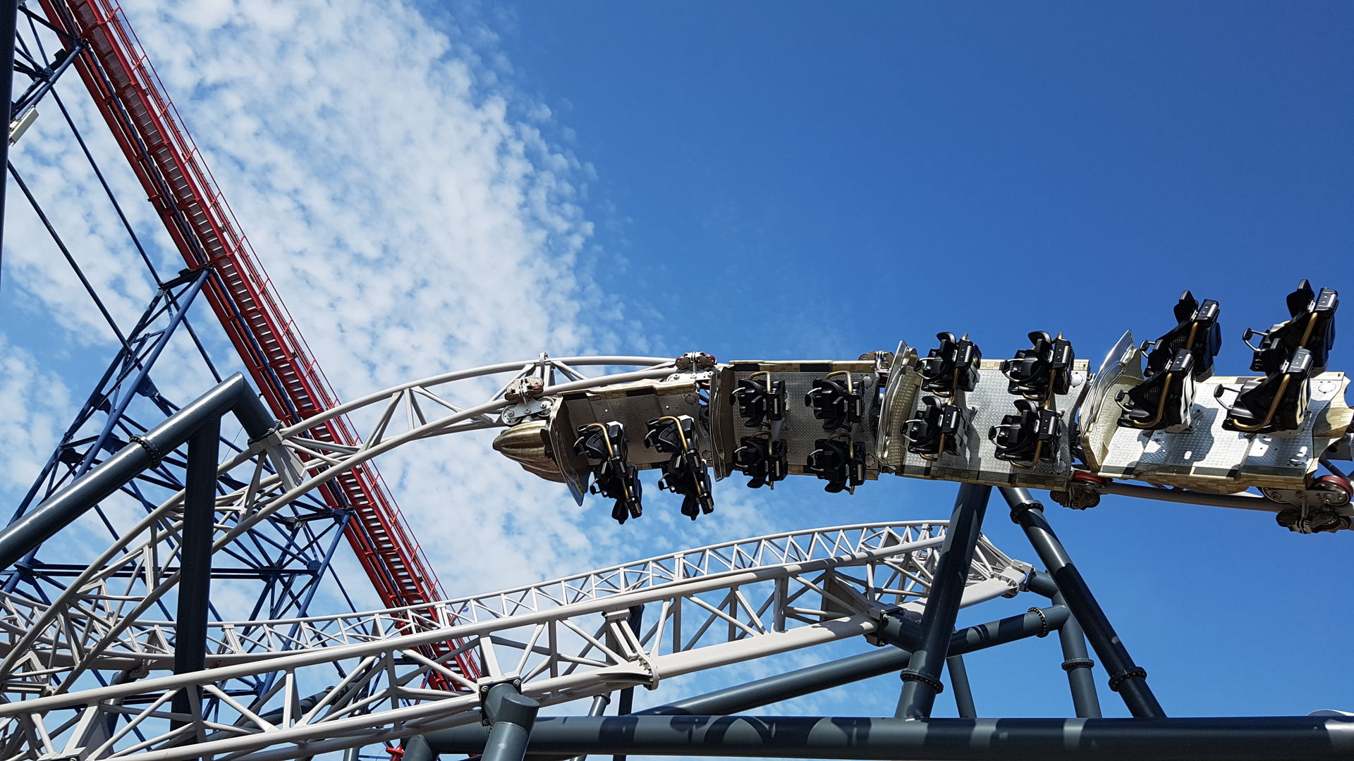 The Big One hat mich leider etwas enttäuscht. Auch wenn man aufgrund des Layouts schon nicht allzu viel (Airtime beispielsweise) erwarten konnte, hatte ich mir doch etwas mehr erhofft. Lediglich der First Drop, den ich mir tatsächlich etwas mehr GeForce-ähnlicher vorgestellt hatte, brachte bei mir etwas Adrenalin in die Sache. Meine erste Fahrt war im letzten Wagen und dieser hat bekanntermaßen bei den Abfahrten etwas mehr Geschwindigkeit am Scheitelpunkt, als der vordere Teil des Zuges. Dies führte dazu, dass man in der Kurve im First Drop doch ganz schön ordentlich zur Seite gewirbelt wird. Das hatte ich so nicht erwartet und war schon mal ein gelungener Auftakt. Der Schlussteil bei Steeplechase mit den kleineren Hügeln und der Helix war auch absolut gut fahrbar und spaßig. Der Zwischenteil ist allerdings wahrlich eher Aussichtsfahrt, denn waschechter Hyper-Coaster. Besonders auf den Achsen musste man schon ziemlich auf seinen Rücken Acht geben. Aber mit der bewährten Po-nach-hinten-raus-streck-Taktik, bei der der Rücken keinen Kontakt zum Sitz hat, war die Bahn auch gut fahrbar. Nicht sanft, aber sie ist ja auch nicht mehr die allerjüngste.