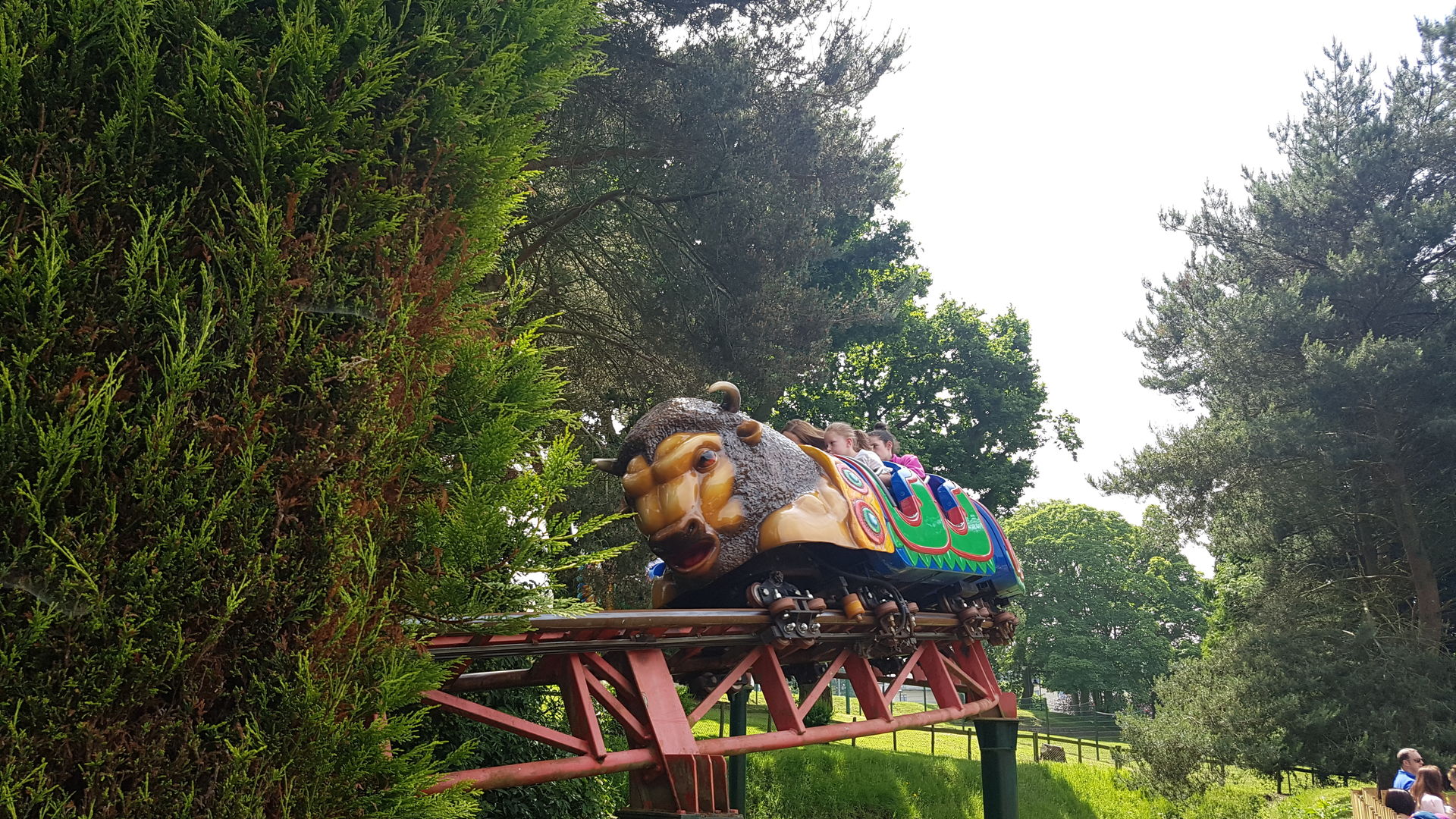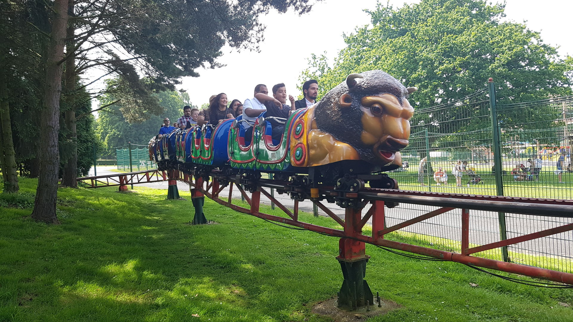 Ja, wir stehen am Ende Warteschlange für den Kiddie Coaster links im Bild